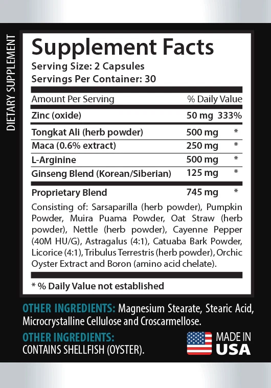 "Make My PEpPEr Big" Male Enhancement Formula Extra Strength. Dietary Supplement Tongkat Ali, Maca, L-Arginine, Ginseng Blend Tongkat Ali Powder - "Make My PEpPEr Big" - Best Sex - 60 Tablets B ene fits Increases energy, stamina, and endurance. Increases sex drive with better, longer lasting, and more satisfying sex. Improves body tone, eliminates excess body fat, and increase musculature. Promotes hormonal balancing. Accelerates wound healing. Dramatically increases the immune function. Slows down and the aging process. Tongkat Ali: Tongkat ali, also known as pasak bumi or longjack, is a root traditionally used in Southeast Asia to increase libido and sexual performance. Tongkat ali is thought to work by naturally increasing free testosterone level. Other reported effects include decreased body fat, increased muscle mass, increased energy, enhanced immune system and mental clarity. For centuries, people of Malaysia, Indonesia and Thailand have used the Tongkat ali LONGJACK root as a powerful aphrodisiac and the powder of this root is still widely used in these countries today. This is a sought after supplement for athletes and bodybuilders due to its ability to increase testosterone in the blood by releasing metabolically inactive testosterone from binding proteins. Unbound or free testosterone typically makes up only about 2% of the testosterone in the bloodstream, so even minor changes in free testosterone levels can have a profound impact. Testosterone is one of the most important hormones in both men and women's bodies. Benefits of tongkat ali for men could include: increased libido and sexual performance, longer harder erections, increased muscle mass and muscle tone, reduced body fat and increased sperm count. Tribulus Terrestris: Tribulus Terrestris is a fruit-producing Mediterranean plant that's covered with spines. It is also called puncture vine. People use the fruit, leaf, or root of the tribulus plant as medicine. Over the years, people have taken tribulus to enhance athletic performance and for a wide range of health issues that may include: heart health, circulatory conditions and sexual issues both in men and women. It has a long history of use in traditional Chinese medicine and Indian Ayurvedic practice. Body builders use it after a cycle of anabolic steroids to restore testosterone levels in the body. Tribulus is used to increase levels of testosterone and to increase sex drive and performance. Tribulus Terrestris helps to increase the body's natural testosterone levels and thereby improve male sexual performance and help build muscle. Its purported muscle-building potential was popularized by American IFBB bodybuilding champion Jeffrey Petermann in the early 1970s. Tribulus is used for kidney problems, including kidney stones, painful urination, a kidney disorder called Bright’s disease, and as a “water pill” (diuretic) to increase urination; for skin disorders, including eczema (atopic dermatitis), psoriasis, and scabies; for male sexual problems, including ED, involuntary release of semen without orgasm (spermatorrhea), and to increase sexual desire; for heart and circulatory system problems, including chest pain, high blood pressure, high cholesterol, and “tired blood” (anemia); for problems with digestion, including colic, intestinal gas (flatulence), constipation, and to expel intestinal parasitic worms; for pain and swelling (inflammation) of the tissue lining the mouth (stomatitis) and sore throat. Maca : Maca is a nutritionally dense super-food that contains high amounts of minerals, vitamins, enzymes and all of the essential amino acids. Maca root is rich in B-vitamins, which are the energy vitamins, and maca is a vegetarian source of B-12. To boot, maca has high levels of bioavailable calcium and magnesium and is great for remineralization. Maca root helps balance our hormones and due to an overabundance of environmental estrogens, most people's hormones are a bit out of whack. Maca stimulates and nourishes the hypothalamus and pituitary glands which are the "master glands" of the body. These glands actually regulate the other glands, so when in balance they can bring balance to the adrenal, thyroid, pancreas, ovarian and testicular glands. L-arginine: L-arginine is an amino acid functioning as a building block of proteins. Your body produces L-arginine and it plays a significant role in multiple areas of your physiology and metabolism. L-arginine is an amino acid in supplement form and obtained naturally in the diet. L-arginine-rich foods include plant and animal proteins, such as dairy products, meat, poultry, fish, and nuts. In addition, L-arginine is used to make nitric oxide (a compound that relaxes the blood vessels). Although some studies suggest that L-arginine may benefit certain health conditions. Red Ginseng : The benefits of Ginseng have been felt for thousands of years. Korean ginseng is one of the most widely used Chinese Medicines and is consistently rated as the number one most respected Asian herb. Although many have regarded ginseng benefits. It is more precisely - a natural supplement - with many positive benefits for the body. Major studies have shown that Korean ginseng - Asian panax ginseng roots grown in the Korean peninsula, where ginseng naturally evolved, when grown for six years to full maturity, will support: Healthy blood circulation by supporting healthy cardiovascular systems, ginseng supports blood circulation, beneficial not only to athletes, but also those who sit at desks for long periods, and those who sometimes feel cold in their fingertips. Good Moo, Unlike Coffee, Korean ginseng is caffeine-free. But like coffee, it does help boost mood, especially mental energy. Whereas caffeine and coffee stress the body, but rather is a naturally adaptogenic herb, which supports relaxation and supports a feeling of calm. Combined with vitamins and minerals, Ginseng is well-known to boost mood and Korean ginseng tea is often