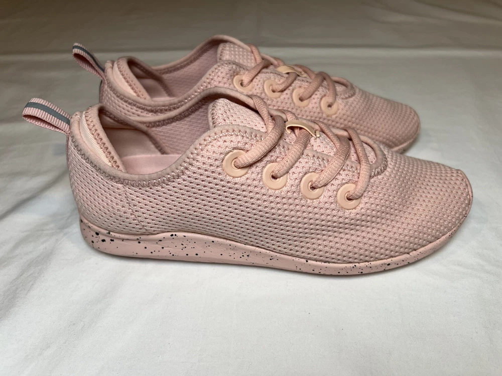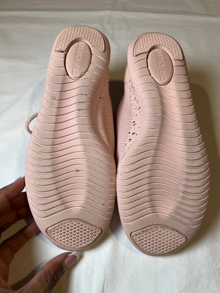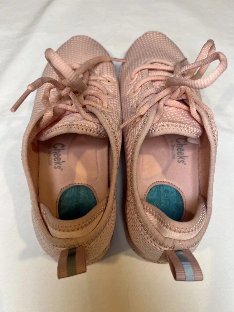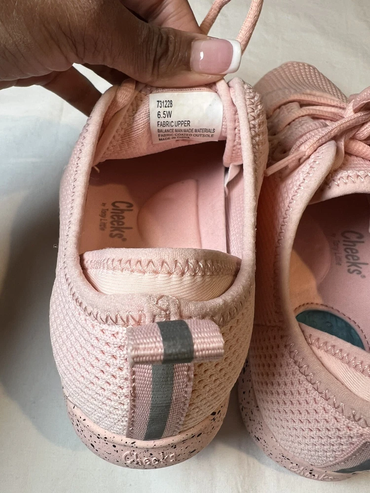 These are Tony Little Cheeks Sneakaway trainers for women in size 6.5W. They come in a peach color with a gel insole for added comfort. The sneakers feature a fabric upper material and are designed for casual wear, making them stylish and comfortable for everyday use. CONDITION: shoes are pre-owned in excellent condition with no stains or signs of damage.