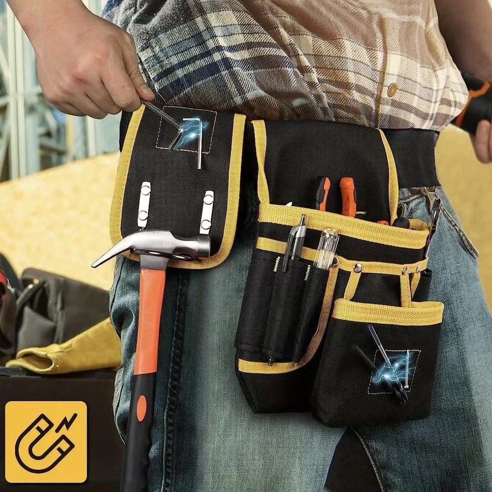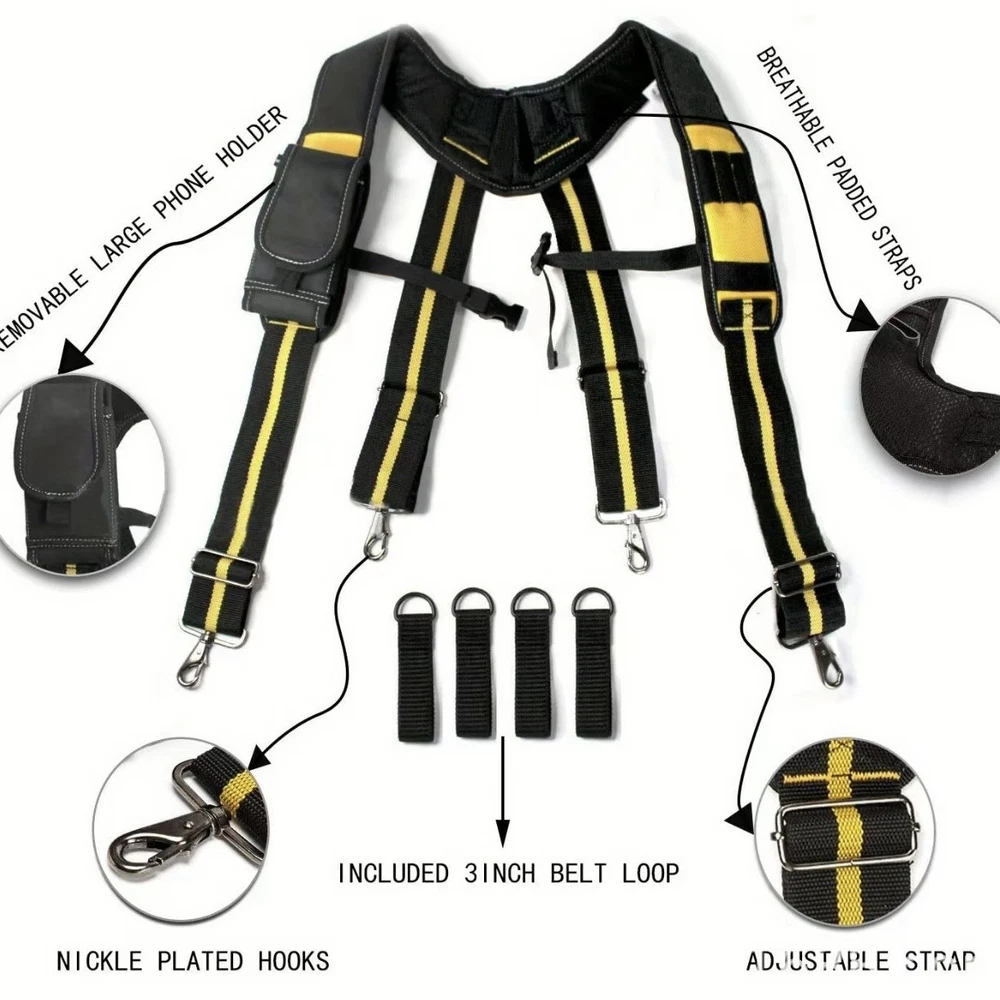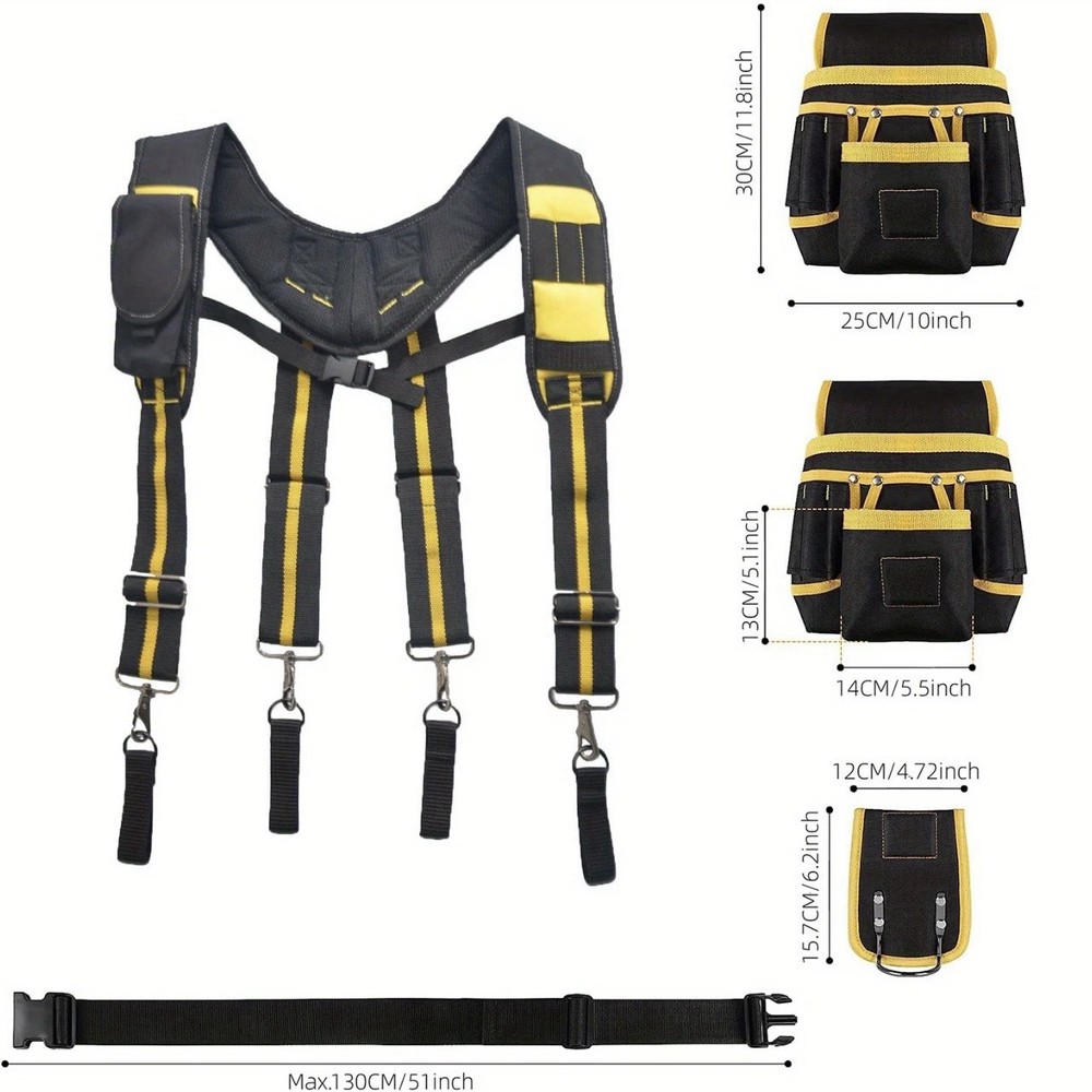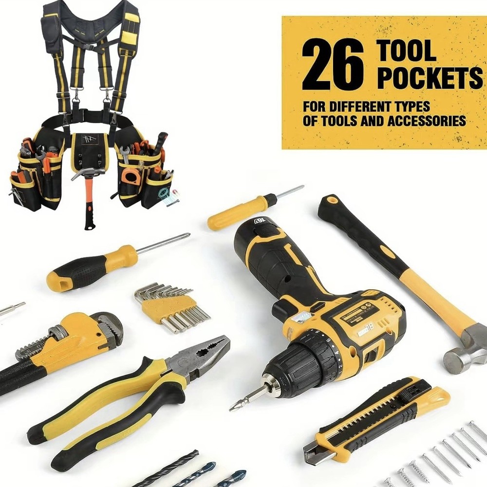 Versatile Tool Belt Organizer with Shoulder Straps: Ideal for Electricians, Carpenters, and Construction Workers This versatile tool belt organizer, equipped with shoulder straps, is the perfect choice for electricians, carpenters, and construction workers. Its unique design combines practicality and comfort, making your work more efficient and effortless. Core Features: • Magnetic Tool Pouches: Built-in strong magnets securely hold metal tools, preventing them from slipping or getting lost, thereby enhancing work efficiency. • 26-Pocket Design: The abundant pocket layout provides ample storage space for various sizes of tools, from screwdrivers and wrenches to measuring tools, ensuring easy access and organization. • Shoulder Strap Design: The adjustable shoulder straps distribute the weight of the tools, reducing pressure on your waist and ensuring comfort even during long periods of wear. The straps can also be easily detached to meet the needs of different work scenarios. • Detachable and Adjustable Tool Pouches: The tool pouches can be independently detached, allowing you to flexibly adjust the types and quantities of tools you carry based on work requirements. The size of the pouches can also be fine-tuned with adjustable buckles to ensure a snug fit against your body, without interfering with your work movements. • Durable Material: Made from hiah-aualitv. wear-resistant