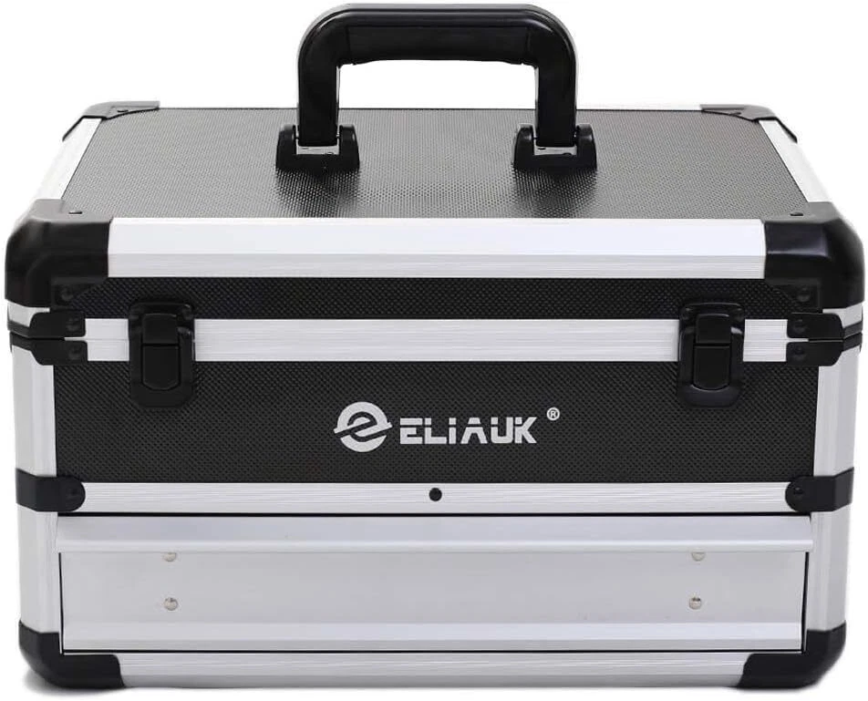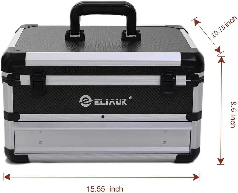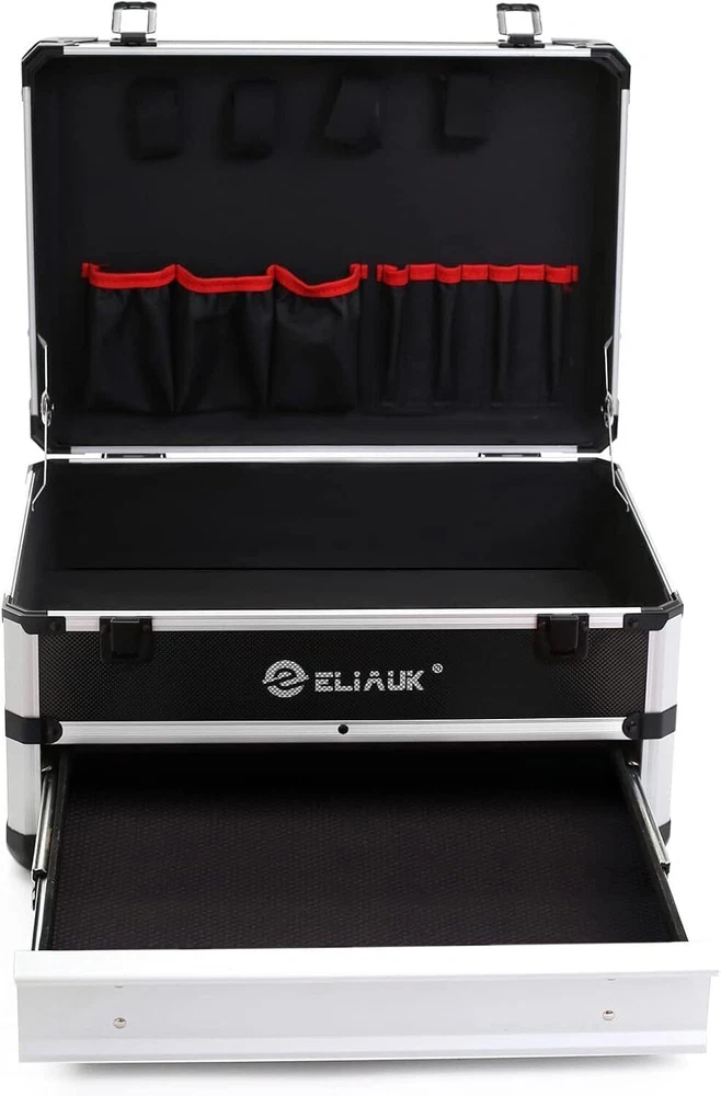 Material Aluminum Color Silver Product Dimensions 15.6"L x 10.8"W x 8.6"H Maximum Weight Recommendation 50 Pounds About this item DRAWER TOOLBOX - The overall exterior dimensions are 15.55 inches long x 10.75 inches wide x 8.6 inches high with one drawer and one top flip-top storage compartment, providing plenty of space for a variety of tools. Equipped with reliable bearing slide drawers - drawer internal dimensions 12.5x9.6x1.9in Widely used - portable toolbox with plenty of storage space, perfect for home, office, garage, car, warehouse, workplace and more. Convenient design - Comfortable handle on top for easy carrying. Material Aluminum Color Silver Product Dimensions 15.6"L x 10.8"W x 8.6"H Maximum Weight Recommendation 50 Pounds Number of Compartments 11 UPC 783911894158 Capacity 30 Pounds