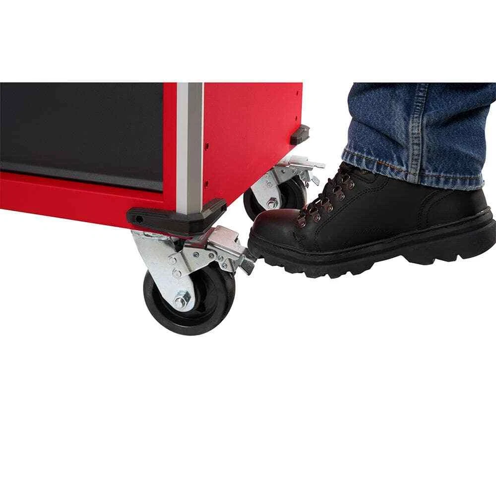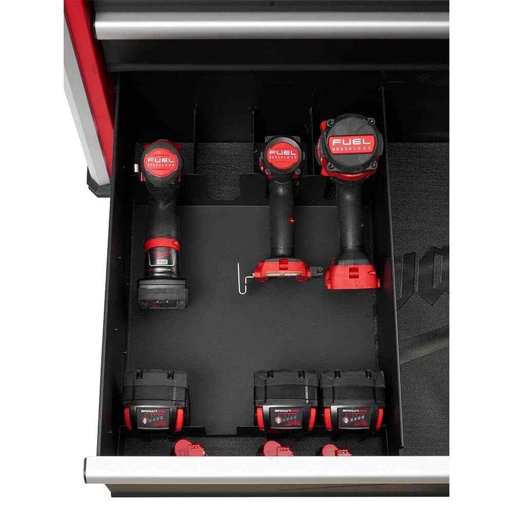 Angle Iron Reinforced Frame for Superior Durability 100lbs Rated Soft-Close Drawers for Smooth Opening & Closing 18Ga Steel Construction & 5" Industrial-Grade Casters The 22 in. D Milwaukee 36 in. 5-Drawer Tool Cabinet boasts a large 15,274 cu. in. of storage capacity and can hold 1,800 lbs. The rolling cabinet features a 4.5 in. D top drawer to easily access your deep socket sets and a 9.5 in. D bottom drawer with a removable power tool organizer, for easy management of your various power tools and battery packs. Mount your Milwaukee battery chargers to the side wall and charge your batteries with the built-in, 6-outlet/2USB power center. The 100 lbs. rated, soft-close, ball bearing drawer slides gently retain the drawers from accidental opening or slamming shut. This tool box also includes a Milwaukee stainless steel bottle opener and stylish aluminum edge guards with rubber corner bumpers to help protect your investment. The red and black textured finish is rugged, durable, and stands up to harsh environments. Combine with the Milwaukee 36 in. 7-Drawer Tool Chest, model# 48-22-8538 for a total storage capacity of 27,326 cu. in. Drawer dimensions: Top drawer 31.4 in. W x 19.8 in. D x 4.5 in. H, (2) drawers 31.4 in. W x 19.8 in. D x 2.9 in. H, (1) drawer 31.4 in. W x 19.8 in. D x 4.7 in. H, (1) drawer 31.4 in. W x 19.8 in. D x 9.4 in. H 100 lbs. rated, soft-close ball bearing slides for smooth drawer operation Deep bottom cabinet drawer has double drawer slides, offering a 200 lbs. load capacity Reinforced 6-Gauge angle iron cabinet base and 18-Gauge steel frame 6-outlet/2USB power strip mounted on exterior cabinet side wall, cord hooks included to wrap the power cords for storage 1 push-bar side handle with a knurled finish can be mounted on either the left or right side of the cabinet 5 in. x 2 in. industrial-grade casters (2 swivel with top pedal brake and 2 fixed casters) for ease of mobility Secure your tools with the barrel key locking system Includes pre-cut, premium PVC solid drawer liners to keep your tools in place Stainless steel bottle opener for popping open a refreshing, cold beverage after a long days work Rubber corner bumpers and aluminum edge guards help protect from accidental damage Assembled dimensions with handles and casters installed (approximate): 39.1 in. W x 22.1 in. D x 37.7 in. H and weighs 234 lbs. Cabinet carton is approximately 39.6 in. W x 26.4 in D x 33.9 in. H and 255 lbs. Some assembly required: attach casters, handle, and corner guards Disclaimer: tools and accessories shown in photos are not included with purchase