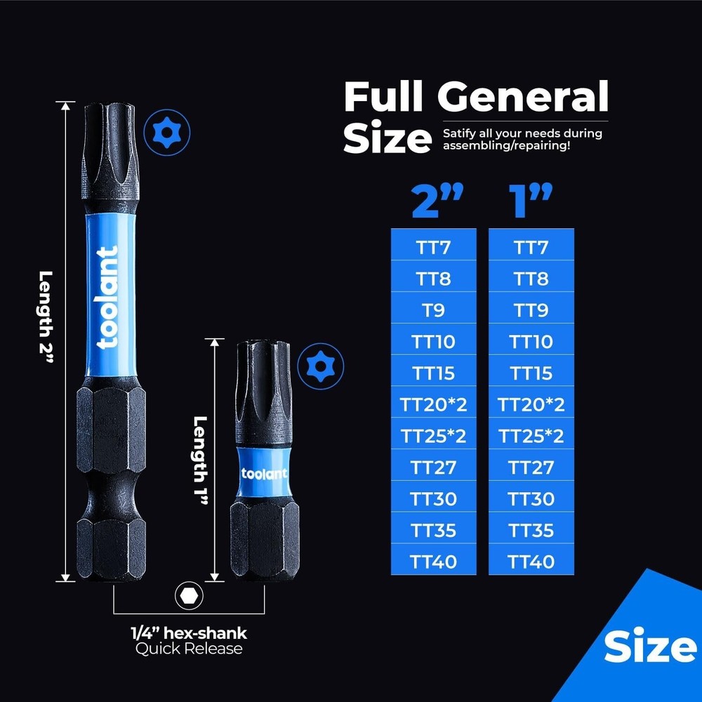 oolant Impact Torx Bit Set 27pcs (TT7-TT40), S2 Steel Security Torx Bit Set, Tamper Proof Star Bit Set with CNC Machined Tips, 1"&2" Long Impact Bits with Magnetic Bit Holder and Storage Box Item Description toolant impact security torx bit set 26+1pcs. Torsion zone to absorb torque peaks to avoid breakage. 10 times life expectancy versus standard bits. For impact driver, drill and screwdriver. 2” tamper proof torx bits 13pcs (tt7, tt8, tt9, tt10, tt15, tt20*2, tt25*2, tt27, tt30, tt35, tt40), 1” tamper proof torx bits 13pcs (tt7, tt8, tt9, tt10, tt15, tt20*2, tt25*2, tt27, tt30, tt35, tt40), 3” magnetic impact bit holder for tight space screw driving. CNC machined tips, S2 alloy steel body, hardened core to increase bit strength and reduce fracture. Manganese Phosphate surface to prevent rust. Strengthened magnetic impact torx bits helps you easy pick up screws. The magnetism doesn’t decay after multiple uses. (The 1” bits are not magnetic by themselves but only when connected with the magnetic bit bolder) Widely used in home repairs, automobiles, woodworking and other screw driving applications. All day after-sale service. Thanks for choosing toolant. › See more product details Payment We accept payment only through PAYPAL Shipping We ship products worldwide through standard express courier service, it will reach within 7 to 10 days to abroad buyers, we ship the product after recieved clear payment and give full information about shipment to the buyer Return We accept product return within 7 to 21 days from delivery date but product should be in original position and not in damaged condition,the return shipping charges will be buyer responsibility