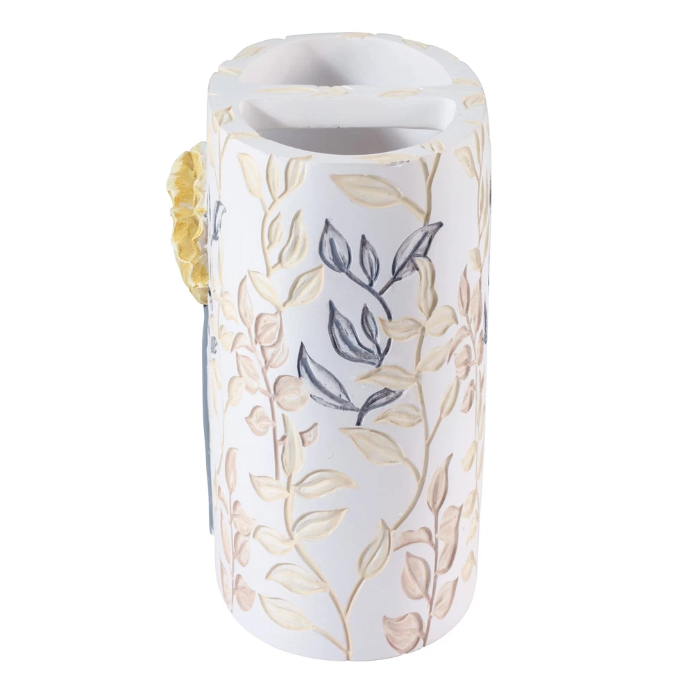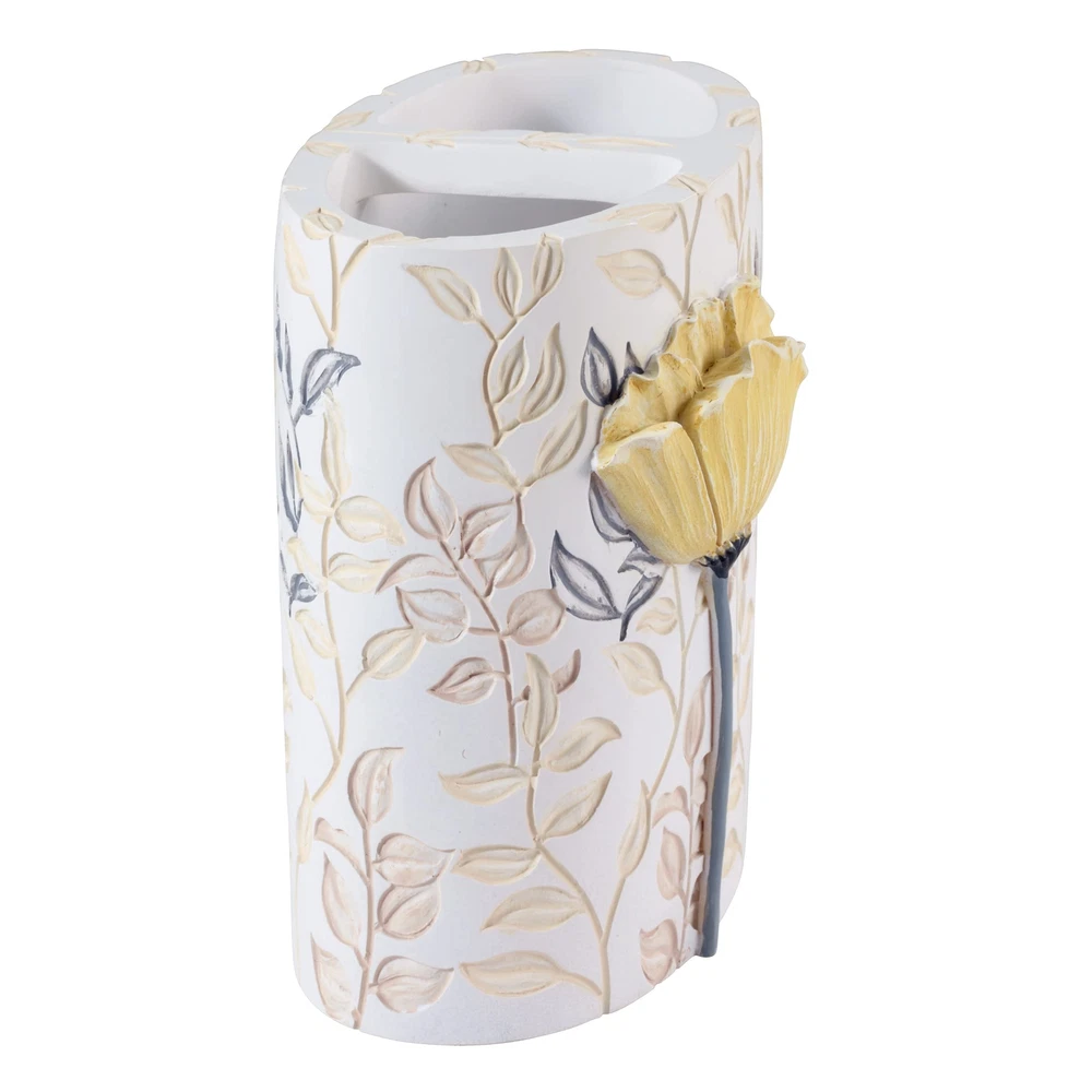 The Avanti Marielle Toothbrush Holder features a 3-dimensional yellow flower with a grey stem on a smooth off-white ground. A yellow and grey embossed leaf and vine pattern wraps around the piece. Made of durable, hand-painted resin, wipe clean. Don't forget to check out the other accessories in the Marielle Collection: Soap dispenser, toothbrush holder, tumbler, soap dish, vanity tray, covered jar, tissue cover, wastebasket, shower curtain, shower hooks, bath rug and towels in three sizes. The Marielle Collection features yellow poppy blooms, artistically rendered with a classic watercolor style. Grey accents and gold splashes of foliage keep the mood light and bright. The Marielle Collection Toothbrush Holder has debossed yellow poppies on a white ground surrounded by grey and gold foliage. The perfect 2 chamber organizer for your bathroom, vanity, office or kitchen. Made from durable, food-safe resin, this piece is hand-painted for beauty and a signature, unique look. Mix and match with other bathroom accessories from the collection: Towels, shower curtain, shower hooks, bath rug, soap dispenser, toothbrush holder, tumbler, soap dish, vanity tray, covered jar, tissue cover and wastebasket. Avanti Home. Since 1969.