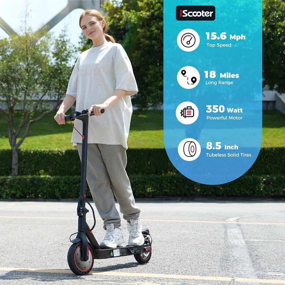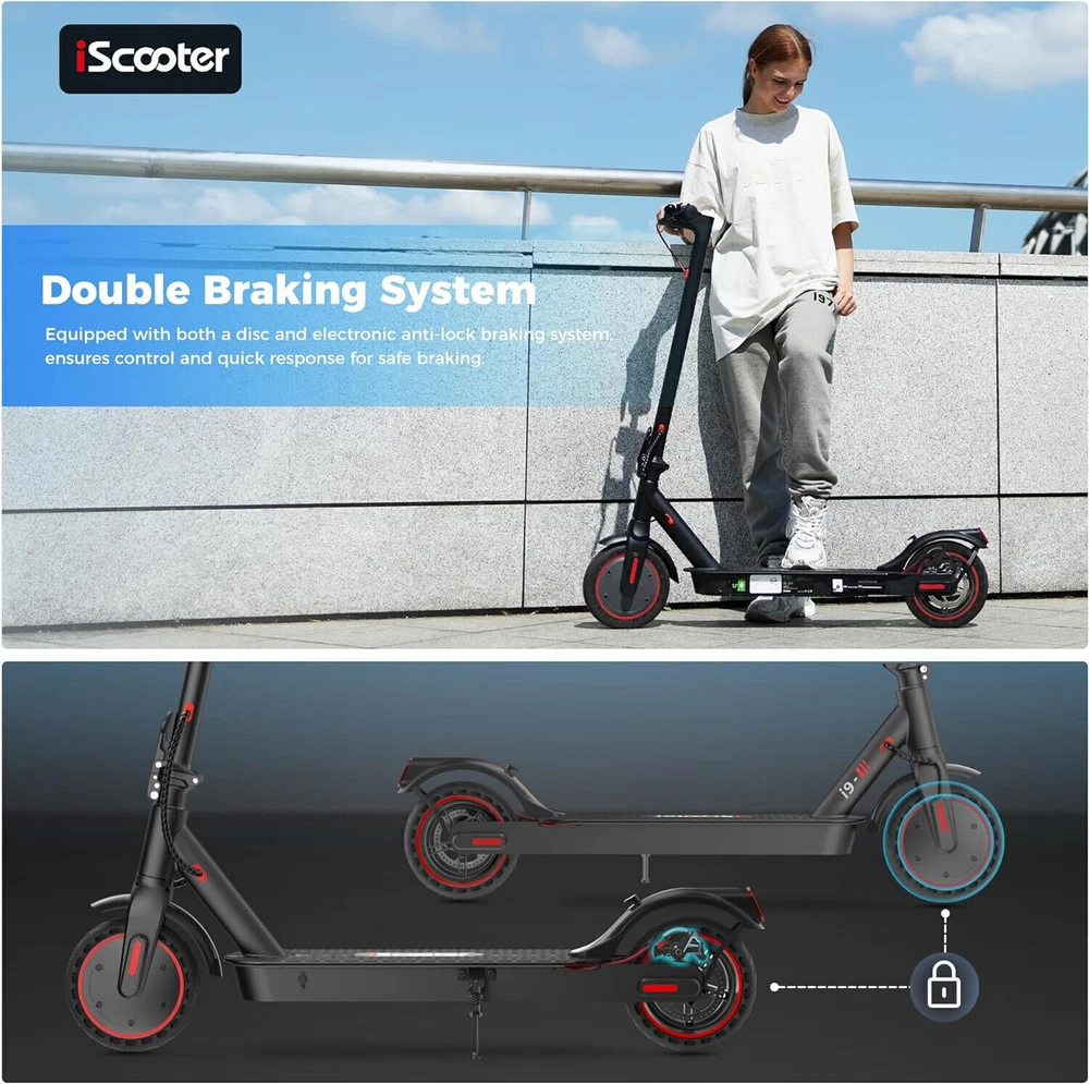 STORE NEW ARRIVALS ADD TO FAVORITE VIEW FEEDBACK CONTACT Store New Arrivals Add to Favorite View Feedback Contact Iscooter Electric Scooter, 25/22/18 Miles Range, 25/18.6/15.6 MPH Top Speed, 800W/500W/350W Foldable Commuting Electric Scooter with Double Braking Systems and APP for Adults and Teens Description Included Components i9 Electrcic Scooter Style i9(350W, 18miles) Number of Items 1 Age Range (Description) Adult Warranty Type Limited Package Weight 14.09 Kilograms Brand Name iScooter Brand iScooter Material Aluminum Suggested Users Ages 14 and up Frame Material Aluminum Handle Height 76 Centimeters Wheel Material Rubber Number of Wheels 2 Wheel Type Pneumatic Item Package Dimensions L x W x H 43.5 x 21 x 7 inches Manufacturer Zhejiang jinpan import and export co.,Ltd Brake Style Front Braking, Rear Braking Handlebar Type Fixed Grip Type Ergonomic Item Weight 10.9 Kilograms Charging Time 6 Hours Special Feature APP Controller, Non Slip Deck, foldable, Double braking system(Electronic brake+disc brake) Weight Limit 220 Pounds Item Dimensions LxWxH 42 x 17 x 44 inches Wheel Size 8.5 Inches Color Black Maximum Distance Range 18 Miles Recommended Uses For Product Commuting Model Name E9PRO Product Dimensions 42"L x 17"W x 44"H 【Cost-Effective Electric Scooter for Commuters】Discover an affordable and efficient commuting solution with our high-performance electric scooter adults. 350W electric scooters offers a maximum speed of 15.6mph, making your daily commute faster and more cost-effective. The Cruise Control System ensures a smooth and enjoyable ride. The scooter for adults has a maximum load capacity of 220lbs, catering to a wide range of riders. 【Long-lasting and Safety 】Equipped with a high-capacity 36V/7.5AH battery, our scooter electric boasts a travel range of 18 miles. With a quick charging time of 3-6 hours, you'll have more time on the go. Prioritizing your safety, it features warning taillights and ultra-bright headlights with a range of up to 15 meters, enhancing visibility during nighttime rides. The double braking system, including disc braking and EABS regenerative anti-lock braking, ensures a secure riding experience. 【Smart APP Control】Take control of your ride with the free KCQ APP, available for both iPhone and Android. Connect your adult electric scooter via Bluetooth and manage features such as lock/unlock, light control, gear adjustment, start mode selection, cruise control, and more. The smart APP enhances your riding experience and simplifies scooter operation. 【Foldable and Convenient】Experience unparalleled convenience with our one-step folding design that allows you to fold the scooter in just 3 seconds. Perfect for city commuting, campus travel, and office commutes, the scooter can be easily folded and weighs only 26 lbs, making it compact enough to fit in a car trunk. Elevate your family trips with this foldable electric scooter, providing unmatched convenience and joy. 【Quality Assurance by iScooter】At iScooter, we are committed to delivering premium, affordable, and reliable products. Enjoy peace of mind with our 12-month or 180-day warranty for different parts. If you have any questions, our dedicated customer support is ready to assist you. Your satisfaction is our utmost priority. Make your life more wonderful with iScooter's Foldable Electric Scooters. Product Description If you are looking for one special gifts for your childs or friends, We think that our i9 electric scooter will be the perfect one! Folding: 42''x17"x19" Unfolding: 42”*17“*44“ 1 36V/7.5AH Battery 2 Smart APP 1 Headlight &Taillight 2 Dual Braking Systems 3 Solid Tire&Mudguard Tips: Safety first! Always remember to wear helmets and knee pads How fast can electric scooters go? iScooter i9 electric scooters can go about 15.6mph with 2st gear, 9mph with 1st gear. What are the benefits of an electric sooter? The benefits of electric scooters are that they are affordable, high cost-effective and portable to save your time to find a parking space or wait for subway. They can also save you money on gas because they can be charged quickly. How long do e scooters last? With proper care and maintenance, an e scooter can last anywhere between 2 to 5 years or even longer. How do I choose my scooter electric? You can focus on the following factors: Rider's weight, Ease of installing, Battery life, Top speed you prefer, the weight of sooter and Appearance. Why there are different top speeds with same scooter. The factor of influencing the top speed: Rider's weight, the condition of road and weather, daily maintenance, etc. RECOMMEND FOR YOU Add to Cart Add to Cart Add to Cart Add to Cart Add to Cart Add to Cart Add to Cart Customer Reviews 4.3 out of 5 stars 773 3.5 out of 5 stars 2 4.3 out of 5 stars 773 — 4.4 out of 5 stars 285 4.3 out of 5 stars 773 4.4 out of 5 stars 49 Price $259.99 $ 259 . 99 $399.99 $ 399 . 99 $229.99 $ 229 . 99 $469.99 $ 469 . 99 $539.99 $ 539 . 99 $289.99 $ 289 . 99 $129.99 $ 129 . 99 Motor Power 350W 500W 350W 750W 800W 500W 70W Top Speed 15.6 mph 15.6 mph 15.6 mph 28 mph 25 mph 15.6MPH 6MPH Long Range 18 Miles 21 Miles 12 Miles 50 Miles 25 Miles 18 Miles 5 Miles Tires Type 8.5'' Honeycomb Tires 12" Pneumatic Tires 8.5'' Pneumatic Tires 10" Pneumatic Tires 10'' Off Road Tubeless Tire 10'' Honeycomb Tires 5'' & 3.5''PU Tires Hill Climbing Approx. 15% Approx. 15% Approx. 15% Approx. 20% Approx. 25% Approx. 15% / Charging Time 3-6 hours 5-6 hours 5-6 hours 8-9 hours 6-7 hours 3-6 hours 4-5 hours Package SIze 43*6*21 IN /110.5*16*53 CM 46*8.7*23.2 IN / 116*22*59 CM 43*6*21 IN / 110.5*15.5*53 CM 46.8*8.2*24 IN /118*21*60 CM 47.2*9.6*19 IN / 120*24.5*49CM 46*6*20.8 IN / 117*16*53 CM 25.6*9.2*9 IN /65*23.5*22.5CM Net Weight 26 LB/ 13.4 KG 55LBS/ 25KG 26.4LB / 12 KG 46.7LB / 21.2KG 51.2 LBS /23.25 KG 32.6 LB /14.8 KG 8.8LBS / 4KG Smart App ✔ ✘ ✘ ✔ ✔ ✔ ✘ ABOUT US We offer the best prices around on high quality products. Our E-store inclu