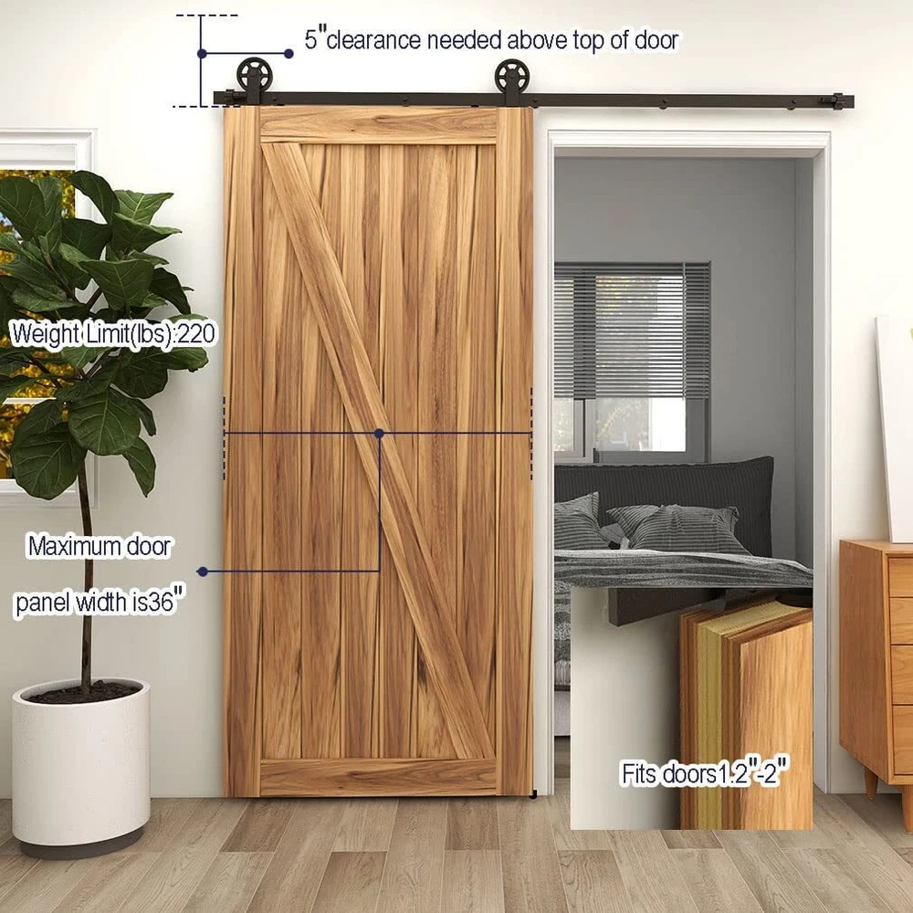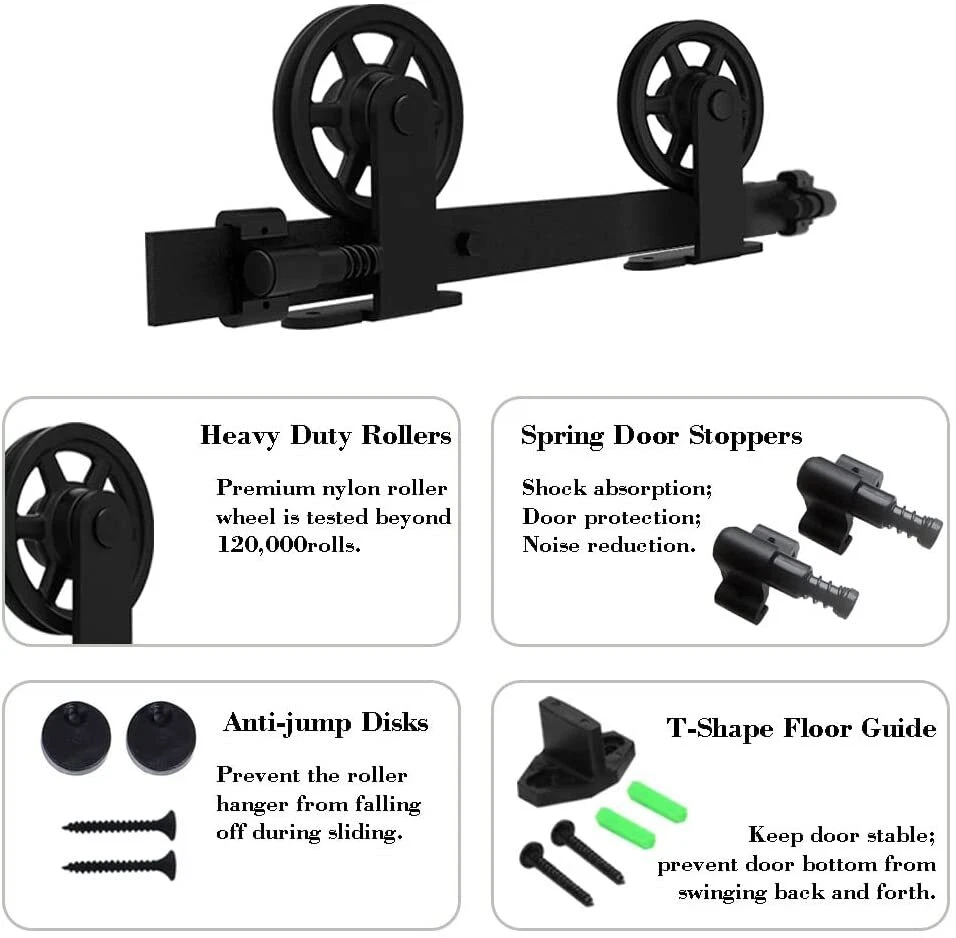 NOTE: Door and Install Tools are not included in package. Sliding Barn Door Hardware Rail Kit 4/5/6/6.6/7/8/9/10/12FT for Single/Double Wood Doors [Durable Material] : Carbon steel roller, premium nylon roller wheel, Gcr15 roller bearing, high strength industrial grade sliding track, can easily support 330bls load-bearing. [Product Advantag e ] : Adjustable roller bolts, fit door thickness from 1 1/4" to 1 7/8" (3cm-5cm), Spring door stops, reduce noise and soft close, Tenon design for rail connection, connect seamlessly and m ove smoothly. [ Eas y to Install] : Complete barn door hardware kit, step by step instruction installation with detailed graphic description, enjoy a funny DIY installation process. [Widely Used] : This rustic hardware fits wooden & concrete wall, great for saving space and room decor, widely used for kitchen, laundry room, bedroom, bathrrom, office, study room, dressing room, closet, cabinet etc. [Profess ional S ervice Team] : We offer 10 years warranty. Please feel free to contact us if some part is missing when you receive it, or other trouble during use, we will help you to solve the problem within 24 hours. Select needed rail size for single door, package includes: ① Spliced Track ② Rail Spacers ③ Roller: x2 ④ Roller Bolt: x4 ⑤ Door Stopper: x2 ⑥ Anti-jumper: x2 ⑦ T-shape Floor Guide: x1 ⑧ Install Manual: x1 Select needed rail size for double doors, package includes: ① Spliced Track ② Rail Spacers ③ Roller: x4 ④ Roller Bolt: x8 ⑤ Door Stopper: x4 ⑥ Anti-jumper: x4 ⑦ T-shape Floor Guide: x2 ⑧ Install Manual: x1 ---- -------------------------------- ------ ----------------------------------------------------------------------------- ---- ------ Select 2 rollers, no track, package includes: ① Roller: x2 ② Roller Bolt: x4 ③ Door Stopper: x2 ④ Anti-jumper: x2 ⑤ T-shape Floor Guide: x1 ---- -------------------------------- ------ ----------------------------------------------------------------------------- ---- ------ ---- -------------------------------- ------ ----------------------------------------------------------------------------- ---- ------ How to Choose Track Size ① Hang Single Door: Track's length should be two times of door panel's width (If door width is 3.3FT/100cm, you will need 6.6FT/200cm Kit for single door) ② Hang Double Doors(Not Bypass): Track's length should be four times of door panel's width (If door width is 3.3FT/100cm, you will need 13.6FT/414cm Kit for double doors) Hang double doors, needs extra 2 rollers for the second door , just order the whole single kit add 2pcs rollers.