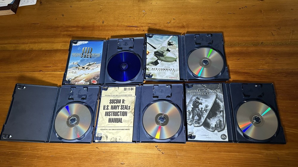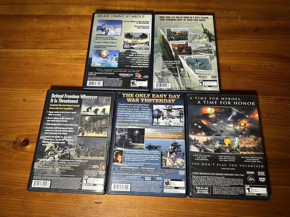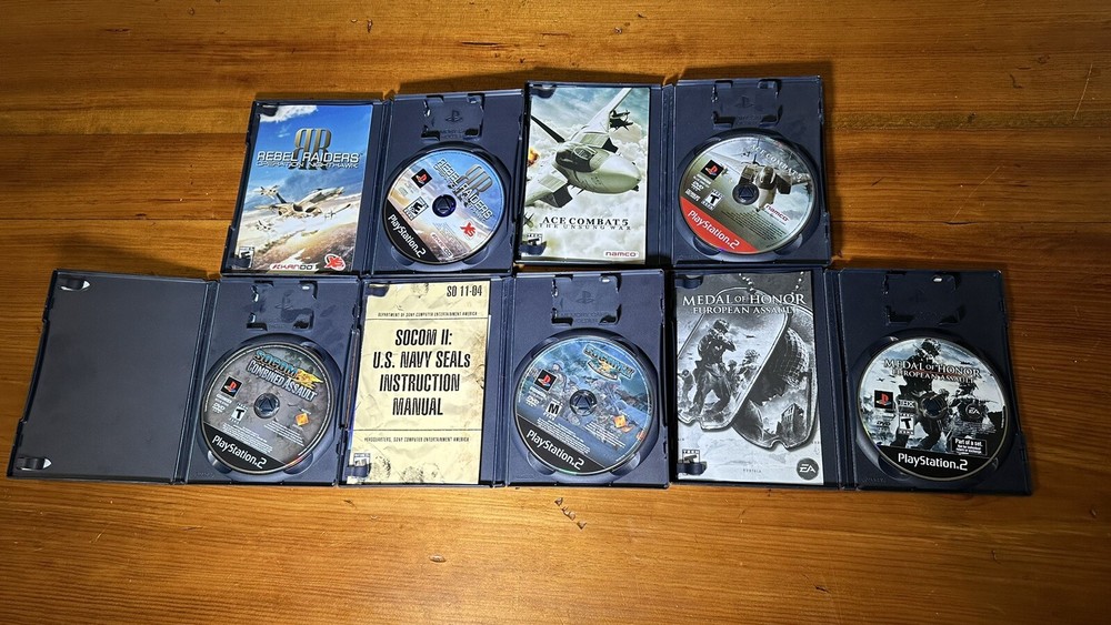 Combat games for PS2. Includes Socom U.S. Navy Seals Combined Assault, Socom II U.S. Navy Seals, Medal of Honor European Assault, Rebel Raiders: Operation Nighthawk, & Ace Combat 5: The Unsung War. Sold together as set. All in good condition.