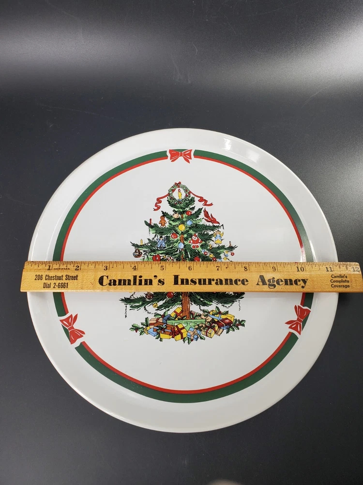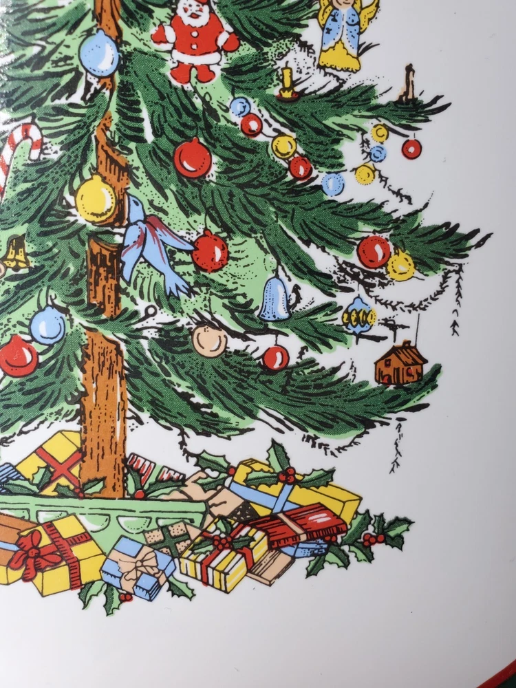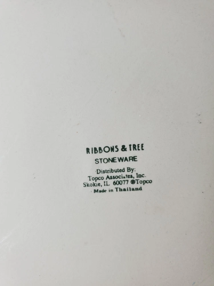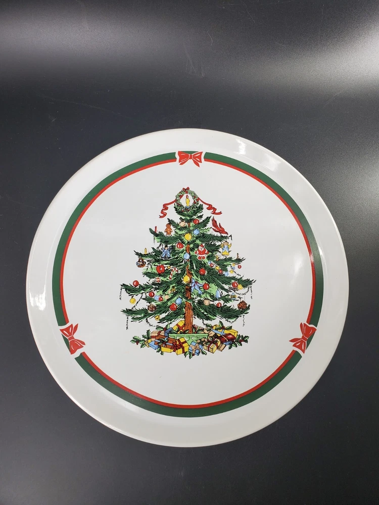 Add a festive touch to your holiday table with this 11" Stoneware Platter from Topco. The Ribbons & Tree Christmas Tree pattern is a festive addition to your holiday decor. Use this platter as a Cake Plate too. The contemporary style and multicolor design make it a perfect addition to your Christmas décor. The platter is made of durable stoneware material and features a Christmas tree theme, making it an ideal choice for the occasion. This Topco Ribbons platter is 11 inches wide and weighs 1 pound and 5.8 ounces. It is recommended to hand wash the platter to ensure long-lasting use. Use it to serve your favorite holiday dishes or as a decorative piece in your home. There are no chips or cracks.