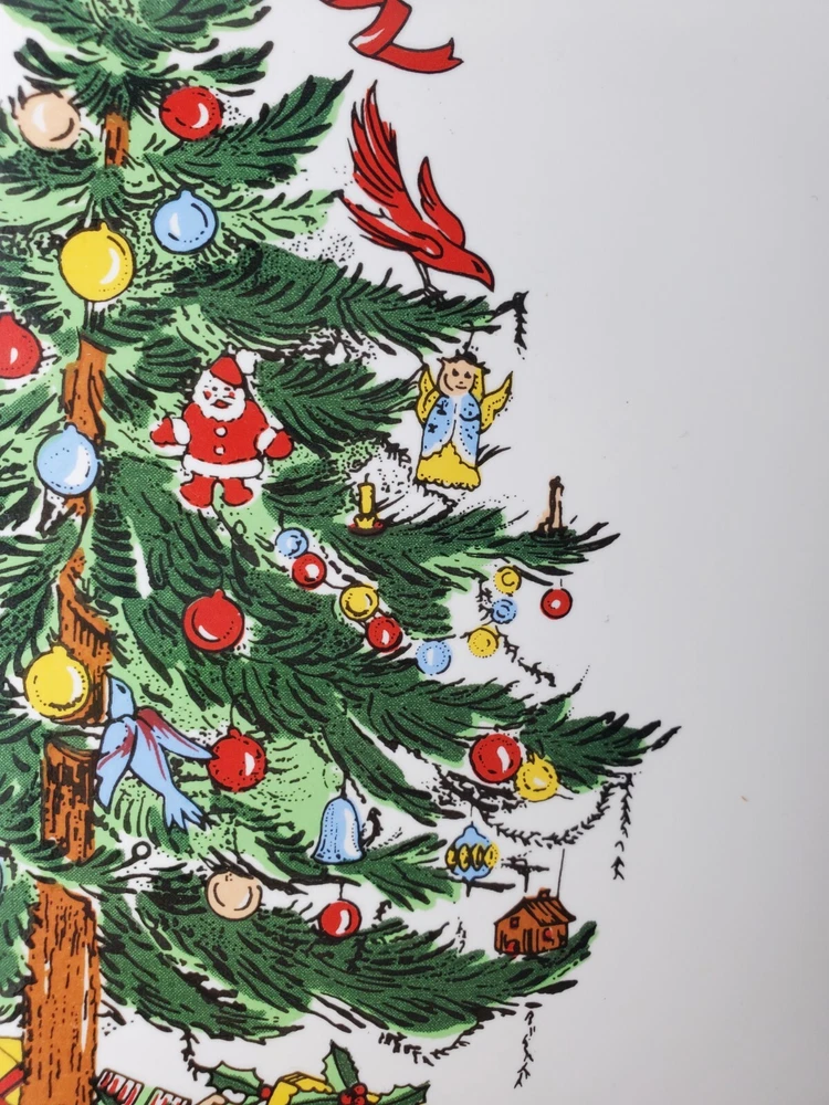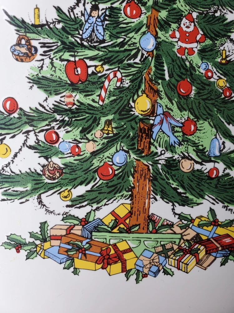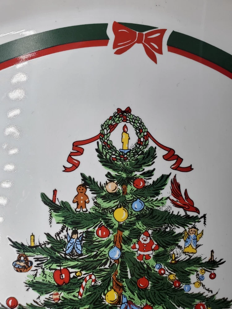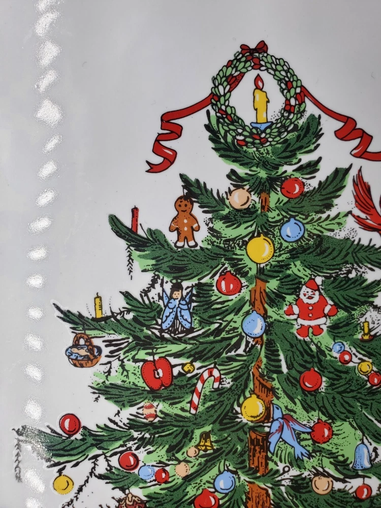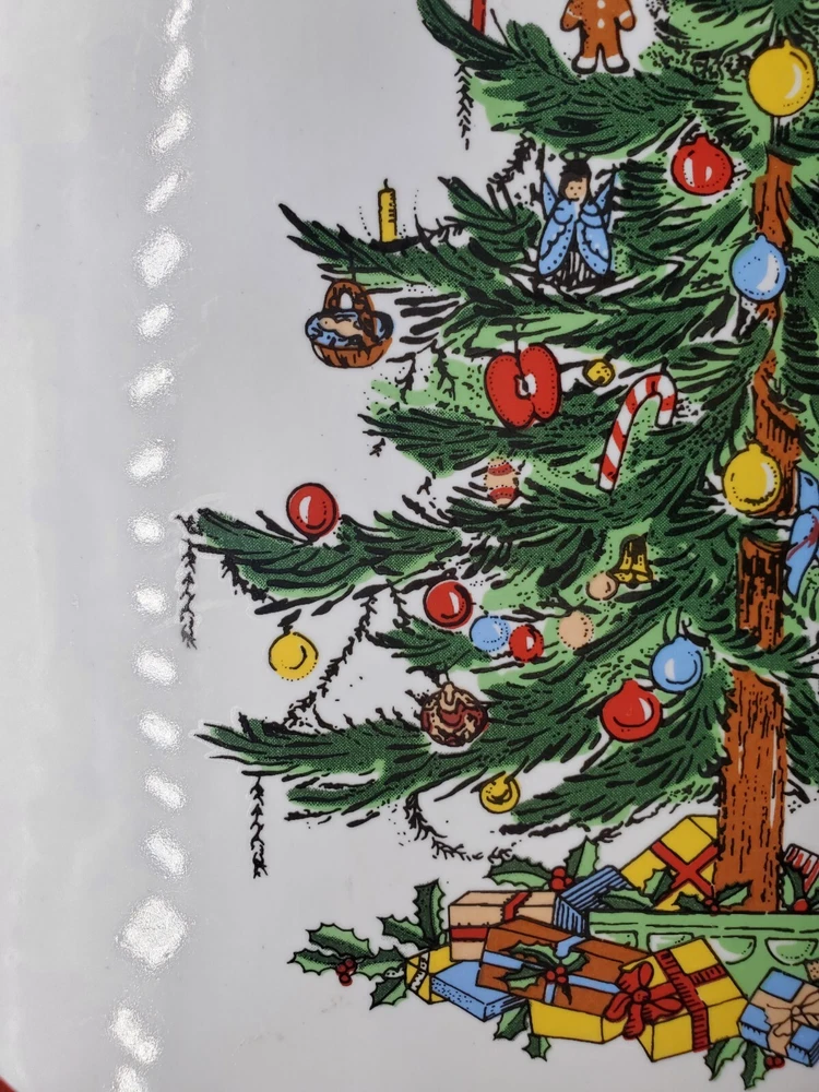 Add a festive touch to your holiday table with this 11" Stoneware Platter from Topco. The Ribbons & Tree Christmas Tree pattern is a festive addition to your holiday decor. Use this platter as a Cake Plate too. The contemporary style and multicolor design make it a perfect addition to your Christmas décor. The platter is made of durable stoneware material and features a Christmas tree theme, making it an ideal choice for the occasion. This Topco Ribbons platter is 11 inches wide and weighs 1 pound and 5.8 ounces. It is recommended to hand wash the platter to ensure long-lasting use. Use it to serve your favorite holiday dishes or as a decorative piece in your home. There are no chips or cracks.