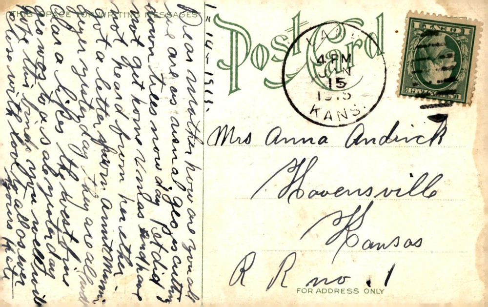 Postcard dated 1-14-1915 from Mrs. Anna Andrick to her mother, mentioning George cutting trees and missing letters from Petdid. Describes a sale attended by George.