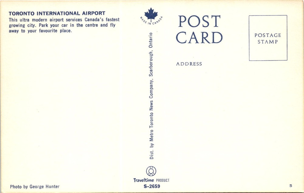 MAKE AN OFFER. THE MORE YOU BUY THE BETTER DEAL I WILL ACCEPT The front of the postcard features a photo of Toronto International Airport, highlighting its modern facilities and convenience for travelers in Canada's fastest growing city. The airport offers a central parking location for easy access and serves as a gateway for flights to various destinations. The postcard was distributed by the Metro Toronto News Company in Scarborough, Ontario, Canada.