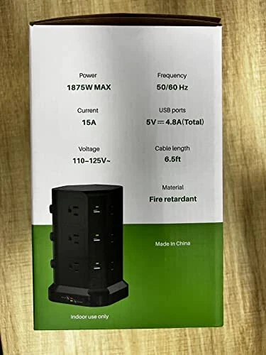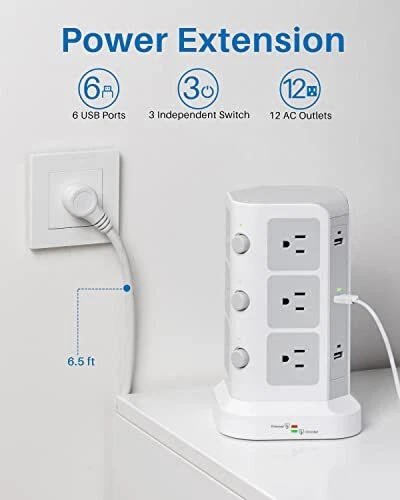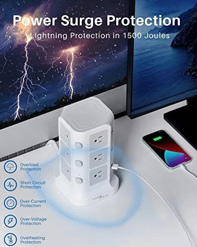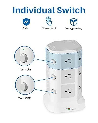 18 IN 1 Power Strip- Integrating 12 Outlets and 6 USBs together : tower power strip, the answer to all your charging needs, is a versatile, sophisticated, and intelligent charging dock. It integrates 12 AC outlets and 6 USB charging ports within one charging station, allowing you to connect and charge up to 18 devices simultaneously, even where space is limited. It is an ideal all-in-one solution. INDIVIDUAL SWITCH DESIGN : The power strip accompanied by USBs and outlets has an individual power control switch on each level, 3 in total, making it easy to turn off multiple electronics at once when not in use. The cable core made of pure copper is sturdy, durable, and safe to use. The 2-Meter long cord can meet most usage scenarios and can accommodate your instant charging needs. SUPERIOR SECURITY : The 1500 J built-in surge protector protects all the attached devices effectively and keeps them safe from voltage spikes, even during thunderstorms. The overload protection button switches off automatically when the total power of the device exceeds 1875W and thus, completely protects you and your electronic devices and appliances. HIGH-QUALITY MATERIALS : Owing to the advanced flame retardancy of the PC material (UL 94V0 standard) and the ABS shell, the Power Strip Tower is fireproof, high-temperature resistant. The premium-grade material employed significantly increases the lifespan of the sockets, ensuring the safety of your gadgets and short circuit protection. REAL SPACE SAVER : Equipped with an assortment of 12 AC sockets and 6 USB ports, this innovative power strip has sockets perpendicularly positioned to the floor, maximizing space compared to the conventional models. The ergonomic spacing and orientation of the sockets will allow better organization of the space as the whole system can be tucked away neatly into tight spaces and corners.