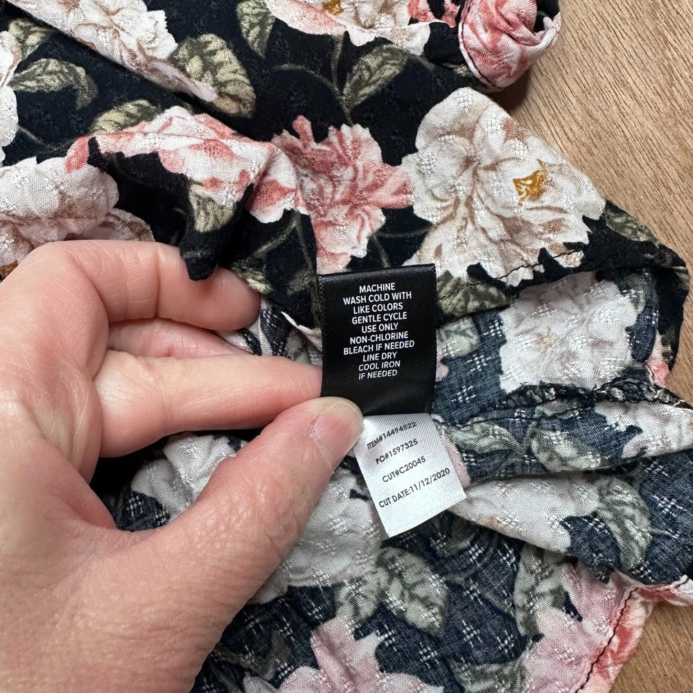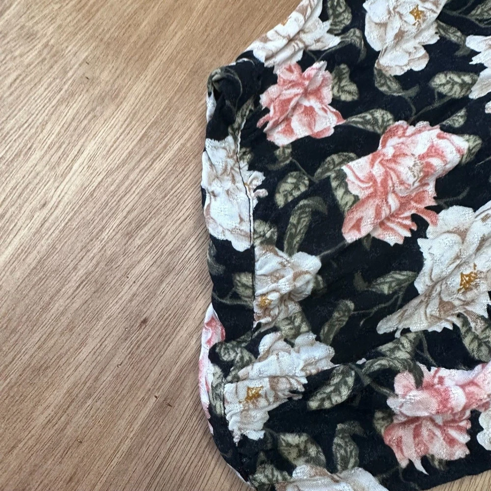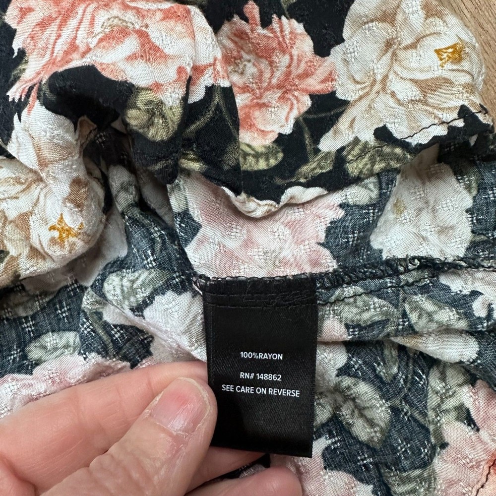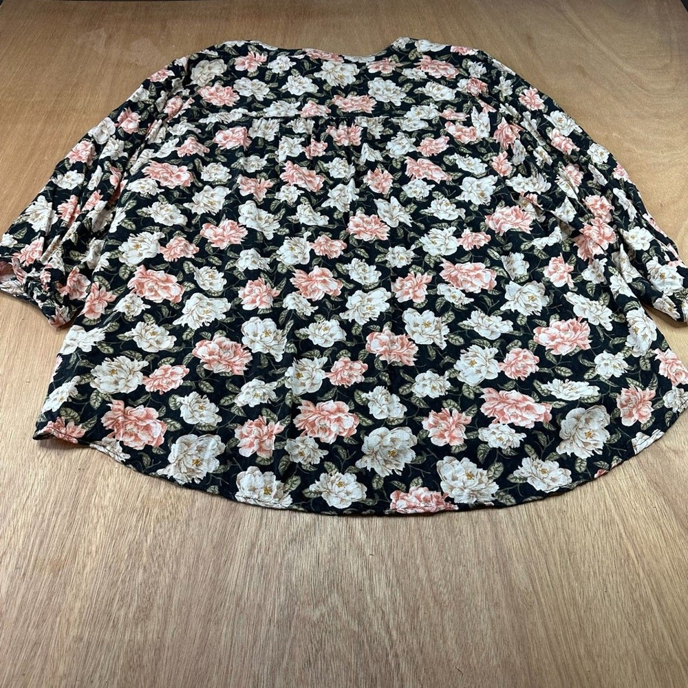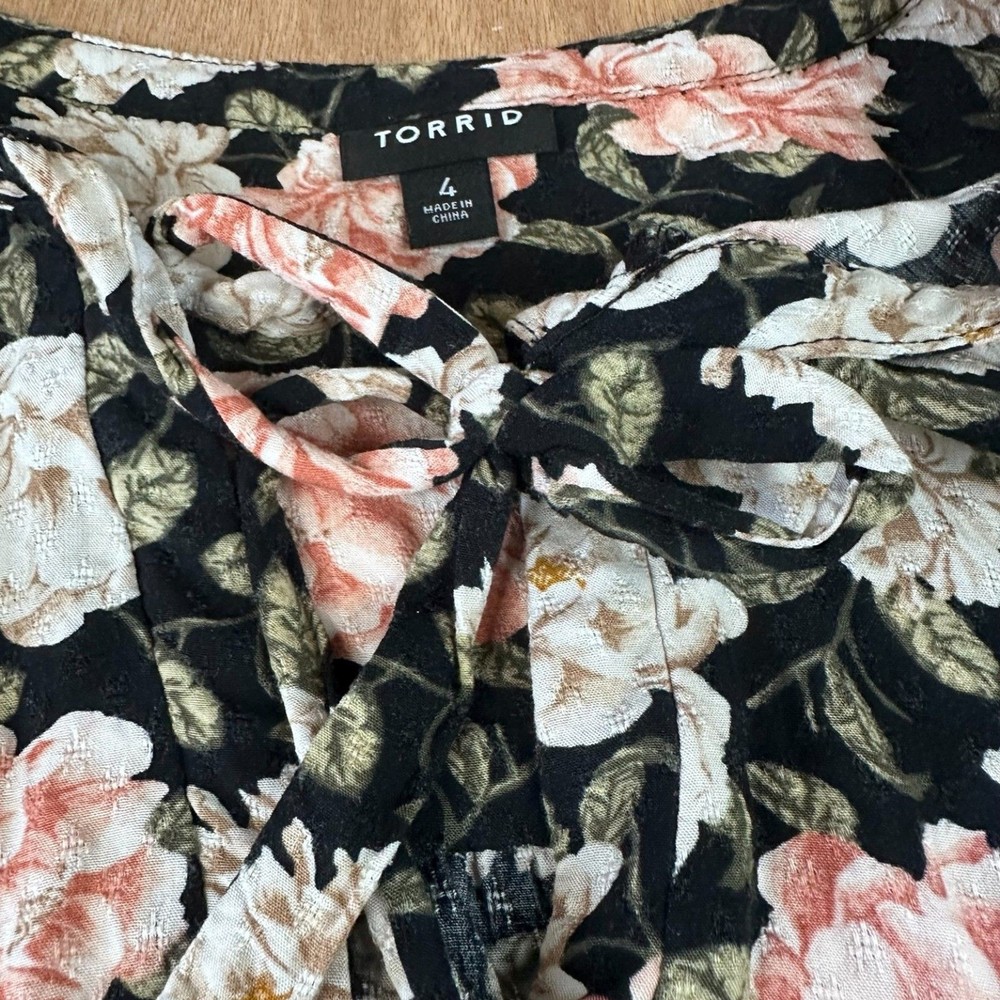Torrid women’s black floral blouse in size 4 (approximately US women’s 26–28) featuring a feminine floral print on a black background with a flattering relaxed silhouette. This flowy blouse includes a tie neckline detail and lightweight fabric that makes it comfortable for everyday wear. Perfect for spring outfits, casual wear, or pairing with jeans or skirts for a boho-inspired look. The darker floral pattern makes it versatile for both daytime outfits and slightly dressier casual occasions. FEATURES Brand: Torrid Size: 4 (Approx. US 26/28) Color: Black with floral print Style: Boho Floral Blouse Neckline: Tie Neck Sleeve: Long Sleeve Material: Rayon MEASUREMENTS Pit to Pit: 27 in Length: 28 in CONDITION Good pre-owned condition. No major flaws observed. Please review photos for full condition details. #torrid #plussizefashion #floralblouse #springstyle 1814