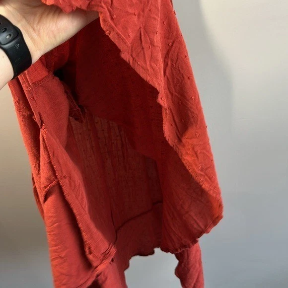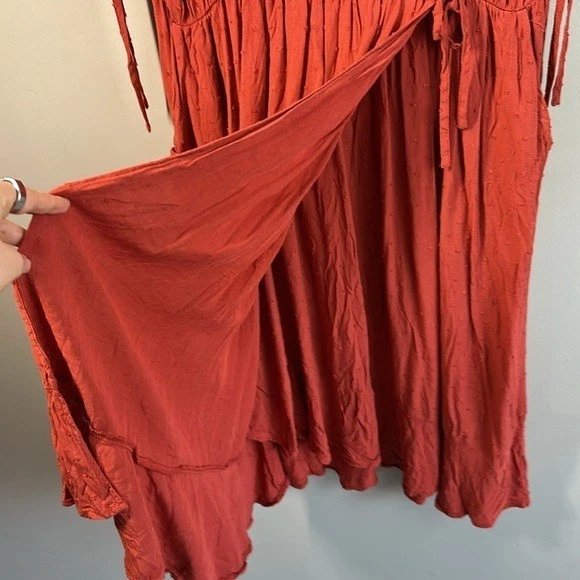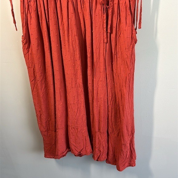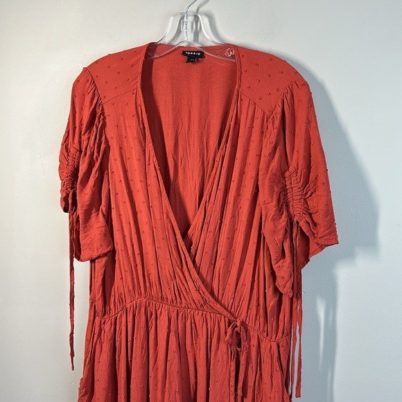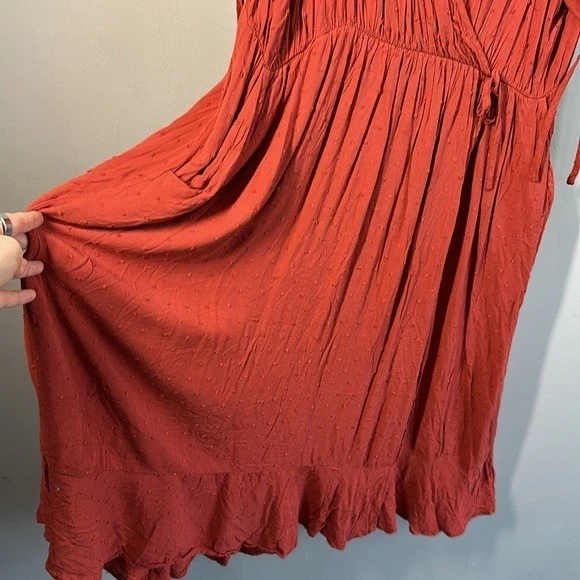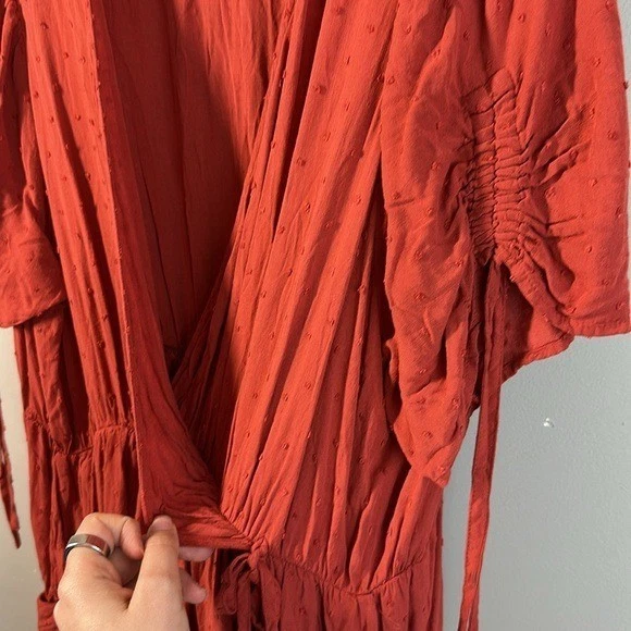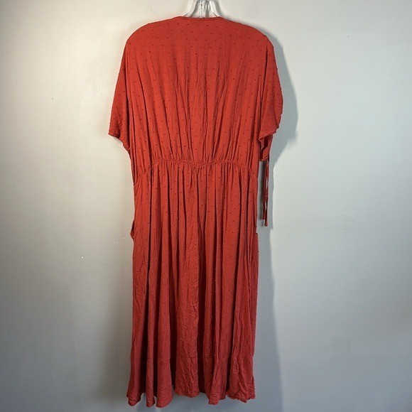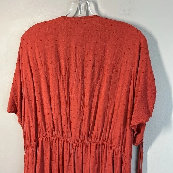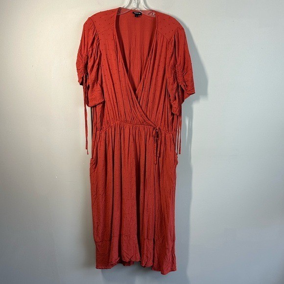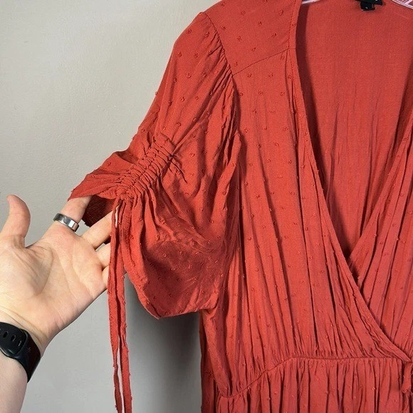 Swiss dot textured woven fabric Surplice neckline Short sleeves with tie details Pockets Side tie detail Faux wrap Rayon Pit to Pit - approx 24” Length - approx 45” Excellent preowned condition BinH.409