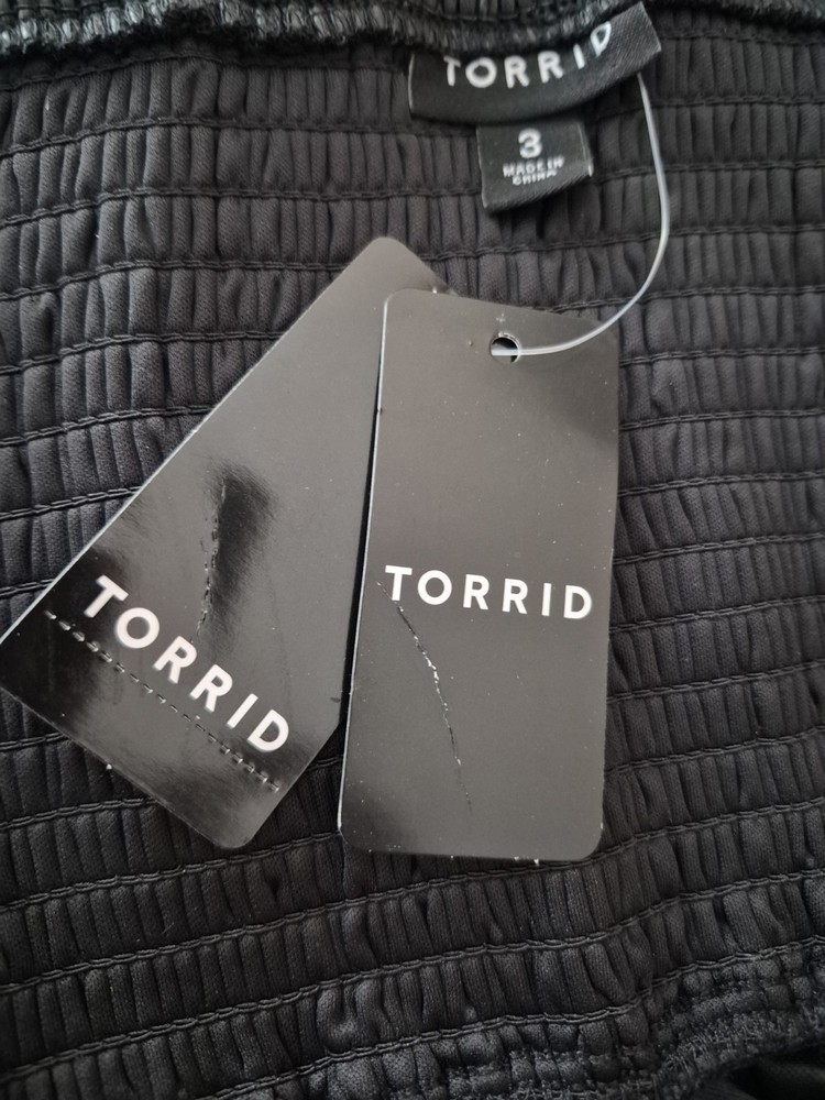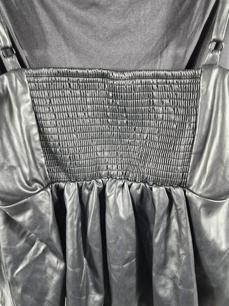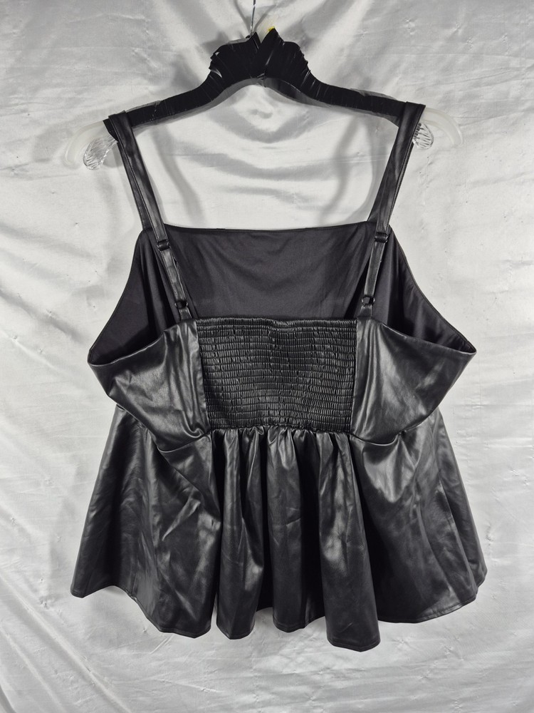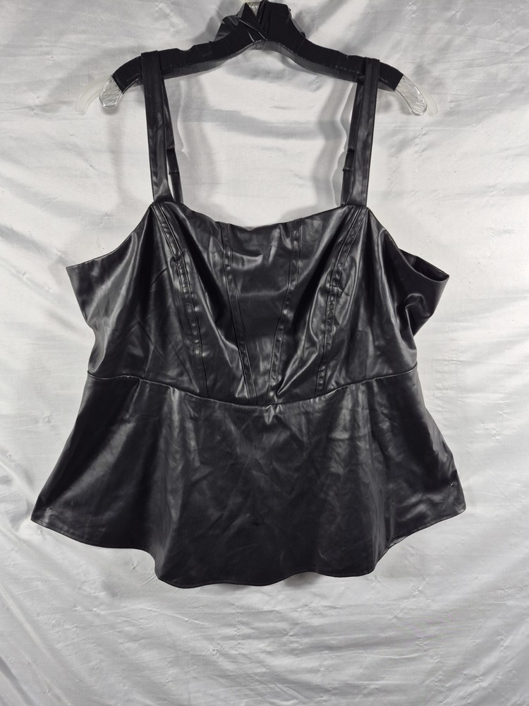The Torrid Women's Black Vegan Leather Corset Square Neck Peplum Top Plus Size 3X is a stylish and versatile piece for any wardrobe. Made from durable vegan leather, this sleeveless top features a square neckline and wide straps for a flattering fit. The peplum accent adds a trendy touch, making it perfect for both party and casual occasions. Machine washable and with smocked back stretch features, this top offers both style and comfort for the warmer seasons. Perfect for women looking for a chic and edgy addition to their clothing collection. 22 pit to pit 28 length 24 sku