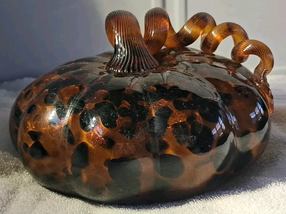 Tortoise Shell & Glitter Art Glass Hand Blown Pumpkin Swirled Stem with glossy finish and glitter details make this piece a standout addition to any collection. Measuring 5.5 inches in height and 9 inches in width, this contemporary original is an ideal size for display. The artist is unknown, but the quality of this sculpture is undeniable. Whether you're a fan of art glass or simply love unique and eye-catching decor, this pumpkin is sure to impress. Beautiful piece to add to your collection. Please see all photos. Buyer pays shipping. Please see my other items. Thank you.