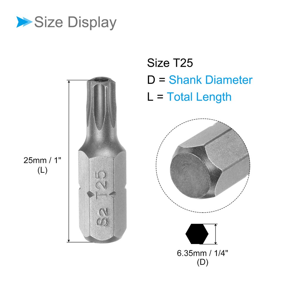 Document Attributes:* Shank Size: 1/4"* Total Length: 25mm / 1"* Bit Type: T25 * Material: S2 SteelWhat Is Included:* 1 Piece x Torx Screwdriver BitApplications & Features:--- Those bits fit for electric screwdrivers, hand screwdrivers, electric drills, air drills, air batches and 1/4" screwdriver sets.--- The torx screwdriver bits are made of S2 steel, which ensures high hardness, durability and wear resistance.--- These screwdriver bits are magnetic, which can firmly absorb the screw to prevent it from falling off.--- The star head bits are easy to install on the screwdriver handle with double ear on the sides of the bit shank.Useful Tips:--- Please apply appropriate force. Excessive force may cause the bit to slip, while insufficient force may not effectively tighten or remove the screw. Torx Screwdriver Bits 1/4" Hex Shank 25mm Long T25 Magnetic Screwdrivers Bit Attributes: * Shank Size: 1/4" * Total Length: 25mm / 1" * Bit Type: T25 * Material: S2 Steel What Is Included: * 1 Piece x Torx Screwdriver Bit Applications & Features: --- Those bits fit for electric screwdrivers, hand screwdrivers, electric drills, air drills, air batches and 1/4" screwdriver sets. --- The torx screwdriver bits are made of S2 steel, which ensures high hardness, durability and wear resistance. --- These screwdriver bits are magnetic, which can firmly absorb the screw to prevent it from falling off. --- The star head bits are easy to install on the screwdriver handle with double ear on the sides of the bit shank. Useful Tips: --- Please apply appropriate force. Excessive force may cause the bit to slip, while insufficient force may not effectively tighten or remove the screw. Hot Item Payment 1.We accept eBay payment . 2.Payment must be received within 7 business days of auction closing. Shipping 1.We ship to your eBay or Paypal address. Please make sure your eBay and Paypal address is correct before you pay. 2.Items will be shipped within 1-3 business day when we received payment. 3.Delivery time depends on destination and other factors. Description Policy Torx Screwdriver Bits 1/4" Hex Shank 25mm Long T25 Magnetic Screwdrivers Bit Attributes: * Shank Size: 1/4" * Total Length: 25mm / 1" * Bit Type: T25 * Material: S2 Steel What Is Included: * 1 Piece x Torx Screwdriver Bit Applications & Features: --- Those bits fit for electric screwdrivers, hand screwdrivers, electric drills, air drills, air batches and 1/4" screwdriver sets. --- The torx screwdriver bits are made of S2 steel, which ensures high hardness, durability and wear resistance. --- These screwdriver bits are magnetic, which can firmly absorb the screw to prevent it from falling off. --- The star head bits are easy to install on the screwdriver handle with double ear on the sides of the bit shank. Useful Tips: --- Please apply appropriate force. Excessive force may cause the bit to slip, while insufficient force may not effectively tighten or remove the screw. Hot Item Payment 1.We accept eBay payment . 2.Payment must be received within 7 business days of auction closing. Shipping 1.We ship to your eBay or Paypal address. Please make sure your eBay and Paypal address is correct before you pay. 2.Items will be shipped within 1-3 business day when we received payment. 3.Delivery time depends on destination and other factors.