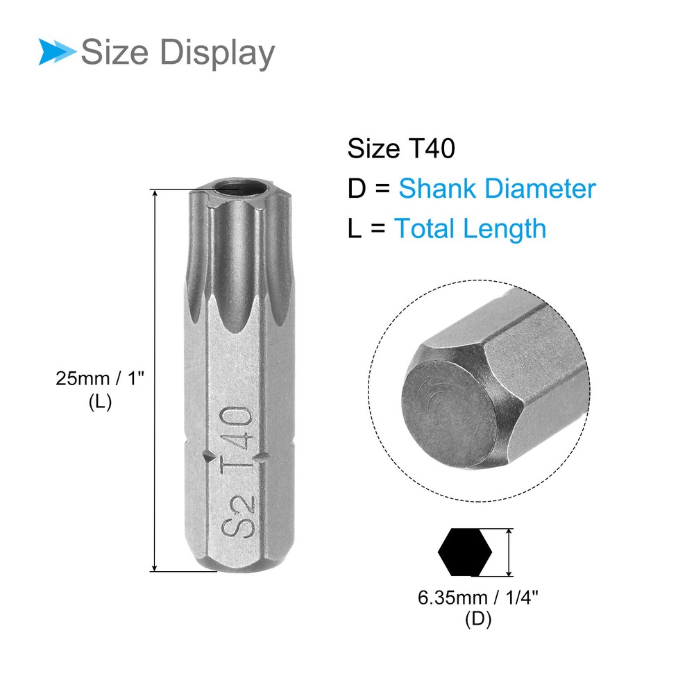 Document Attributes:* Shank Size: 1/4"* Total Length: 25mm / 1"* Bit Type: T40 * Material: S2 SteelWhat Is Included:* 1 Piece x Torx Screwdriver BitApplications & Features:--- Those bits fit for electric screwdrivers, hand screwdrivers, electric drills, air drills, air batches and 1/4" screwdriver sets.--- The torx screwdriver bits are made of S2 steel, which ensures high hardness, durability and wear resistance.--- These screwdriver bits are magnetic, which can firmly absorb the screw to prevent it from falling off.--- The star head bits are easy to install on the screwdriver handle with double ear on the sides of the bit shank.Useful Tips:--- Please apply appropriate force. Excessive force may cause the bit to slip, while insufficient force may not effectively tighten or remove the screw. Torx Screwdriver Bits 1/4" Hex Shank 25mm Long T40 Magnetic Screwdrivers Bit Attributes: * Shank Size: 1/4" * Total Length: 25mm / 1" * Bit Type: T40 * Material: S2 Steel What Is Included: * 1 Piece x Torx Screwdriver Bit Applications & Features: --- Those bits fit for electric screwdrivers, hand screwdrivers, electric drills, air drills, air batches and 1/4" screwdriver sets. --- The torx screwdriver bits are made of S2 steel, which ensures high hardness, durability and wear resistance. --- These screwdriver bits are magnetic, which can firmly absorb the screw to prevent it from falling off. --- The star head bits are easy to install on the screwdriver handle with double ear on the sides of the bit shank. Useful Tips: --- Please apply appropriate force. Excessive force may cause the bit to slip, while insufficient force may not effectively tighten or remove the screw. Hot Item Payment 1.We accept eBay payment . 2.Payment must be received within 7 business days of auction closing. Shipping 1.We ship to your eBay or Paypal address. Please make sure your eBay and Paypal address is correct before you pay. 2.Items will be shipped within 1-3 business day when we received payment. 3.Delivery time depends on destination and other factors. Description Policy Torx Screwdriver Bits 1/4" Hex Shank 25mm Long T40 Magnetic Screwdrivers Bit Attributes: * Shank Size: 1/4" * Total Length: 25mm / 1" * Bit Type: T40 * Material: S2 Steel What Is Included: * 1 Piece x Torx Screwdriver Bit Applications & Features: --- Those bits fit for electric screwdrivers, hand screwdrivers, electric drills, air drills, air batches and 1/4" screwdriver sets. --- The torx screwdriver bits are made of S2 steel, which ensures high hardness, durability and wear resistance. --- These screwdriver bits are magnetic, which can firmly absorb the screw to prevent it from falling off. --- The star head bits are easy to install on the screwdriver handle with double ear on the sides of the bit shank. Useful Tips: --- Please apply appropriate force. Excessive force may cause the bit to slip, while insufficient force may not effectively tighten or remove the screw. Hot Item Payment 1.We accept eBay payment . 2.Payment must be received within 7 business days of auction closing. Shipping 1.We ship to your eBay or Paypal address. Please make sure your eBay and Paypal address is correct before you pay. 2.Items will be shipped within 1-3 business day when we received payment. 3.Delivery time depends on destination and other factors.