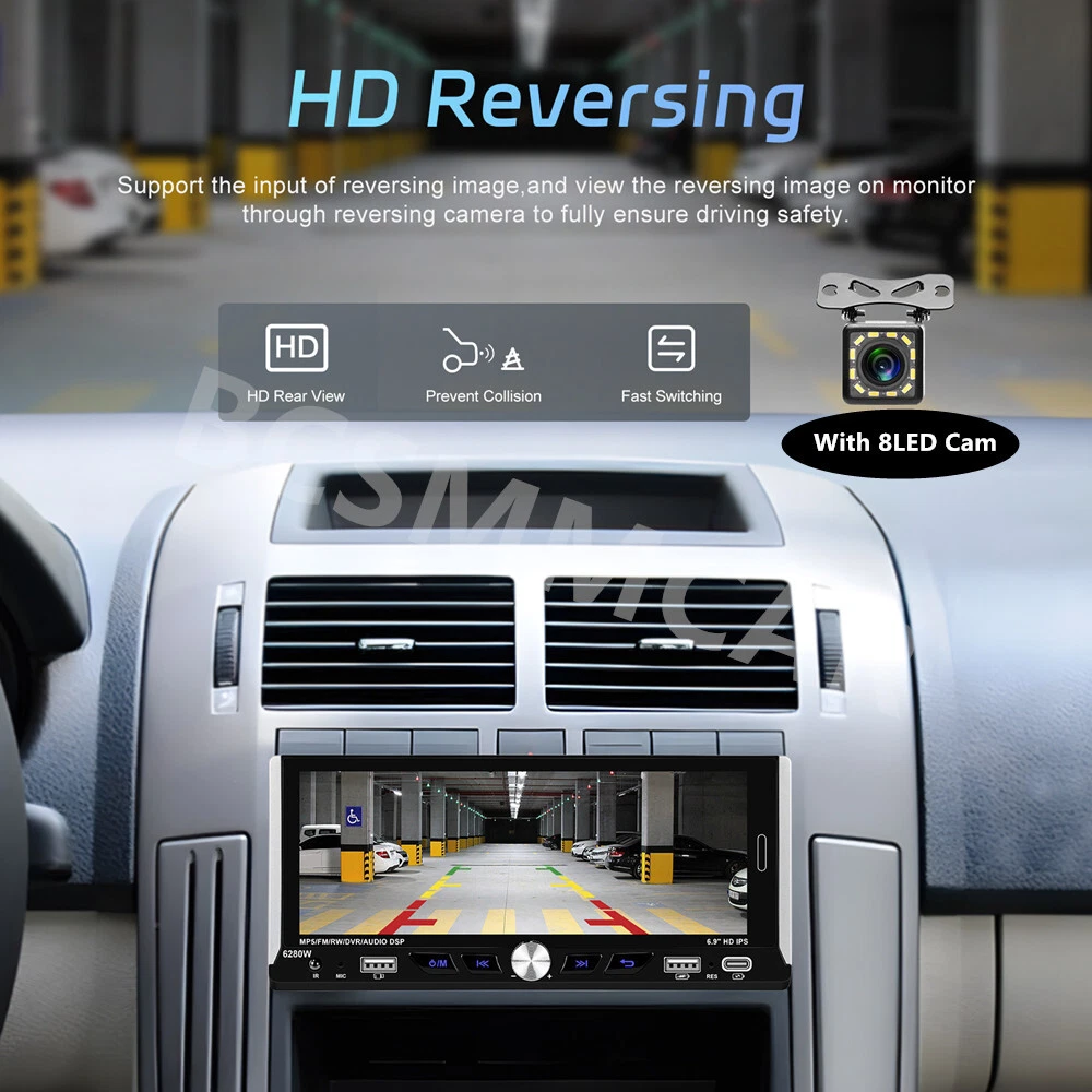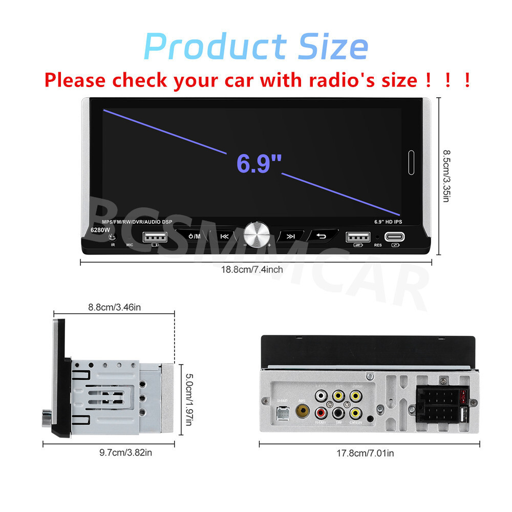 Product View Detail 1 Din Car Stereo MP5 Player Car Radio 6.9 Inch Multimedia Player Carplay Android Auto Bluetooth Screen Mirroring USB With 8LED Rear Camera Kit Note:Please check your car with radio's size !!! Features: ●Wireless Carplay: You can choose wireless connection to carplay, connect to Apple mobile phone, access mobile phone address book, mail, notification, map navigation, music, video and other information, and realize voice control. ● Android auto: The Android auto car system can closely integrate the user's Android phone and player, and realize navigation, make calls, send and receive information, listen to music and other operations through data cable connection. ● 6.9-inch high definition 2.5D IPS touch screen, dynamic menu interface. ● Mirror Link: Support Android/ Iphone Mirror Link through phone's original USB line synchronized to the on-board screen. ●Steering wheel control: Support steering wheel button learning function, through it you can control the functions that you need by steering wheel, more convenient. ● Hardware electronic sounds (EQ) processing, multiple EQ modes, treble and bass can be adjusted. ●FM/RDS radio with high-quality stereo, which can search channels in full-automatic ways,semiautomatic way and acurate adjustment way;Listen to music, newsletters and traffic information anytime, anywhere. ●Power off memory function: The player can automatically remember the playing state when power off (shutdown), and when it is restarted, it will automatically remember the previous music or radio playing state ● Built-in Bluetooth function, can connect with mobile phone, and support hands-free calling, phone book download. ● Support large memory TF card / U disk to store songs, you can download your favorite music or movies to play on this unit. ●Multi-function USB &TYPE-C port:allow you to connect your devices and enjoy your favorite music, videos, and photos. You can also charge your devices using the ports while driving. The ports support various formats and are easy to use. ● Colorful backlight settings, colorful backlights of the key can change automatically ●Rear view camera input function: if connect to a car backup camera, the car stereo monitor will turn to rear view reversing details automatically Specifics Model: 6280 Voltage:DC12V System:WINCE CPU Chip: F133 Screen size: 6.9'' screen Screen resolution: 1280*480 Mirror link:Support Radio Band:FM/RDS Radio Chip:QN8035 Power output:45W*4 Work temperature: -10~60℃ Bluetooth Version: 5.0 Bluetooth Name:CAR BT Colorful backlight: Support Reversing input: CVBS Power amplifier chip:TDA7388 Radio frequency:87.5-108MHz Audio format:MP3/WMA/WAV/APE/FLAC Video format:RM/RMVB/AVI/MP4/MKV/3GP Picture format: JPG BMP PNG language: English/Chinese/Spanish/Portuguese/Russian/Italian/German/French/Turkish/Czech/Arabic/Polish/Hebrew Package Included: 1 x Car MP5 Player 1 x Power Cable 1 x Horn Cable 1 x Accessories 1 x MIC 1 x Steering Wheel Control 1 x User manual 1 x 8LED Rear Camera Shipping Policy Payment Method Returns Policy Shipping Policy Payment Method Returns Policy Copyright © 2017 DataCaciques Home Payment Shipping About us Contact us BCSMMCAR Store Categories Store Categories Other Product View Detail 1 Din Car Stereo MP5 Player Car Radio 6.9 Inch Multimedia Player Carplay Android Auto Bluetooth Screen Mirroring USB With 8LED Rear Camera Kit Note:Please check your car with radio's size !!! Features: ●Wireless Carplay: You can choose wireless connection to carplay, connect to Apple mobile phone, access mobile phone address book, mail, notification, map navigation, music, video and other information, and realize voice control. ● Android auto: The Android auto car system can closely integrate the user's Android phone and player, and realize navigation, make calls, send and receive information, listen to music and other operations through data cable connection. ● 6.9-inch high definition 2.5D IPS touch screen, dynamic menu interface. ● Mirror Link: Support Android/ Iphone Mirror Link through phone's original USB line synchronized to the on-board screen. ●Steering wheel control: Support steering wheel button learning function, through it you can control the functions that you need by steering wheel, more convenient. ● Hardware electronic sounds (EQ) processing, multiple EQ modes, treble and bass can be adjusted. ●FM/RDS radio with high-quality stereo, which can search channels in full-automatic ways,semiautomatic way and acurate adjustment way;Listen to music, newsletters and traffic information anytime, anywhere. ●Power off memory function: The player can automatically remember the playing state when power off (shutdown), and when it is restarted, it will automatically remember the previous music or radio playing state ● Built-in Bluetooth function, can connect with mobile phone, and support hands-free calling, phone book download. ● Support large memory TF card / U disk to store songs, you can download your favorite music or movies to play on this unit. ●Multi-function USB &TYPE-C port:allow you to connect your devices and enjoy your favorite music, videos, and photos. You can also charge your devices using the ports while driving. The ports support various formats and are easy to use. ● Colorful backlight settings, colorful backlights of the key can change automatically ●Rear view camera input function: if connect to a car backup camera, the car stereo monitor will turn to rear view reversing details automatically Specifics Model: 6280 Voltage:DC12V System:WINCE CPU Chip: F133 Screen size: 6.9'' screen Screen resolution: 1280*480 Mirror link:Support Radio Band:FM/RDS Radio Chip:QN8035 Power output:45W*4 Work temperature: -10~60℃ Bluetooth Version: 5.0 Bluetooth Name:CAR BT Colorful backlight: Support Reversing input: CVBS Power amplifier chip:TDA7388 Radio frequency:87.5-108MHz Audio format:MP3/WMA/WAV/APE/FLAC Video format:RM/RMVB/AVI/MP4/MKV/3GP Pi