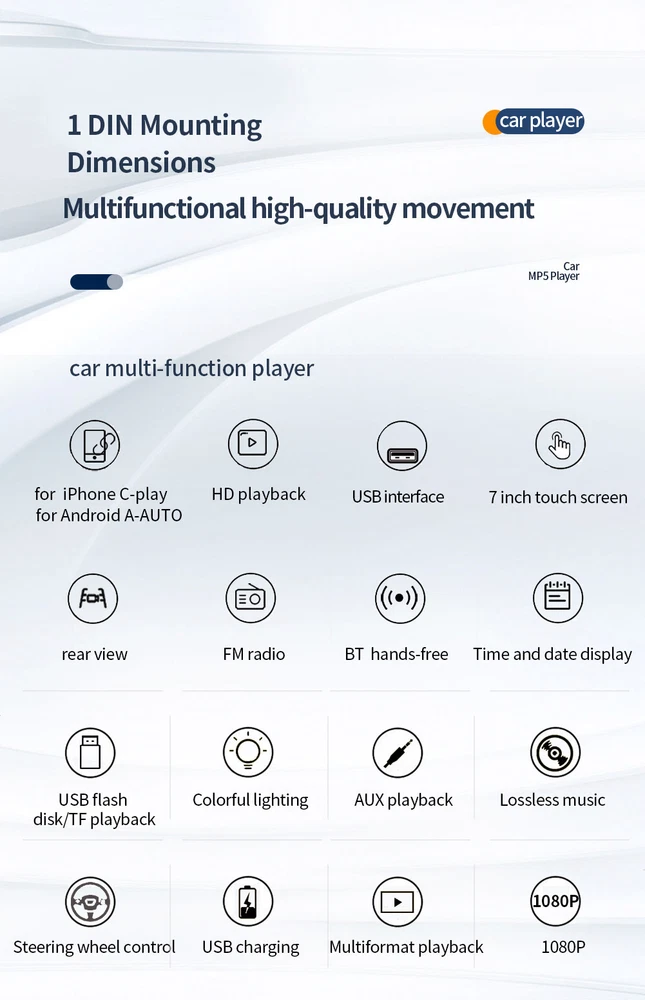 Store Categories Store Categories Other Details 1 Din Car Radio 7in Touch Screen Car MP5 Player For Wired Carplay&Android Auto FM Mirror Link Audio Stereo Multimedia Player Note:Please check Radio's size with car dashboard before buying !! Please note: This is a Wince radio that does not support WIFI&GPS Option: Wired Carplay&Android Auto Specifications: Packaging size: 22 * 12 * 13CM Screen size: 7 inches System: wince Interconnection: Wired Carplay Interconnection Wired Android Auto Interconnection Mobile Interconnection Video playback: RMVB/RM/FLV/3GP/MPEG/DIVX/XVID/DAT/VOB/AVI/MP4 Audio playback: DIS, MP3, WMA, ACC, OGG, WAV, RA, AC3, MP2, AMR, etc. Power amplifier chip: 7388 Mobile phone charging: supports USB mobile phone charging Bluetooth: support USB drive playback: supported TF card playback: supported AUX: Support Steering wheel control: supported Reverse view priority: supported Mobile internet: support USB interface: supported Features: ●Carplay: You can use the connection to Carplay, connect to your Apple phone, access phone contacts, emails, notifications, map navigation, music, videos, and other information, and achieve voice control. ●Android Auto, connected using a USB data cable. ●Screen: 7-inch high-definition video playback ●Image linkage: Supports Android/iPhone image linkage, which can be synchronized to the onboard screen through the original USB cable of the phone. It can support Apple version 13.4 and Android version 10.1. The above version may not support mobile phones, and the software needs to be upgraded after factory debugging ●Equipped with built-in Bluetooth function, can connect to mobile phones, make hands-free calls, make driving safer, and play Bluetooth music ● FM radio: can listen to real-time road conditions, news broadcasts, weather forecasts, and other 18 preset storage functions of the receiver ● Support steering wheel control function: use the car steering wheel to quickly switch the functions you want, making it more convenient ● Rear view camera input function (optional): The camera needs to be selected. If the car reversing camera is connected, the car audio will automatically turn to the rear view reversing details (optional) ●Seven color backlight settings: supports seven colors of backlight, you can choose from ●Decorate your car with your favorite colors in the settings menu ●The AUX audio input interface supports external MP3 players, mobile phones, music players, etc. ●Please note that the MP5 player does not support WIFI and GPS Package Included: 1x Host 1x Remote Control 1x Power Wire 1x Manual Shipping Policy Payment Method Returns Policy Shipping Policy Payment Method Returns Policy Copyright©2017 DataCaciques Home Payment Shipping About us Contact us Store Categories Store Categories Other Details 1 Din Car Radio 7in Touch Screen Car MP5 Player For Wired Carplay&Android Auto FM Mirror Link Audio Stereo Multimedia Player Note:Please check Radio's size with car dashboard before buying !! Please note: This is a Wince radio that does not support WIFI&GPS Option: Wired Carplay&Android Auto Specifications: Packaging size: 22 * 12 * 13CM Screen size: 7 inches System: wince Interconnection: Wired Carplay Interconnection Wired Android Auto Interconnection Mobile Interconnection Video playback: RMVB/RM/FLV/3GP/MPEG/DIVX/XVID/DAT/VOB/AVI/MP4 Audio playback: DIS, MP3, WMA, ACC, OGG, WAV, RA, AC3, MP2, AMR, etc. Power amplifier chip: 7388 Mobile phone charging: supports USB mobile phone charging Bluetooth: support USB drive playback: supported TF card playback: supported AUX: Support Steering wheel control: supported Reverse view priority: supported Mobile internet: support USB interface: supported Features: ●Carplay: You can use the connection to Carplay, connect to your Apple phone, access phone contacts, emails, notifications, map navigation, music, videos, and other information, and achieve voice control. ●Android Auto, connected using a USB data cable. ●Screen: 7-inch high-definition video playback ●Image linkage: Supports Android/iPhone image linkage, which can be synchronized to the onboard screen through the original USB cable of the phone. It can support Apple version 13.4 and Android version 10.1. The above version may not support mobile phones, and the software needs to be upgraded after factory debugging ●Equipped with built-in Bluetooth function, can connect to mobile phones, make hands-free calls, make driving safer, and play Bluetooth music ● FM radio: can listen to real-time road conditions, news broadcasts, weather forecasts, and other 18 preset storage functions of the receiver ● Support steering wheel control function: use the car steering wheel to quickly switch the functions you want, making it more convenient ● Rear view camera input function (optional): The camera needs to be selected. If the car reversing camera is connected, the car audio will automatically turn to the rear view reversing details (optional) ●Seven color backlight settings: supports seven colors of backlight, you can choose from ●Decorate your car with your favorite colors in the settings menu ●The AUX audio input interface supports external MP3 players, mobile phones, music players, etc. ●Please note that the MP5 player does not support WIFI and GPS Package Included: 1x Host 1x Remote Control 1x Power Wire 1x Manual Shipping Policy Payment Method Returns Policy Contact Us Shipping Policy All items will be checked before packing. All items are new and of high quality. Item will be shipped within 1 business days upon receipt of payment, excluding weekends and public holidays. If to USA,we will ship your order by USPS,it will take about 8-12 working days to you,and you can track it on line. If to other country,we will ship your order by China Post or Singapore Registered Air Mail,it will take about 14-21 working days to you,you aslo can track it on line. Delivery time is about 14-28 business days and it may