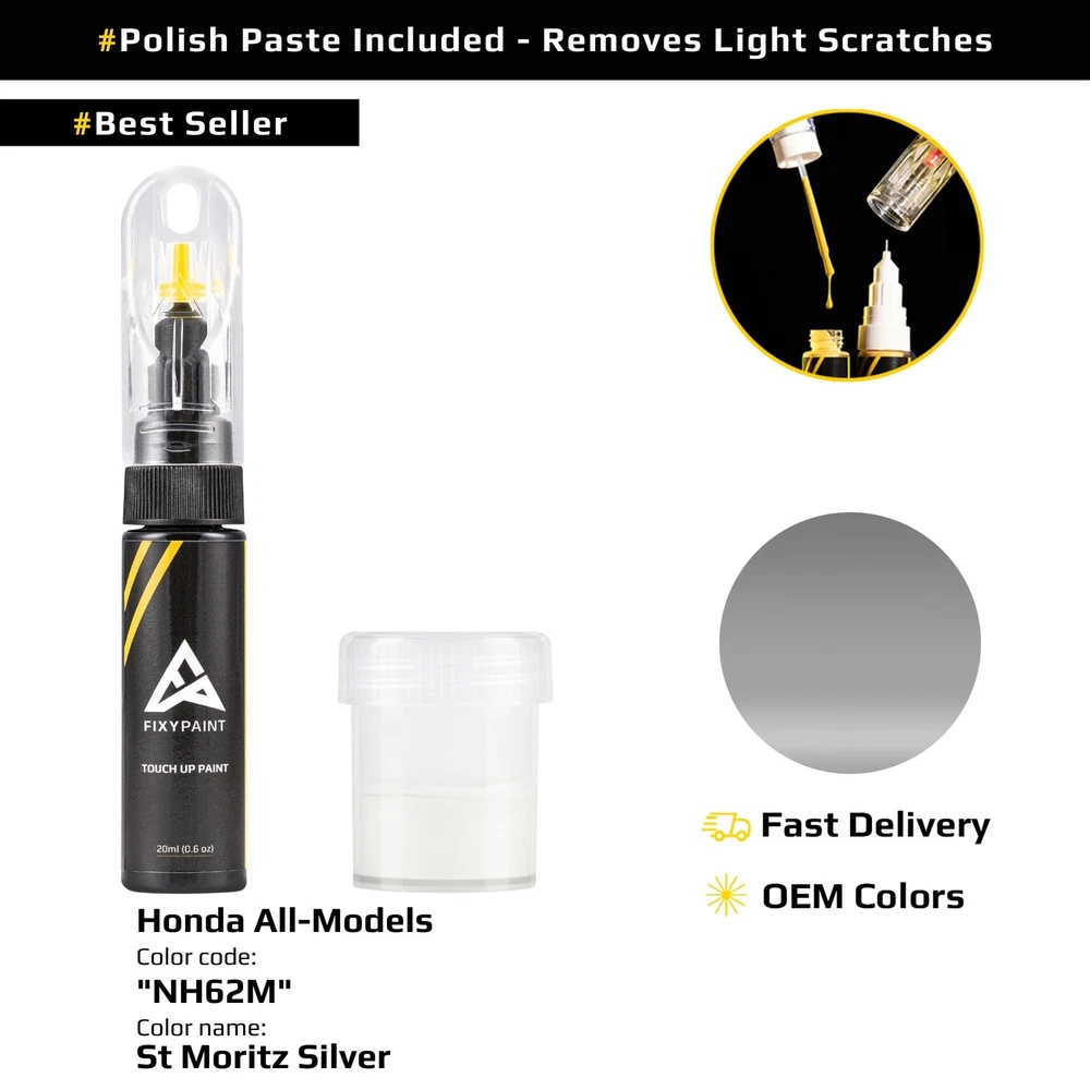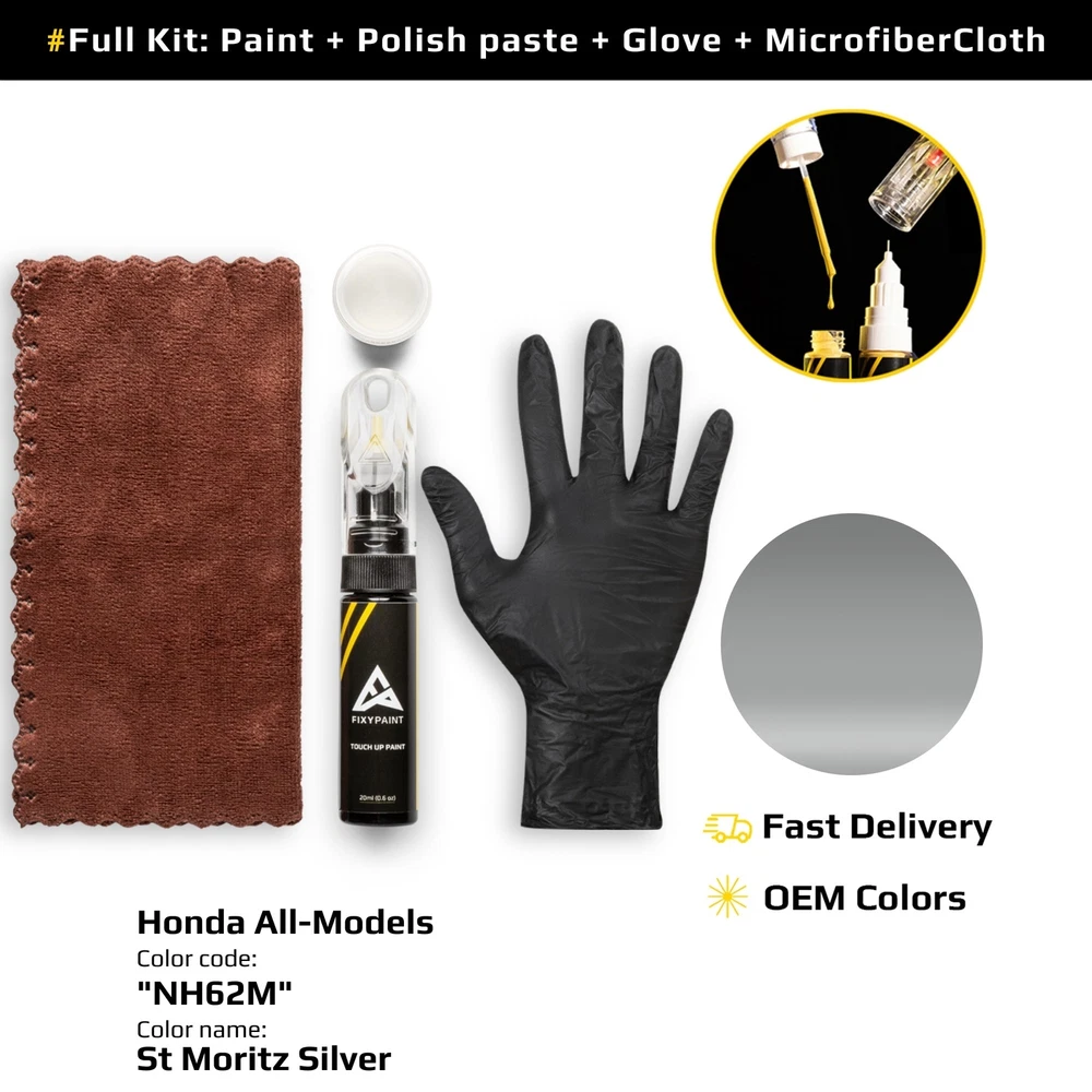 Paint Type: Base Coat Year: 1979-1981 Country/Region of Manufacture: Germany Application Site: Body Additional Color Codes: NH62M Compatible Make: for Honda Features: Factory Color Match Manufacturer Color Name: St Moritz Silver Type: Touch-Up Paint Compatible Model: All Models MPN: "NH62M" Application Type: Brush & Paint Pen Additional Color Names: St Moritz Silver Brand: FixyPaint Manufacturer Paint Code: NH62M Volume: 20ml(0.63oz)