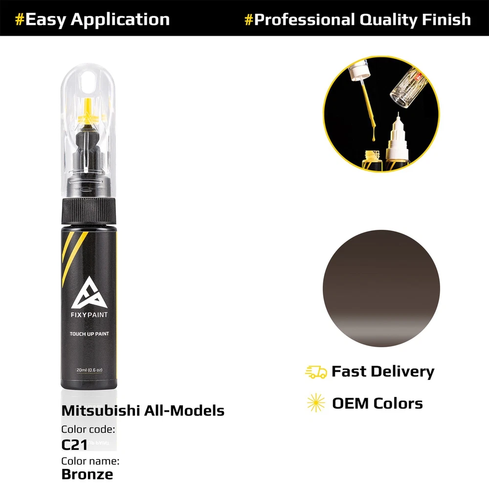 MPN: "C21; CMC10021" Features: Factory Color Match Country/Region of Manufacture: Germany Volume: 20ml(0.63oz) Type: Touch-Up Paint Manufacturer Paint Code: C21; CMC10021 Application Site: Body Additional Color Names: Bronze, Brown, 琥珀棕 Application Type: Brush-on, Paint Pen Additional Color Codes: C21; CMC10021 Brand: FixyPaint Year: 2017 - 2024 Compatible Model: All Models Manufacturer Color Name: Bronze Paint Type: Base Coat Compatible Make: for Mitsubishi