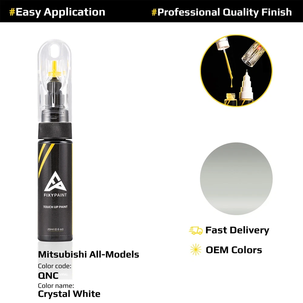 Application Type: Brush-on, Paint Pen Type: Touch-Up Paint Features: Factory Color Match Additional Color Names: Crystal White Brand: FixyPaint Manufacturer Paint Code: QNC Additional Color Codes: QNC Paint Type: Base Coat Volume: 20ml(0.63oz) Country/Region of Manufacture: Germany Compatible Model: All Models Year: 2023 - 2024 MPN: "QNC" Application Site: Body Manufacturer Color Name: Crystal White Compatible Make: for Mitsubishi