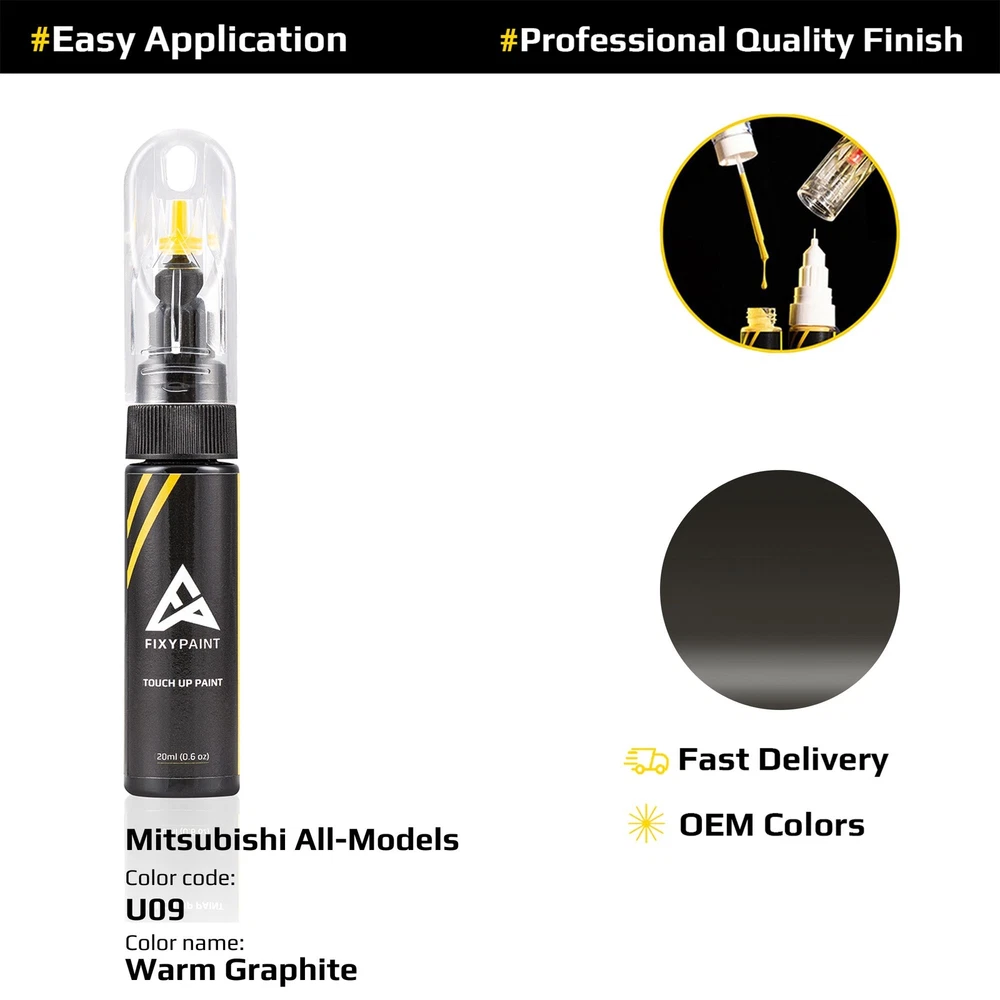 Application Type: Brush-on, Paint Pen Application Site: Body Manufacturer Color Name: Warm Graphite Brand: FixyPaint Compatible Make: for Mitsubishi Features: Factory Color Match Manufacturer Paint Code: U09; CUU10009 Paint Type: Base Coat Year: 2010 - 2011 Additional Color Codes: U09; CUU10009 Volume: 20ml(0.63oz) MPN: "U09; CUU10009" Country/Region of Manufacture: Germany Compatible Model: All Models Additional Color Names: Warm Graphite, Carbon Type: Touch-Up Paint