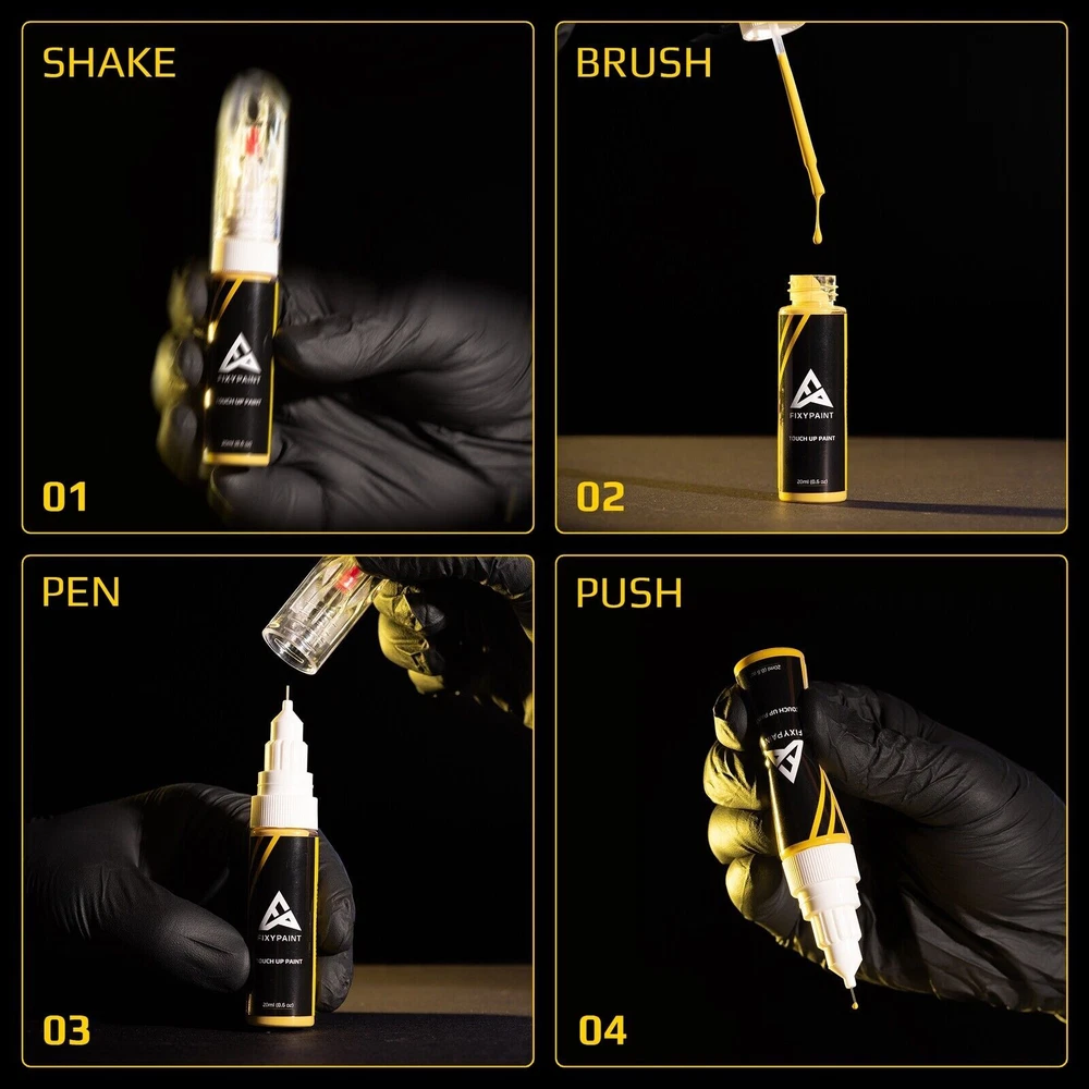 FixyPaint Touch-Up Paint Kit Easily repair scratches, chips, and minor imperfections with the FixyPaint OEM Color-Matched Kit . Designed for quick, simple DIY use, it includes everything you need to restore your car’s finish. What’s Included: OEM Color-Matched Paint: Perfectly matches your car’s specific paint code. Dual Applicator: Precision pen for fine scratches and brush for larger chips. Polish Paste: Smooths out repairs and makes light scratches disappear. Microfiber Cloth: For a clean, polished finish. Protective Glove: Keeps your hands clean during application. Key Features: Quick & Easy Repairs: DIY-friendly with professional results. Fast-Drying Formula: Repairs are ready in no time. Complete Kit: Everything included for a hassle-free repair. Versatile Use: Ideal for scratches, chips, and scuffs. Important Information: Color Variations: Photos may appear slightly different due to lighting, screens, or your car’s age. Always confirm your vehicle’s paint code for the best match. Blending Disclaimer: Slight shade differences typically blend naturally over time. Legal Notice: Unauthorized use or reproduction of FixyPaint images is strictly prohibited and may result in legal action. Revive your car's finish fast. Our OEM color-matched touch-up paint is easy to apply, quick-drying, and delivers lasting, showroom-worthy shine. Description