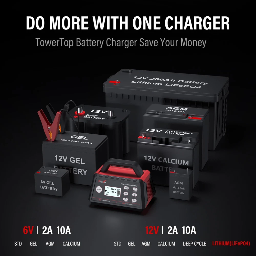 Efficient, Energy-Saving, and Fast Charging: The TowerTop Trickle Charger offers 3 adjustable current settings (2A/10A/AUTO) to meet your diverse needs. With a max charging current of 10A, you can fully charge a 25Ah battery in under 2 hours. Achieving an 85% charging efficiency (industry average 75%), this charger is more efficient, increasing charging speed by 647% compared to 2A chargers. Not only is it energy-saving, but it also saves you a significant amount of waiting time Fully Automatic Charging: The charger automatically recognizes charging. If you forget to press the start button, it will start charging automatically after 30 seconds. After reaching full charge, it switches to pulse repair mode and turns off the screen to save energy, maintaining the battery at an appropriate voltage level for safe, long-term storage. When the battery voltage drops too low, the charger automatically restores full output power and switches back to pulse maintenance mode after full charge. The charger also has a memory function to remember the last settings, ensuring uninterrupted charging even during long-term use without worrying about power outages. All-in-One Compatible Design: Designed for 6V and 12V sealed lead-acid batteries in cars, boats, RVs, power sports, and deep-cycle batteries, including 12V calcium and lithium (LiFeP04) batteries, as well as 6V and 12V lead-acid batteries, including STD, AGM, GEL, Wet, MF, EFB, and deep-cycle batteries. HD LCD Screen and 8-Stage Intelligent Charging: With true 8-stage smart charging (desulfurization, soft start, bulk charge, absorption, analysis, repair, float, and pulse maintenance), it optimizes battery life and repairs batteries without overcharging or damaging them. The HD LCD screen allows you to view the charging stage and parameters at any time, keeping you informed of the charging status. Battery Repair: Independent desulfurization and repair buttons allow you to manually desulfurize and repair your battery to restore lost battery performance, helping to revive old/idle batteries and extend battery life. If your battery cannot be charged, you can try the "repair" mode to fix it. Note: It cannot repair completely drained batteries. Multiple Protections and Winter Mode: The charger provides multiple protections to ensure safe use, including spark-proof, reverse polarity, overcharge/discharge, overvoltage, overcurrent, overload, overheating, current backflow, short circuit, etc. The upgraded cooling system improves performance. Winter mode increases the charging voltage by +0.2V based on the original charging voltage, improving battery activity for more thorough charging in low-temperature conditions.