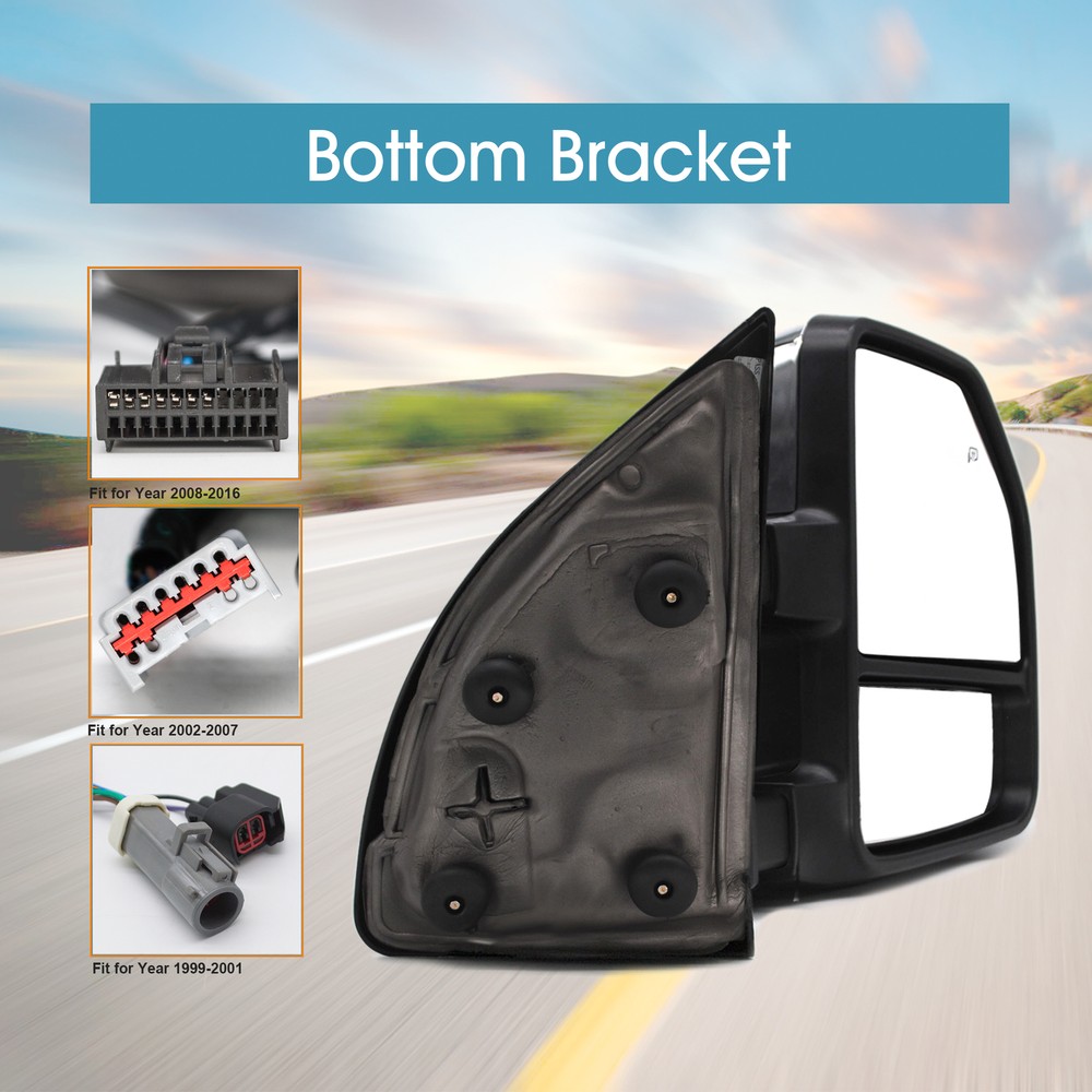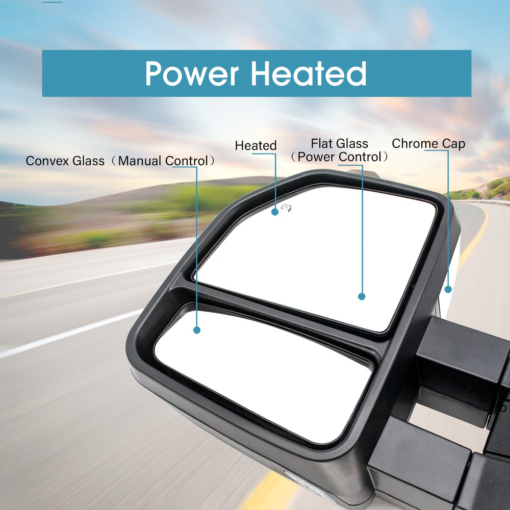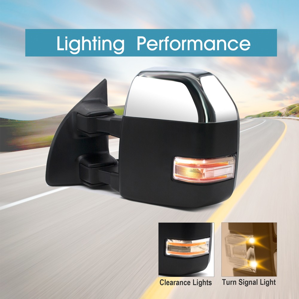 Product Description Detailed description of the product Specifications : Condition New Number Of Pieces 2 Fold Away Manual Fold Warranty 1 Year Color Chrome Location Passenger Right + Driver Left Side Features: LED Turn Signal Light Power Adjustment Mirrors Heating Element to Defrost Mirrors Clearance Light Extend the length of the towing mirror 24" Fits: 1999 2000 2001 2002 2003 2004 2005 2006 2007 2008 2009 2010 2011 2012 2013 2014 2015 2016 Ford F-250 F-350 F-450 F-550 Super Duty Tow Mirrors Note : These mirrors will only work properly on vehicles with these exact options. If your vehicle does not have the options listed, these mirrors may not function properly. No installation guide. Professional installation is highly recommended. In the event the item should fail due to manufacturing defects during intended use, we will replace the part by free.(1 Year Warranty) 99-01 models adapter included, for power and heated mirror function. Lights require the buyer's own wiring. If you encounter any problems, please contact us and we will provide you with solutions. Thank you! Payment Shipping Returns Contact Us PayPal is our preferred method of payment for all of our eBay sales. For customer service please contact us via eBay MessagesImmediate payment via PayPal is required for all Buy It Now items. If you need special arrangements, please contact us through eBay messages. Generally, all goods will be shipped within 24 hours after the payment on the working day (except for goods sent from China). If you want to cancel the order or change the address, please contact us within 6 hours after payment, otherwise we will not be responsible. It takes 3-5 working days for logistics and transportation to be delivered. If you are not satisfied with your purchase, you may return it, for a refund or replacement - subject to the following: Contact us through eBay messages or the returns link to receive a Returned Merchandise Authorization (RMA) number to ensure proper handling of the return and/or replacement. In order to be eligible for a full refund, less shipping expenses, your returned merchandise must be in its original new condition, as shipped, with all packaging, manuals, and paperwork intact and unaltered. Items which have been opened are returnable, however they will carry a restocking fee. If that product is returned for a refund, the shipping expenses incurred, will be deducted from the refund. If an item is refused, the carrier bills us for shipping both ways, and these expenses incurred on your behalf need to be deducted from your refund If you have a question about a part you should contact us before buying.And If you have any questions after purchase, please contact us and we will provide a satisfactory solution. Payment PayPal is our preferred method of payment for all of our eBay sales. For customer service please contact us via eBay MessagesImmediate payment via PayPal is required for all Buy It Now items. If you need special arrangements, please contact us through eBay messages. Shipping Generally, all goods will be shipped within 24 hours after the payment on the working day (except for goods sent from China). If you want to cancel the order or change the address, please contact us within 6 hours after payment, otherwise we will not be responsible. It takes 3-5 working days for logistics and transportation to be delivered. Returns If you are not satisfied with your purchase, you may return it, for a refund or replacement - subject to the following: Contact us through eBay messages or the returns link to receive a Returned Merchandise Authorization (RMA) number to ensure proper handling of the return and/or replacement. In order to be eligible for a full refund, less shipping expenses, your returned merchandise must be in its original new condition, as shipped, with all packaging, manuals, and paperwork intact and unaltered. Items which have been opened are returnable, however they will carry a restocking fee. If that product is returned for a refund, the shipping expenses incurred, will be deducted from the refund. If an item is refused, the carrier bills us for shipping both ways, and these expenses incurred on your behalf need to be deducted from your refund Contact Us If you have a question about a part you should contact us before buying.And If you have any questions after purchase, please contact us and we will provide a satisfactory solution. Related Products Chrome Tow Mirrors Power Turn Signal For 2017-20 Ford F350 F450 Super Duty LH+RH Towing Mirrors Power Heated For 2008-2016 Ford F350 Super Duty LH+RH Chrome Cap Chrome Towing Mirrors Power For 1999-2001 Ford F250 F350 F450 F550 SD Left+Right Pair Side Tow Mirrors Power Heated Fits Fits 2007 Ford F350 F450 F550 SD Chrome Pair Towing Mirrors Manual Folding Fits 1999-2016 Ford F-250 F-500 Chrome Cap Tow Mirrors Power Turn Signal For 2001-2016 Ford F-250 F-350 F-450 SD Left+Right Heated √ √ √ √ NO √ Power √ √ √ √ NO √ Turn Signal Light √ √ √ √ NO √ temperature sensor √ NO NO NO NO NO Puddle Light NO √ √ √ NO √ Clearance Light √ √ √ √ NO √ housing color Chrome Chrome Chrome Chrome Chrome Black folding Manual Manual Manual Manual Manual Manual fit for 17-20 Ford F-250 F-350 F-450 F-550 08-16 Ford F-250 F-350 F-450 F-550 99-01 Ford F-250 F-350 F-450 F-550 99-07 Ford F-250 F-350 F-450 F-550 99-16 Ford F-250 F-350 F-450 F-550 99-16 Ford F-250 F-350 F-450 F-550 [22 Pin Plug] On Dec 12, 2024 at 13:27:38 PST, seller added the following information: