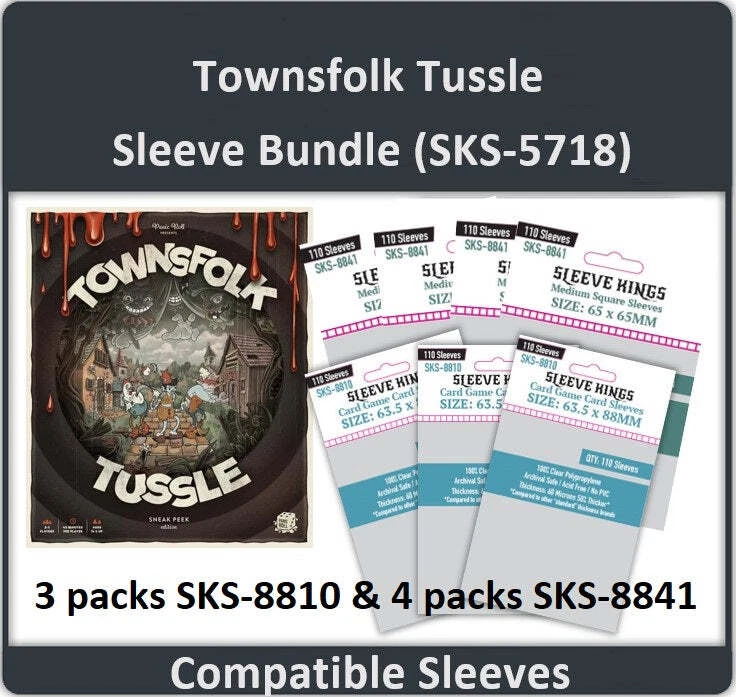 This is all the sleeves for the game Townsfolk Tussle Compatible Card Sleeve Bundle (8810 X 3 + 8841 X 4) *Thicker than any other "Standard" Sleeves- Most "Standard Sleeves are 40 microns thick, a few are even 50 microns. Ours are 60-microns thick! That is 50% more than most! *10% more sleeves than the other guys -Most sleeves come 100/pack. We are the only brand offering 110 per pack! 10% more FREE! Note we have calculated the number of packs for this bundle based on THIS page from BGG. ** Note Game Titles and their intellectual property rights are © and TM of their respective rights holders, no challenge to these rights is expressed or implied. Compatibility claims only extend to the physical size of the cards in each respective game and no claim to endorsement or authorization by the respective rights holders is expressed or implied by Sleeve Kings. Our products are compatible with the respective games only and all rights are reserved by the respective rights holders.
