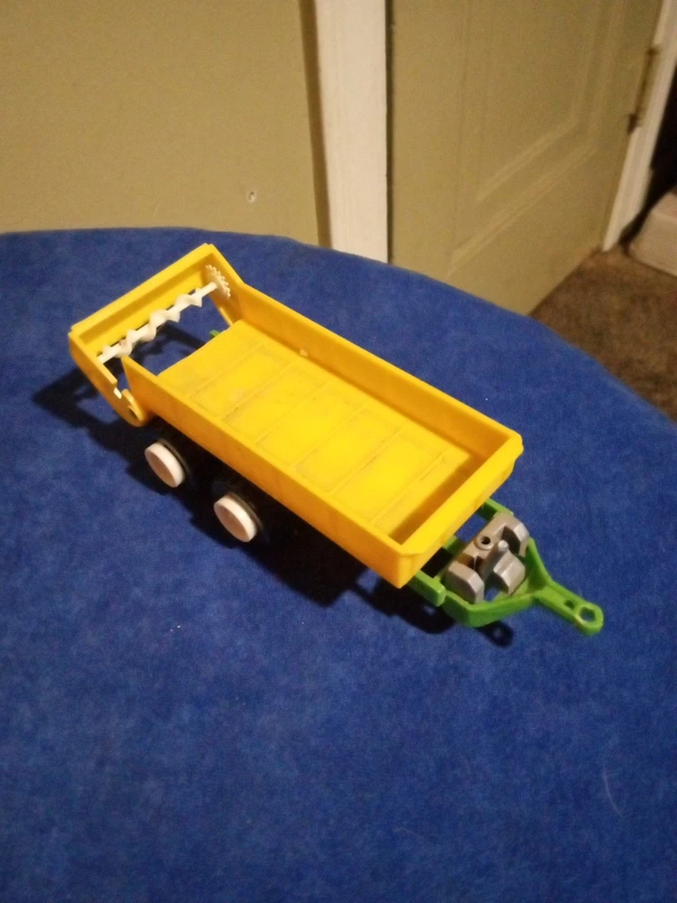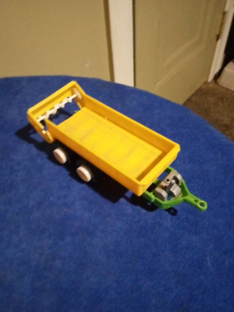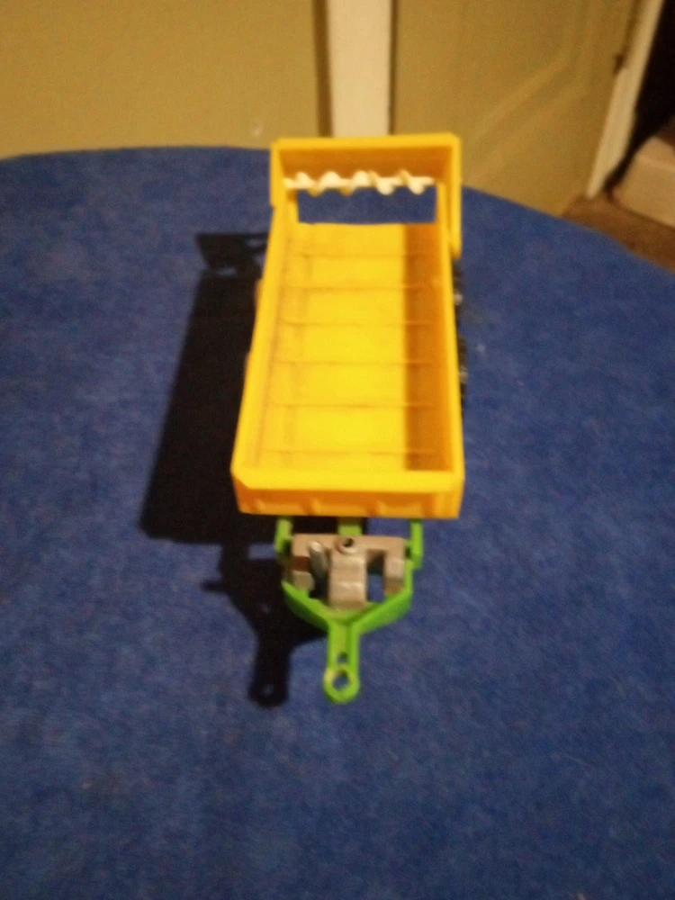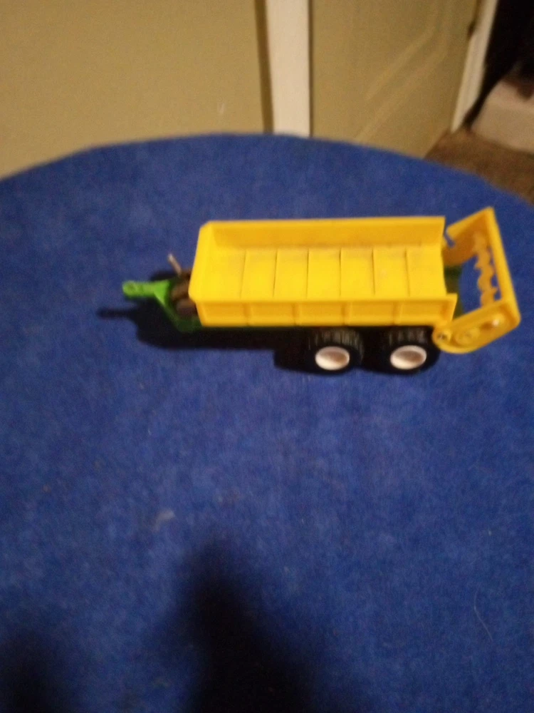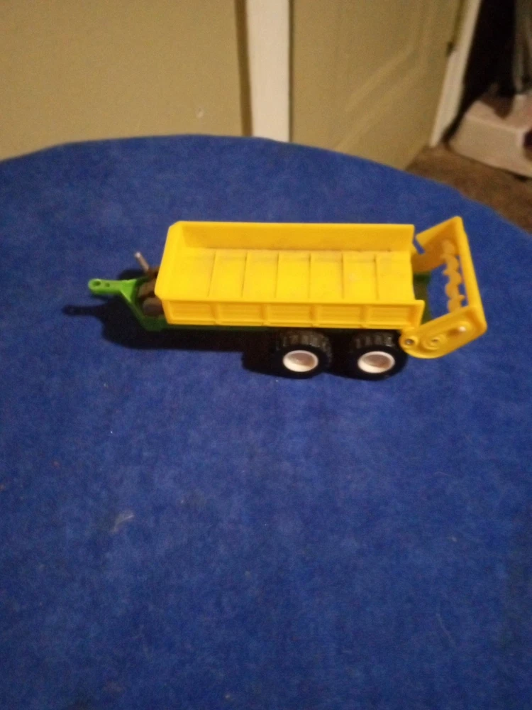 This is a 1:16 scale John Deere manure spreader toy from the ERTL Farm Country series. It is made of die-cast material in green color, with moveable parts and a hitch for attachment. The toy, suitable for children aged 8 years and above, features a farming theme and is part of a character family known as the farmer. T91