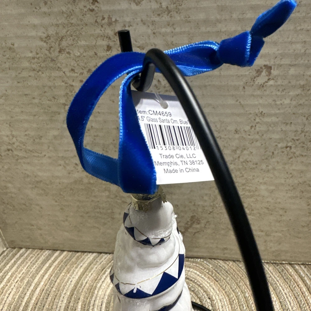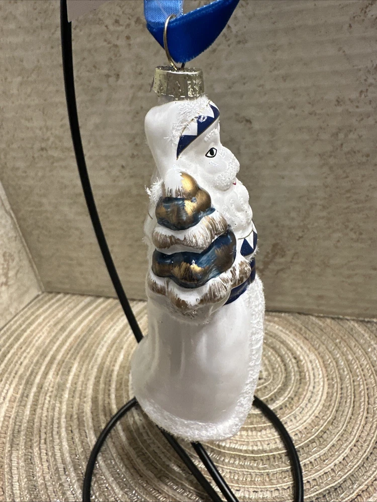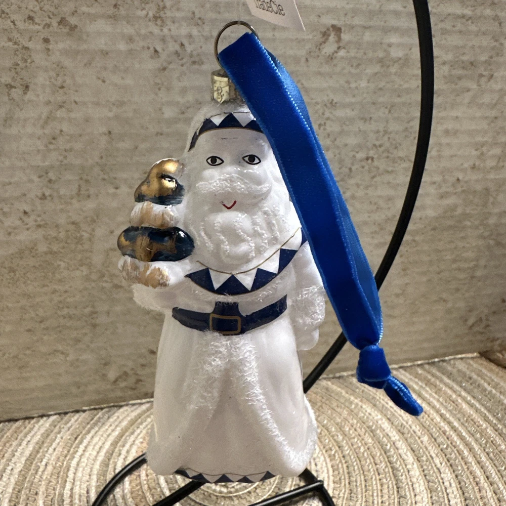 Add a touch of elegance to your Christmas decor with this exquisite Trade Cie glass ornament featuring a charming Santa Claus design. The blue and white color scheme and intricate Chinoiserie pattern make this ornament a unique and beautiful addition to your holiday collection. This handmade, artist-designed ornament is embellished with delicate details and hangs gracefully on any Christmas tree. Perfect for the holiday season, this Santa Claus ornament is a must-have for any festive decor enthusiast.