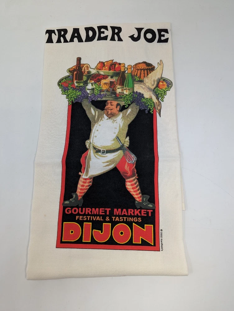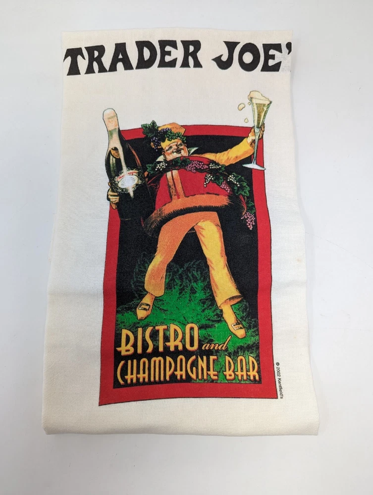 Please see all images. Towels are new, never used and out of their original package. There are a few small spots or stains on them. Item is vintage, 2002. Add a touch of elegance to your kitchen with this set of two Trader Joe's Tea Towels. Made of 100% cotton flour sack material, these off-white towels are perfect for cleaning up spills and drying dishes. The towels feature a gourmet festival and bistro champagne bar theme, making them a great addition to any kitchen decor. Measuring 28" x 28", this set includes two towels both with their own unique design. Shop now and add these beautiful kitchen and tea towels to your collection!