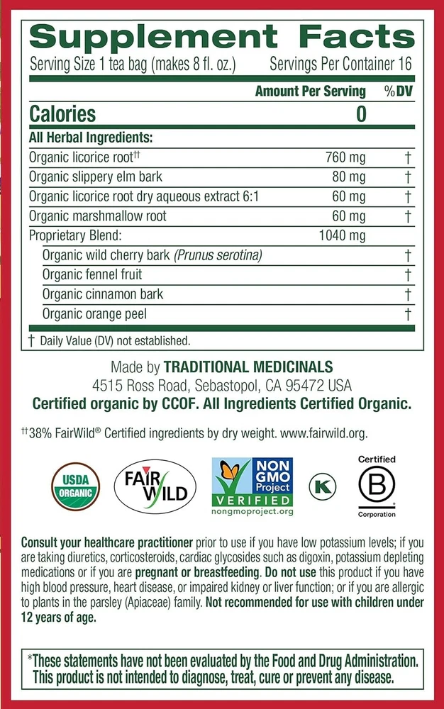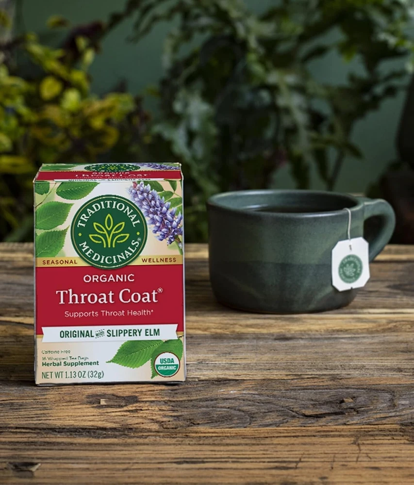 Traditional Medicinals Tea, Organic Throat Coat, Supports Throat Health, 16 Tea About this item : Herbal Power: Supports throat health Taste: Sweet and silky, with a distinct licorice taste Formula: The slippery elm tree has played an important role in Native American herbal medicine for hundreds of years. Inspired by its traditional use, we source our slippery elm domestically, where families collect the bark sustainably by hand to protect the trees for future generations. Product Description Sustainability: First solar-powered and TRUE Zero Waste certified tea factory in US. As a Certified B-corp, we prioritize and measure our environmental, social and economic impact.