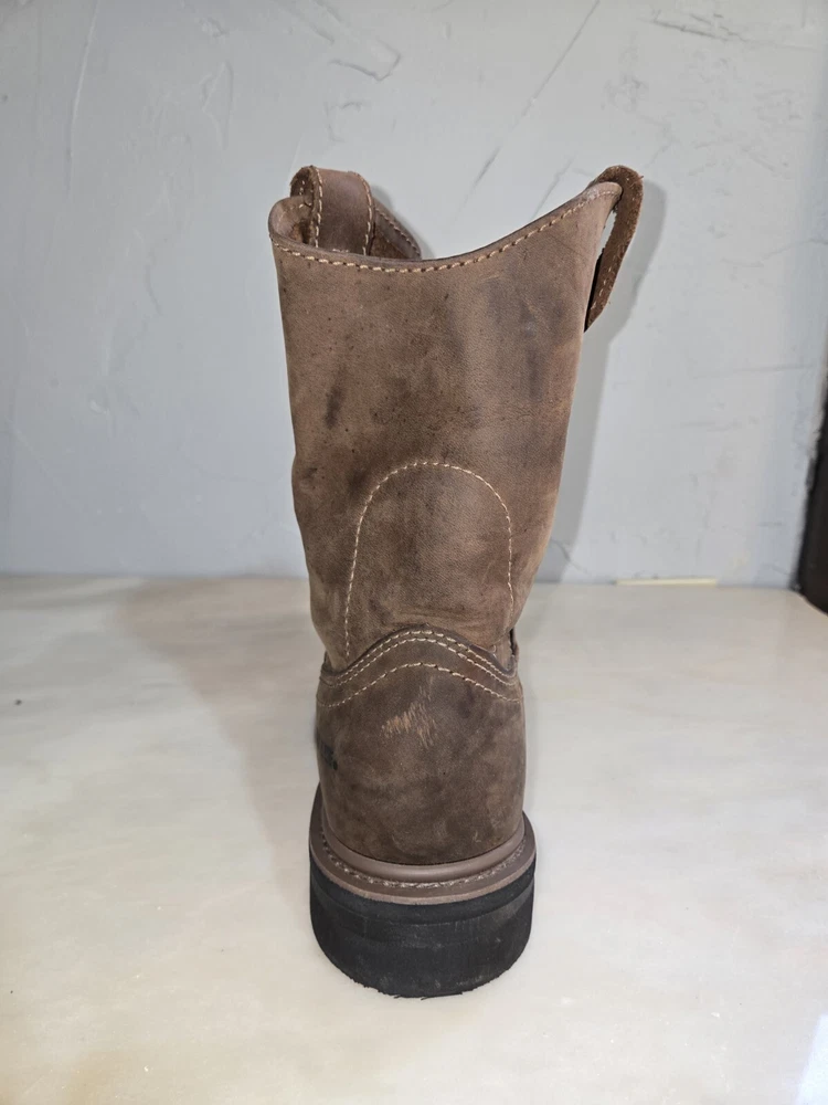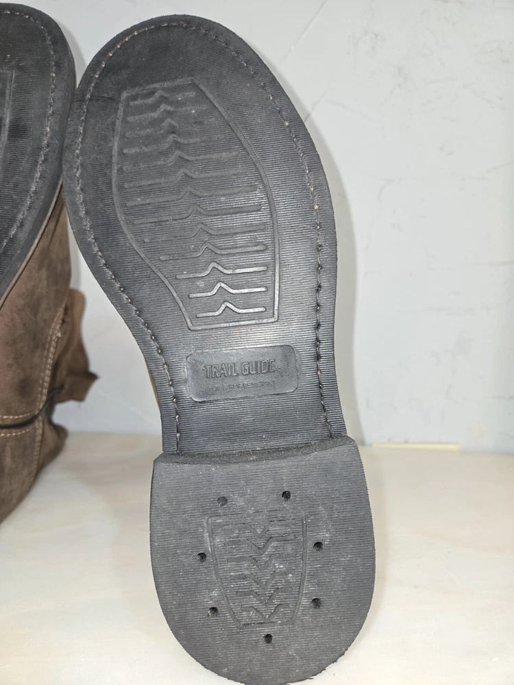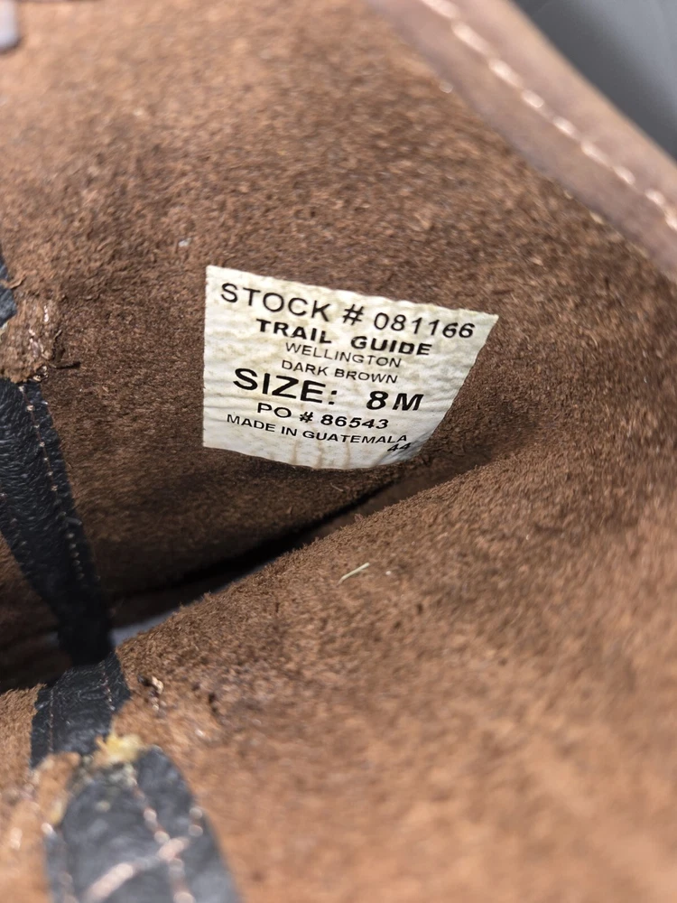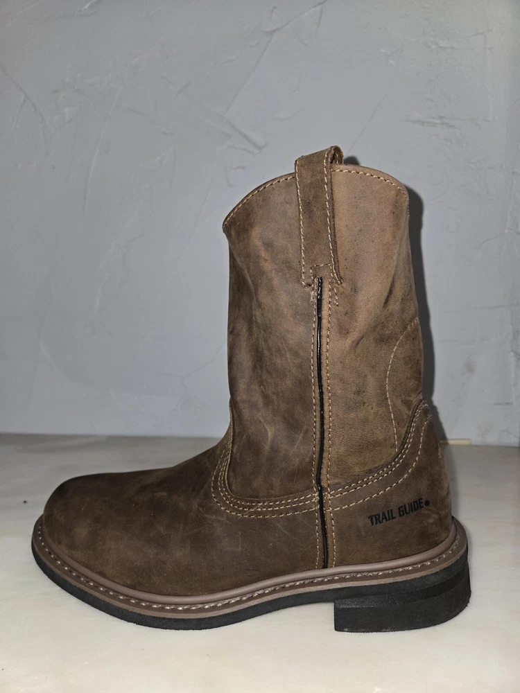 These Trail Guide Wellington leather workwear boots in dark brown with a round toe shape and pull-on closure, they're perfect for casual or workwear occasions. The boots feature pull-on tabs, slip-resistant and oil-resistant properties, making them ideal for winter, fall, and spring seasons. The mid-calf shoe shaft style and solid pattern. The boots are made of leather and have a foam insole material. They're available in men's size 8 and were manufactured in Guatemala. These boots are part of the Trail Guide product line and are perfect for those who love the motorcycle, equestrian, horse, work, or cowboy theme.