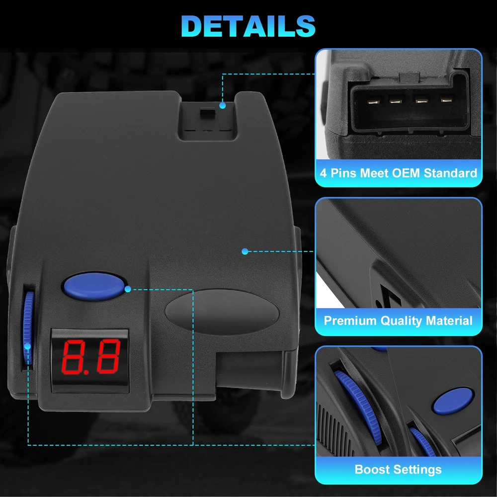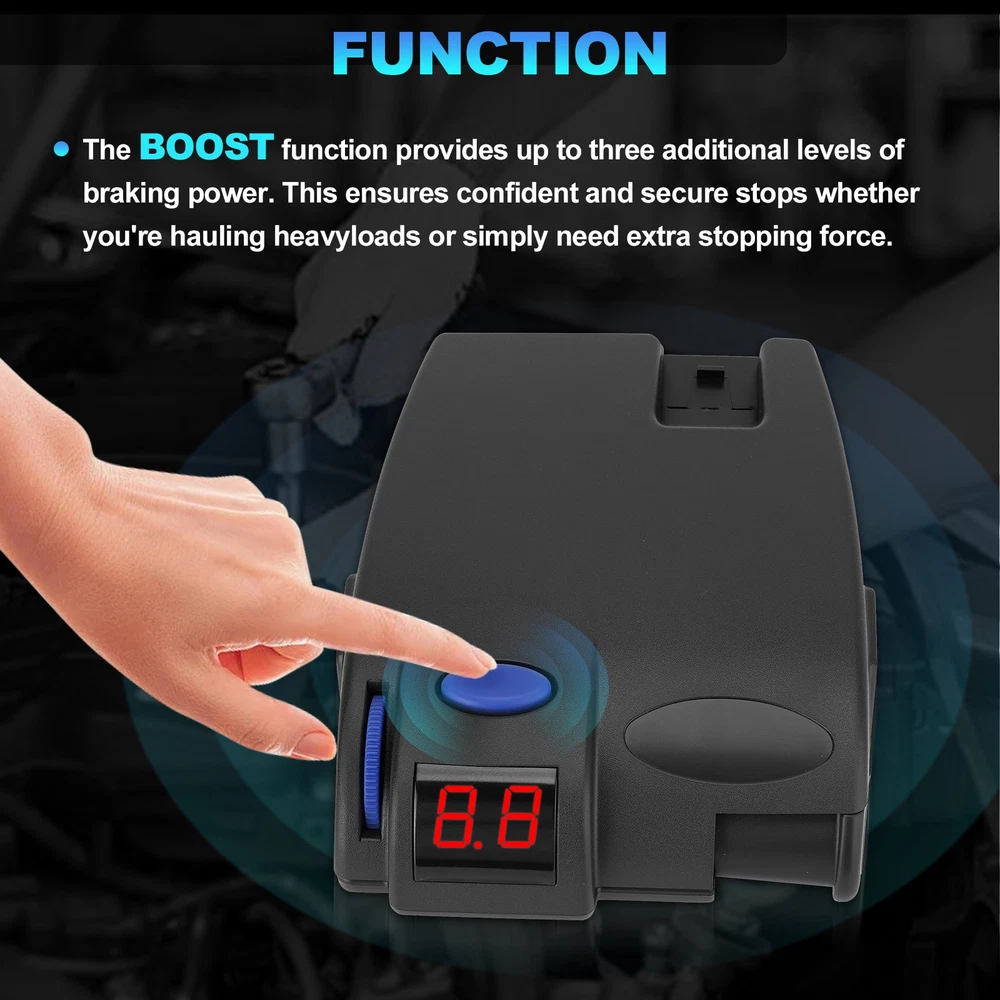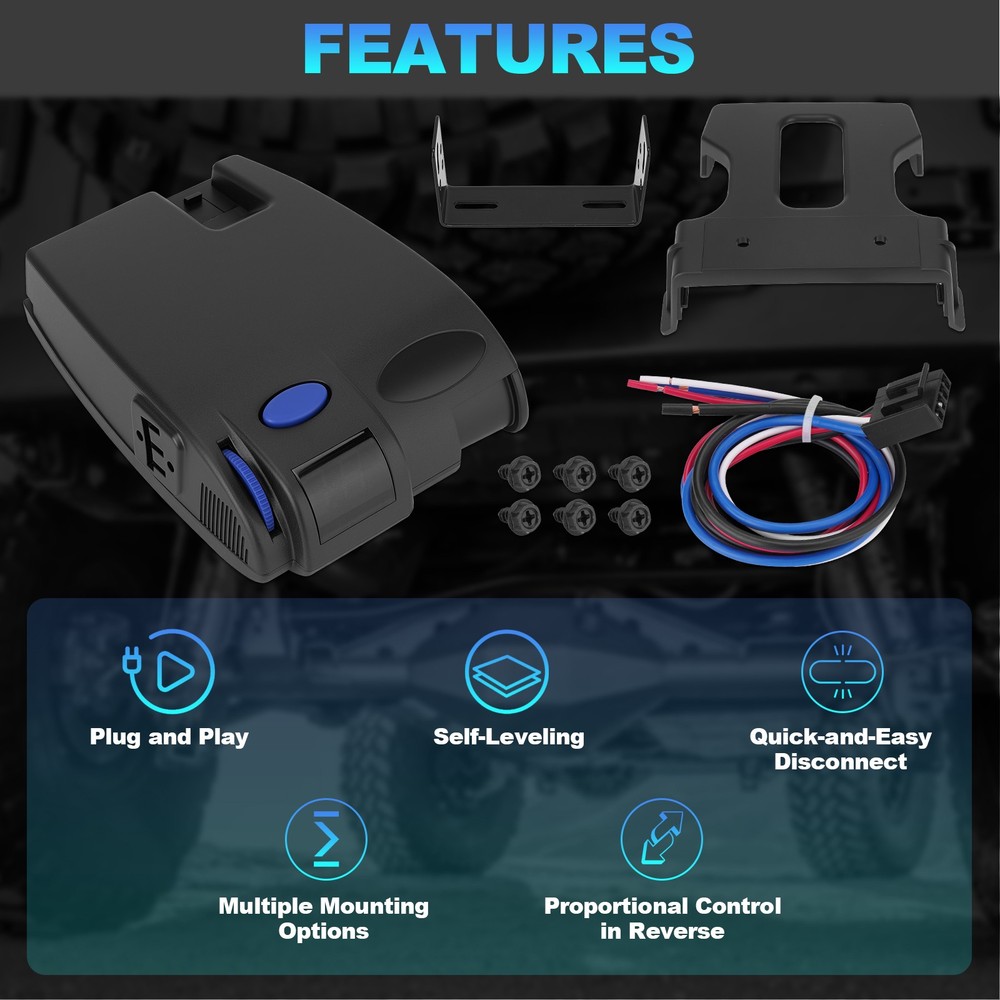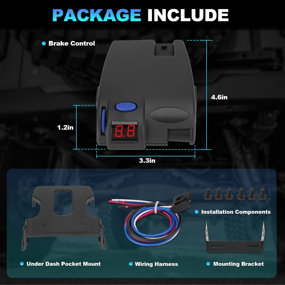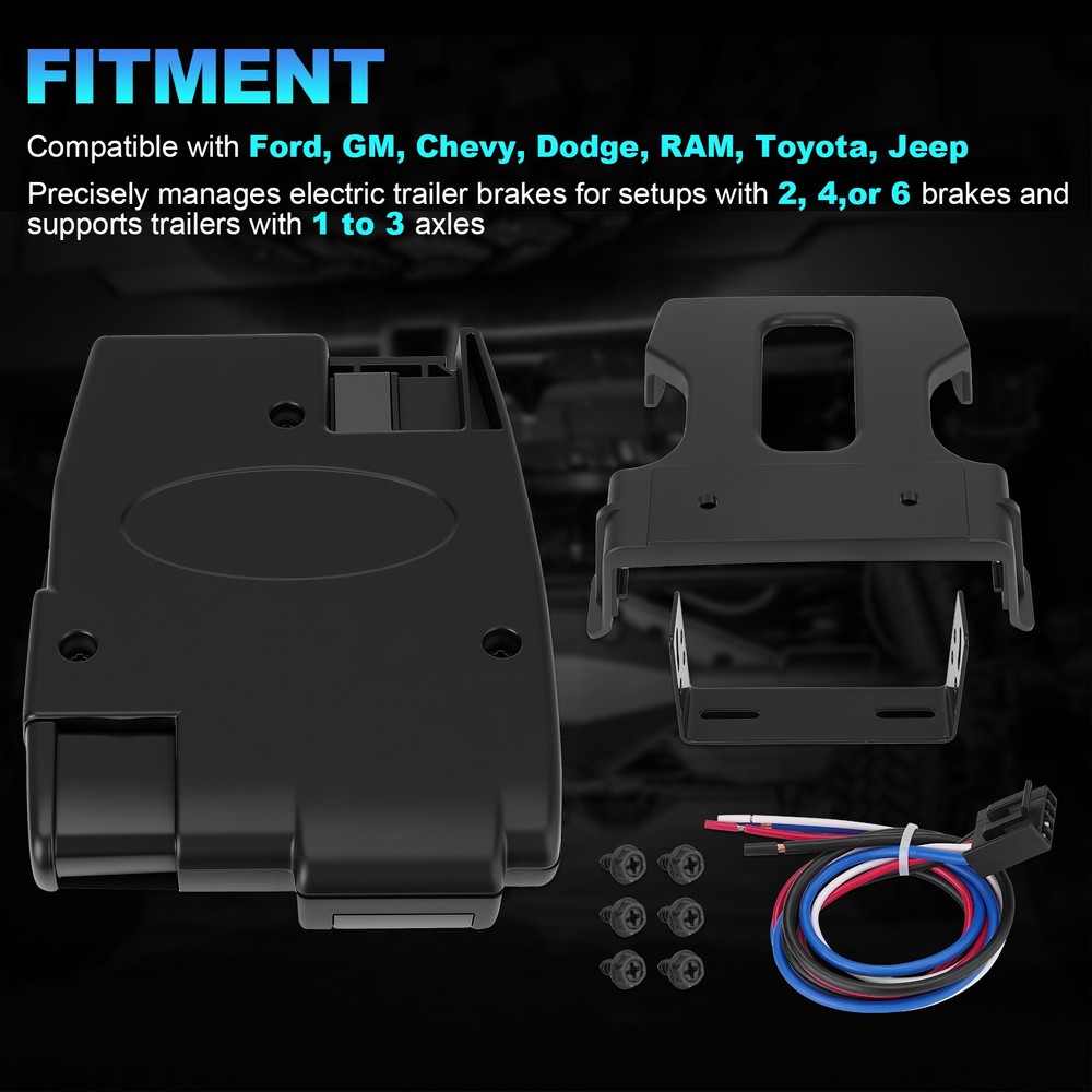 Trailer Brake Controller 1-3 Axles For Ford Chevy Dodge Jeep LED Display 90160 Product Description FITMENT: Compatible with Ford, GM, Chevy, Dodge, RAM, Toyota, Jeep COMPREHENSIVE TRAILER BRAKE CONTROL: Precisely manages electric trailer brakes for setups with 2, 4,or 6 brakes and supports trailers with 1 to 3 axles INTUITIVE LED DISPLAY & SIMPLE CONTROLS: The clear LED display provides real-time feedback on braking power and settings. User-friendly buttons make it easy to adjust braking intensity and perform manual overrides for optimal control in any towing situation EASY INSTALLATION: Designed for a hassle-free setup that requires no complex wiring or professional installation. Simply plug the unit into your vehicle's dedicated trailer brake controller port for a quick and reliable connection.Plug and play SAFE & RELIABLE TOWING PERFORMANCE: Provides dependable and proportional braking. It automatically adjusts trailer brake force based on your vehicle's deceleration, significantly enhancing safety and reducing stopping distances Package included: 1 x Trailer Brake Controller Kit Note: 1.We provide clear pictures, measurements where possible. Please check as much as possible to make sure the item is the one that you need. 2.Please allow 1-10mm deviation due to manual measurement. 3.Due to light and screen difference, the item's color may be slightly different from the pictures. 4.make sure that the size and shape of the product matches your car. 5.No installation guides are included, we highly recommend to seek professional installation. Any damage during installation will not be refunded.