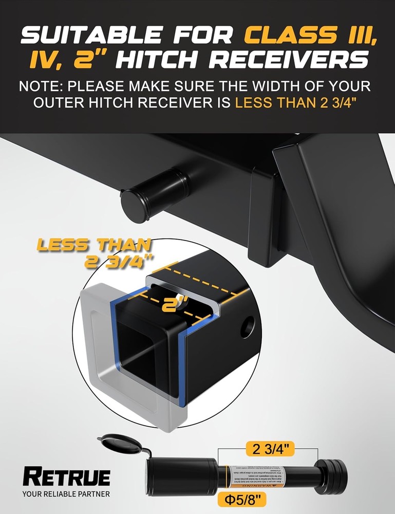 Free eBay listing template designed by dewiso.com RETRUE Trailer Hitch Receiver Pin Lock, Suitable for 2 Inch Receiver, 5/8" Dia Hitch Lock for Securely Locking Trailer Hitch with Two Keys, Black FREE AND FAST SHIPPING! RETRUE Trailer Hitch Lock Design: 5/8 Inch diameter trailer hitch lock pin with Super Extra Long Effective Length 2 3/4 Inch. Specially for big towing vehicle, truck, 2" hitch receiver or Class III IV hitches. Note: For your convenience please verify dimensions and length of pin you need before purchase Durability: The lock cylinder is made of high quality zinc alloy tubular. Its anti-theft design can resist huge impacts from different kinds of external forces. Adapted rubber key slot cap is all-weather proof keeps keyhole safe and clean Easy to Install and Use: This hitch lock keeps your trailer hitch securely locked, giving you peace of mind wherever you go The Fitment of Locking Hitch Pin: Class III IV Hitches, Hitch Bike Rack Tray Ball Tow Rope for Trailer Truck Car Boat What Will You Get: The pin lock covered with high quality solid steel and black electrophoretic paint. It is quite strong and withstand 30,000 lbs, twice as much as a regular pin lock. Come with 4 noise reducing rubber rings. It is from RETRUE Your reliable partner. 24/7 Product We offer a 30-Day Return Policy on items which you are not completely satisfied with. You have the option for a full-refund or an exchange of the item. No returns are available on items shipped outside of the US . Shipping We offer Free Shipping to the US and ship within 2 business days of payment, usually sooner. We use UPS express shipping. That's why your products are usually delivered within 3 days . Contact We try our very best to make sure every customer is completely satisfied. If there's a problem , message us! We're happy to help. 24/7 live chat available.