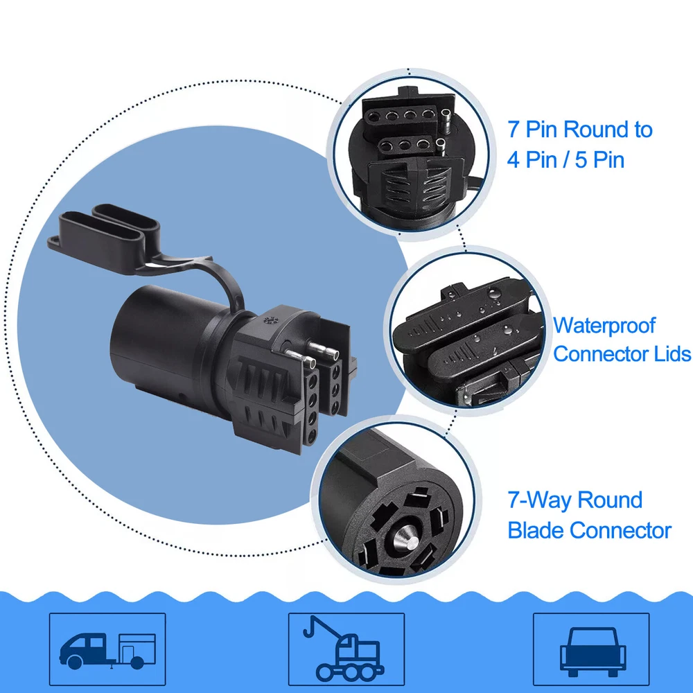 7 Pin Round to 4 Pin and 5 Pin Flat Blade Trailer Adapter Trailer Light Plug Adapter Weatherproof Car RV Boat Truck Adapter Plug 2-in-1 Design 12V Description Name: 7 Way to 4Pin and 5 Pin Plug Adapter Material: Plastic Waterproof Cap Material: Rubber Number of insert cores: 5pin and 4pin 7 way terminal: brass 4 way and 5 way terminal: brass with tin-plated terminal Main function: Connect and transmit electrical signals between the tractor and the towed vehicle. Application range: commercial vehicle/trailer/RV/car/ship, etc. Package included:1 x 7Pin to 4Pin and 5Pin Trailer Plug Adapter Features: ✅ 7 Pin to 4 and 5 Pin Trailer Adapter - The trailer plug adapter adopts the 2 in 1 design, which combines 4 way plug with 5 way plug, and can be used by most trailers, easily convert 7 way round connector into 5 way and 4 way round connector ✅ Strong and Durable - The plug with copper pin contacts, better electrical conductivity. With a strong plastic casing, it is highly waterproof, wear-resistant, flame retardant and cold resistant, and extremely durable ✅ Completely Dustproof Design - With the two dust covers at the plug, it can prevent the plug from being infected with dust. When only one of the plugs is used, the other can be covered to better protect it ✅ Easy Installation - Simple Plug & Play design eliminates the need for cutting or splicing, hassle free setup, easy to install and remove; 7 pin to 4 pin / 5 pin trailer adapter,also can be better grip when plugging in or unplugging trailer wiring. ✅ Wide Application - 7 pin round to 4 pin / 5 pin flat trailer plug adapter is widely used in trailers, RVs, cars, boats, etc. you could choose to tow 4 way or 5 way trailer with one adapter, adding versatile towing options for your vehicle ✅ What you'll get - 1 x 7 way to 4 way and 5 way plug adapter Function: Easily convert 7 way plug into 5 way and 4 way plug! The trailer plug adapter provides 4 way and 5 way plugs, which are suitable for most trailers, thus solving the problem that you always change adaptor. It is made of high-quality copper core and plastic casing, which greatly improves the electrical conductivity, at the same time, can achieve waterproof, dustproof, wear-resistant. It can be used on rainy days without any problems. There are two dust covers at the plug, which designed to provide better protection for the 4 way and 5 way plugs. Plug and play, no rewiring, very convenient, easy to tow your trailer. Package Includes: 1x 7 way to 4 way and 5 way plug adapter Payment Delivery details Terms of sales About us Contact us Payment 1.We only accept PayPal as payment method. 2.The item will be shipped to buyer’s CORRECT and VERIFIED Ebay Address. 3.We are not responsible for the package lost due to incorrect address. 4.Our price do not including any custom or duty, VAT and local tax. 5.Payment must be received within 7 days of winning the auction 6.Please contact us if you need file an extension for any late payment. Delivery details 1.All item are shipped via DHL eCommerce or USPS Frist Class express Service within 2 business days once full payment is settled.If you can't get your items in time,please contact to us first,we will check and solve it for you soon.We will reply your mail within 24 hours normally. Sometimes have a little delay due to the weekend or holiday.If you can't get our mail after 48 hours,please check your spam or contact to us with other mail address or via ebay. 2.We only ship to confirmed Ebay addresses. Your Ebay address MUST MATCH your Shipping address. 3.If you want to change the address please E-mail us right after you pay for the item. 4.SERVICE TRANSIT TIME is provided by the carrier and excludes weekends and holidays. Transit times may vary, particularly during the holiday season. 5.If you have not received your shipment within 30 days from payment, please contact us. We will track the shipment and get back to you as soon as possible with a reply. Our goal is customer satisfaction! Terms of sales 1.Please contact us via eBay Message if you have NOT received item in 30 days , we will check it with post office, and then resend or refund any missing item. 2.i n the unlikely event that your product is faulty in anyway, you must contact us ASAP and then return it within 7 Days of receipt. 3.Return shipping fee should be paid by buyer if wrong item you bought (wrong model or wrong color) and item is defective. We will provide replacement or refund after we received and confirmation. 4.if you need return, please contact and get an address for return from us, then declare your package as “Return”, write your Ebay ID and item number outside About us 1. Dear buyers, we appreciate your business, if you are satisfied with our service, 2. Please leave us a positive feedback and rate the details of the transaction (Detailed Seller Ratings) with a "PERFECT 5 Star. 3. Your recognition will make us more confident to develop business and serve you better. 4. Our goal is to make sure you are a happy buyer and pleasant shopping with us. Please email us before leaving any 1 or 2 ratings, negative feedback or open any dispute. We understand the concerns and frustrations you might have, and will do our endeavor to resolve the issues. Please give us the opportunity to resolve any problem. Contact us 1. We strive for 100% customer satisfaction on every sale we complete. 2. If, for any reason you are not satisfied with your purchase, please contact us before leaving neutral or negative feedback. We will work with you. 3. We are wholesaler and exporter and we have served thousands of customers from all over the world. 4. Our products are direct from factory , there is no middle man, no high markup, so we can provide quality items yet very competitive price. 5. If you have any questions please contact us by email, most emails are responded within 24 business hours. 6. We work 6 days (Mon to Sat) a week. (Note: Bidders who use free email like AOL, Yahoo, the rep