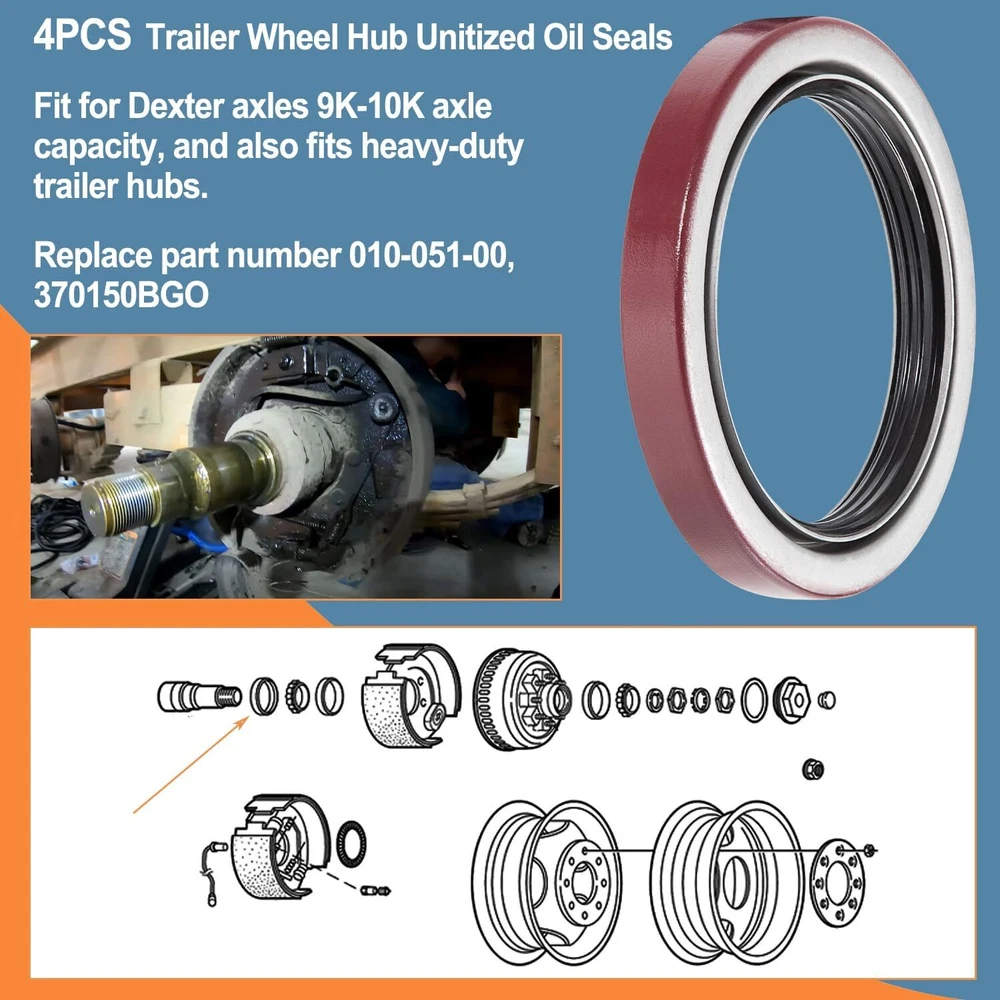 WIDE APPLICATION: The 370150BGO trailer wheel hub oil seals kit is compatible with Dexter axles 9K-10K axle capacity, and also fits heavy-duty trailer hubs. DIMENSION: The unitized trailer oil seal has an inner diameter of 2.875 inches and an outer diameter of 3.88 inches (I.D. 2.875'' x O.D. 3.880''). Compatible with Dexter 9k and 10k general duty hubs, but you will want to check your trailer hub and seal dimensions and seal numbers as well to ensure you are purchasing the correct seals for replacement. SUPERIOR SEALING PERFORMANCE: The unitized oil seals kit is a dual-action seal, the outer part of the seal connects to the hub and remains fixed in place, while the inner part of the seal remains fixed to the spindle and rotates. This makes the seal better protect the hub's bearings and oil from intrusion by water, dust, dirt, or other intrusive materials. MATERIAL: The trailer wheel hub unitized oil seal is made of quality steel and rubber. The unitized oil seal is a dual-action seal and helps prevent the seal from spinning or walking out of the hub bore. Satisfaction Guarantee-- 100% satisfaction guarantee. Please feel free to contact us if you have any questions about our product. On Dec 26, 2024 at 13:35:48 PST, seller added the following information: