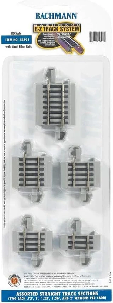 E-Z Track System - Snaps Together, Stays Together on Floors, Tables & Carpets Set Up is Quick, Easy and Fun - No Nails, Screws, or Special Tools Needed Nickel Silver Rail with Gray Roadbed, Designed to Provide Excellent Conductivity and Durability HO Scale 1:87 - Modeled From AAR Track Engineering Dimensions Easy to Use For Both Temporary and Permanent Train Layouts Product Description Snap-Fit E-Z TRACK E-Z TRACK CONNECTOR ASSORTMENT - Contains 2 each .75", 1", 1.25", 1.5" and 2" straight (card) - NICKEL SILVER Rail With Gray Roadbed - HO Scale. Bachmann's exclusive E-Z Track system makes set-up quick, easy and fun. E-Z Track is designed to Snap Together and Stay Together on Floors, Tables and Carpets. This product features Nickel Silver Rail with Gray Roadbed. From the Manufacturer Contains 2 each, .75", 1", 1.25", 1.5" and 2" straight Bachmann's exclusive E-Z Track system makes set-up quick, easy and fun. Nickel Silver Rail. Gray Roadbed. E-Z Track System --Snaps Together, Stays Together on Floors, Tables and carpets.. Nickel Silver Rail. Gray roadbed. E-Z track system--snaps together, stays together on floors, tables and carpets. No nails, screws or special tools needed. Modeled from AAR track engineering dimensions.