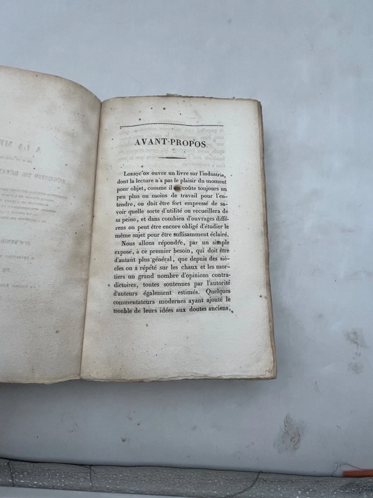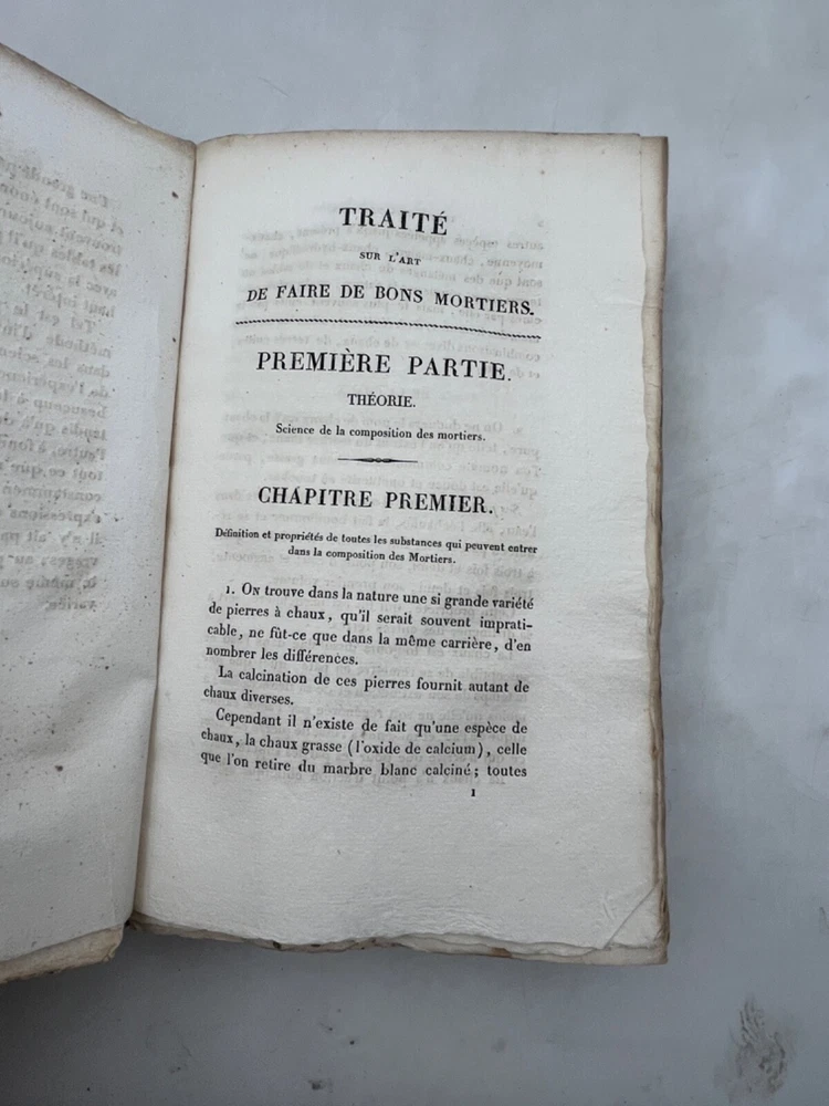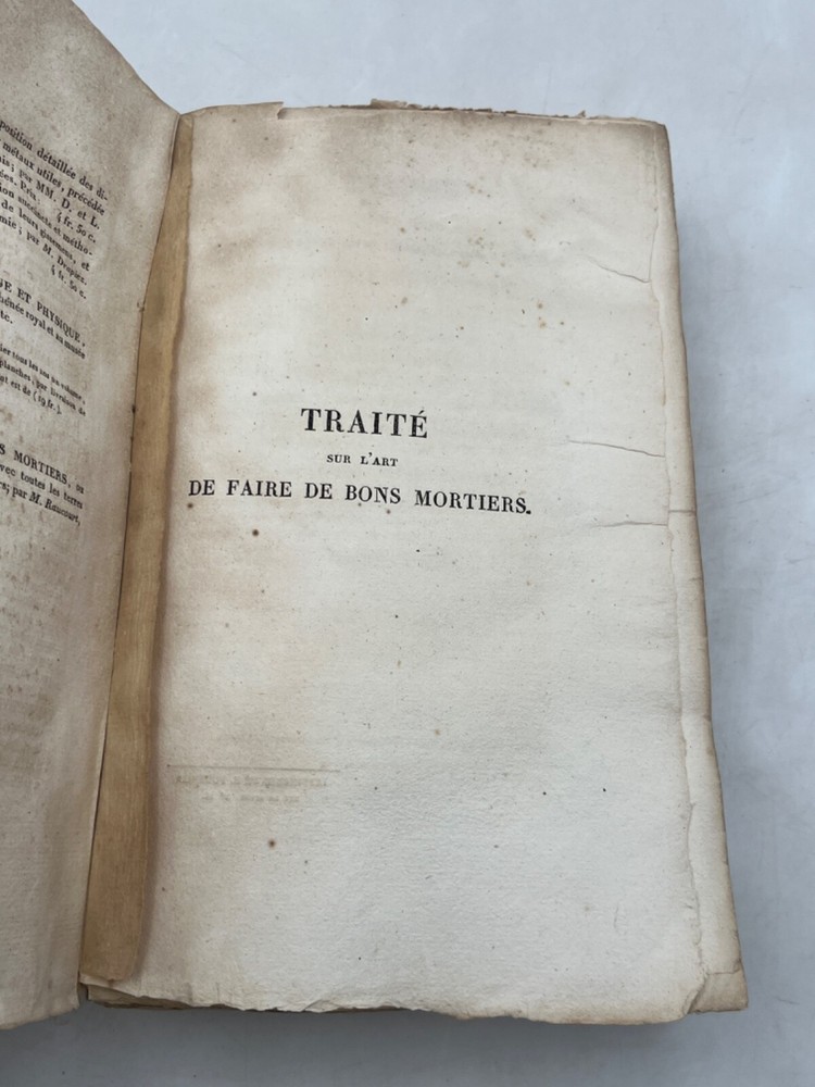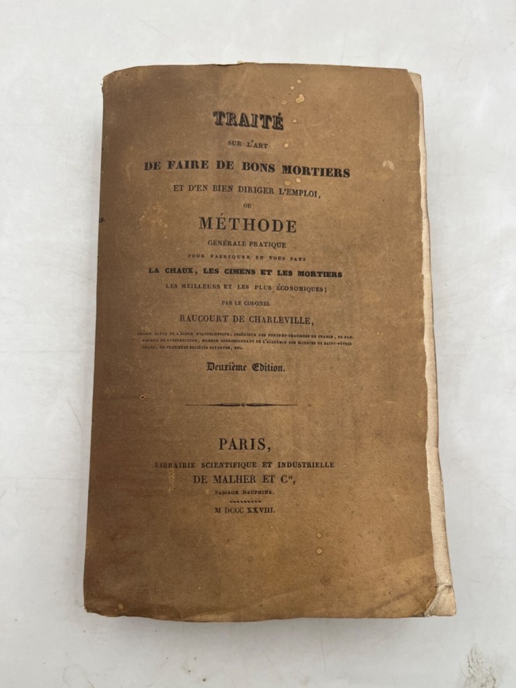 Traité sur l’art de faire de bons mortiers et d’en bien diriger l’emploi, ou Méthode générale pratique pour fabriquer en tous pays la chaux, les cimens et les mortiers les meilleurs et les plus économiques ; Par le Colonel Raucourt de Charleville, Deuxième Édition. Paris. Deuxième édition du Traité sur l’art de faire de bons mortiers de Raucourt de Charleville, publiée en 1828 à Paris chez Malher et Cie. Cet ouvrage technique offre une méthode générale et pratique pour la fabrication de chaux, ciments et mortiers, avec des recommandations pour obtenir des matériaux à la fois durables et économiques. L’auteur, ingénieur polytechnicien et membre distingué de sociétés savantes, met son expertise au service des bâtisseurs et ingénieurs du XIXe siècle, alors en pleine ère de modernisation des techniques de construction. Y11