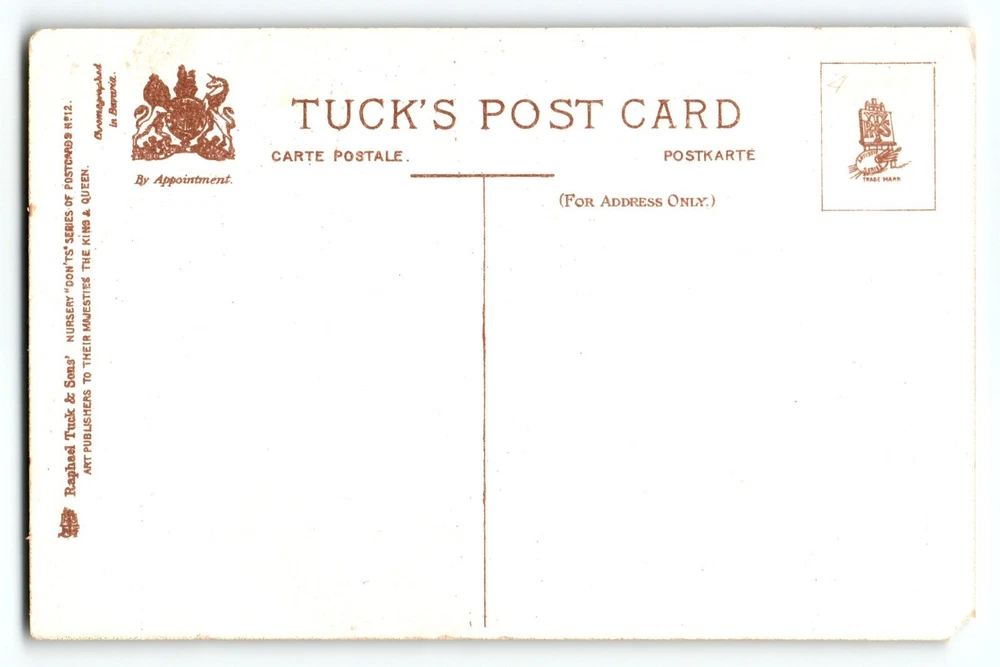 Theme: Art, Children & Infants, Fantasy, Greetings, Holiday, Child Country/Region of Manufacture: Germany Unit of Sale: Single Unit Year Manufactured: 1908 Original/Licensed Reprint: Original Personalize: No Features: Divided Back Time Period Manufactured: 1900-1919 Signed: No Size: Standard (5.5 x 3.5 in) Postage Condition: Unposted Estado del artículo: Usado Custom Bundle: No Occasion: Valentine's Day Type: Printed (Lithograph) Era: Pre-War (Pre-1914) Material: Paper Brand/Publisher: Raphael Tuck & Sons Subject: Nursery Don'ts Number of Items in Set: 1 Artist: Unknown