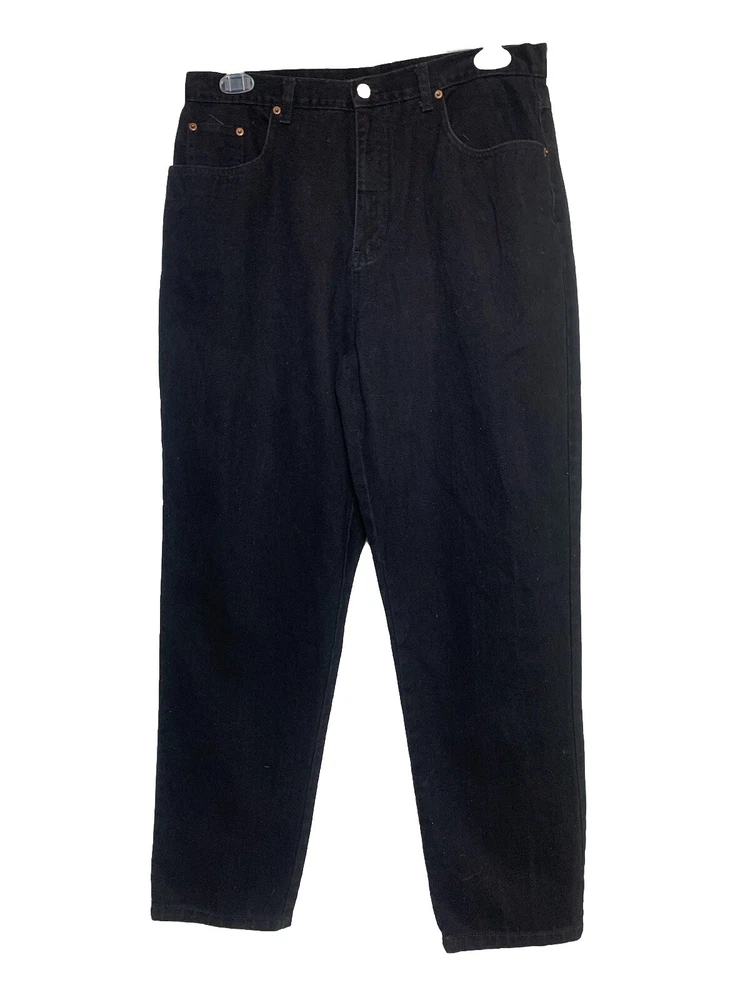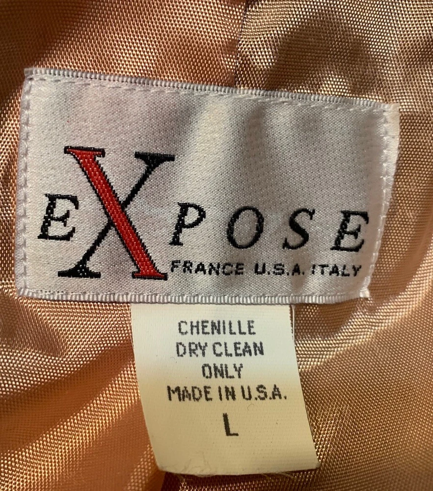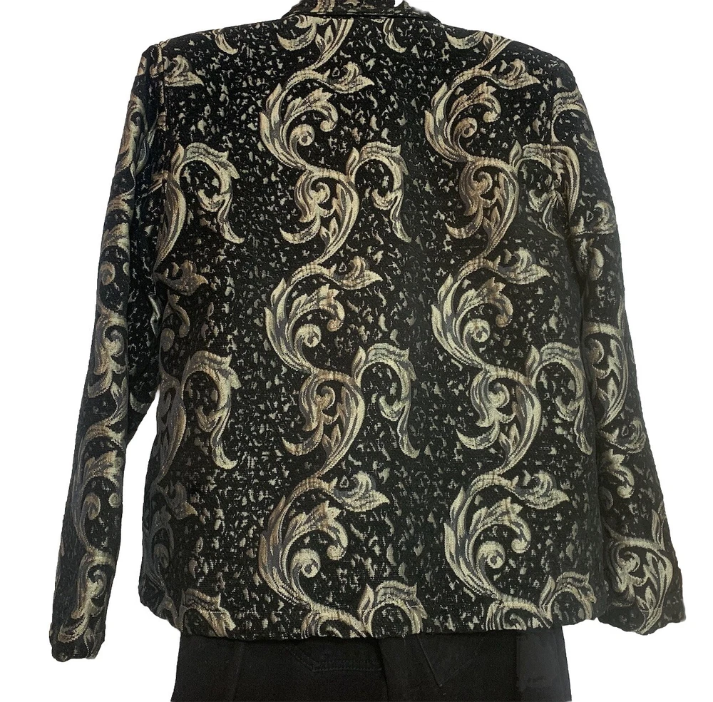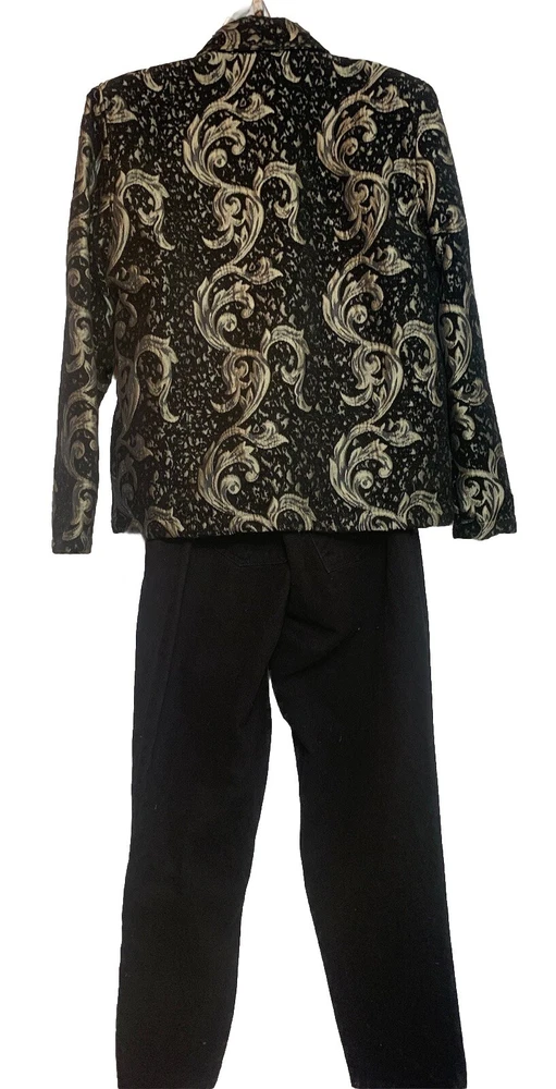 This 2-piece outfit from Expose and Bill Blass is a classic addition to any wardrobe. The jacket is made of a lightweight and breathable chenille that is paisley print black & gold.Total length 26”chest 44”long sleeves 24”The mom jeans are black brushed cotton fabric,which makes them comfortable to wear all day long.Size 16 waist 34”inseam30”This outfit is perfect for anyone who wants to look stylish and feel comfortable.