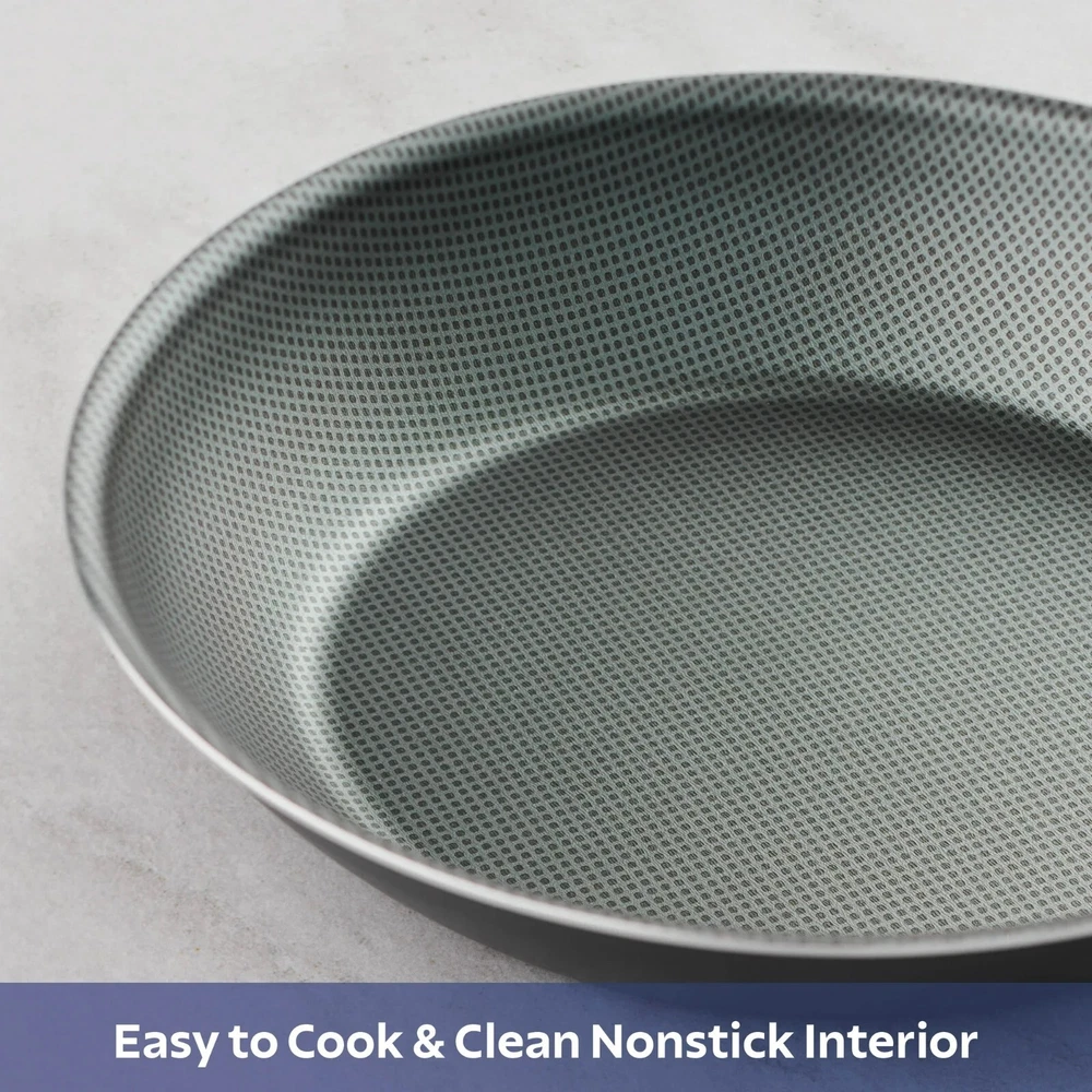 About this item Tramontina PrimaWare 18-Piece Nonstick Cookware Set: Patterned gray interior non-stick coating for easy cooking and cleaning Riveted, stay-cool handles Heat- and shatter-resistant tempered glass lids allow easy monitoring of cooking progress Dishwasher-safe Compatible with gas, electric and ceramic glass cooktops Set includes: 8" saute pan 9" deep saute pan 11" griddle 1 qt sauce pan with lid 2 qt sauce pan with lid 3 qt sauce pan with lid 4 qt Dutch oven with lid (4 qt lid fits the 9" deep saute pan) Stainless steel foldup steamer Solid spoon Slotted spoon Solid turner Slotted turner Pasta spoon Ladle