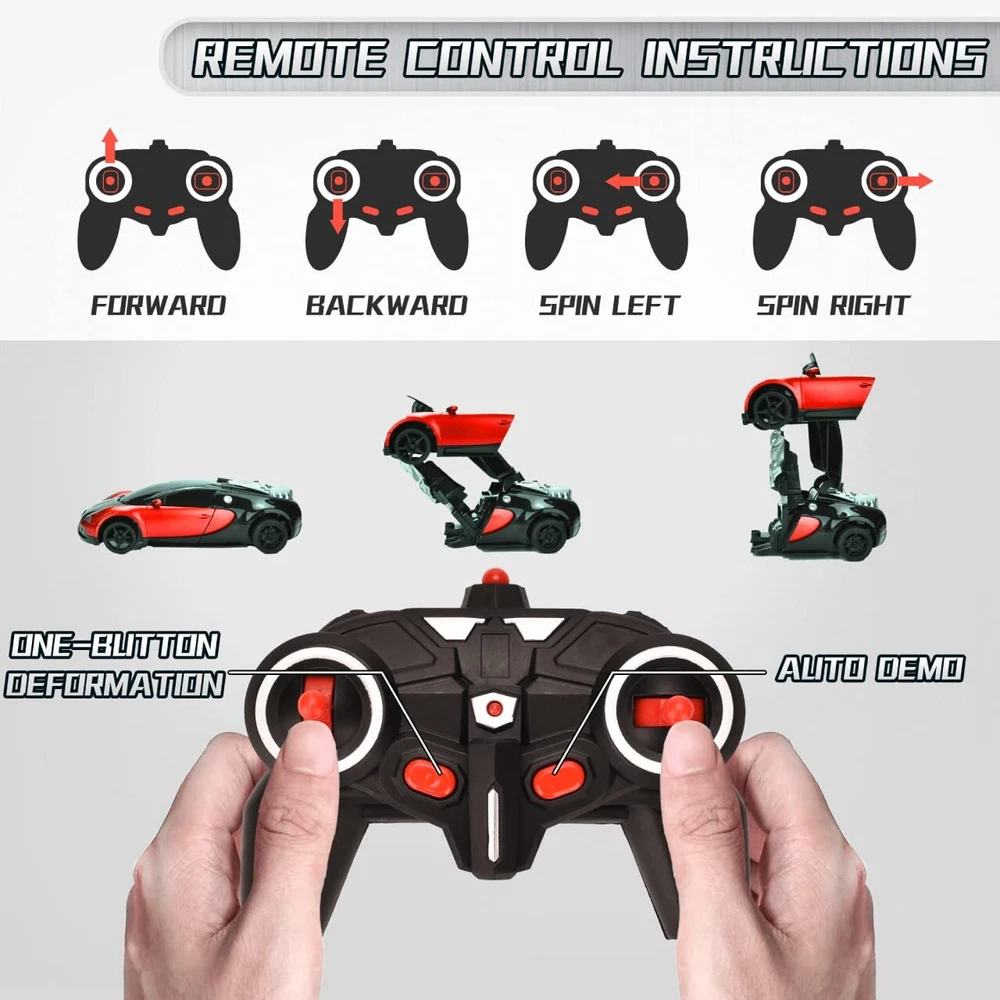Give a surprise With more ways to play, keep young occupied for hours, help your develop their coordination, hand-eye combination,and the sense of direction. Controllable exciting sound, if you don't love the music, press the auto demo button about 3 seconds to turn on/off music. Transforming Robot Warrior Remote Control Sports Car 1/14 Scale Specifications: Robot Dimension: 9"(L) x 3"(W) x 10"(H) Car Dimension: 11"(L) x 5"(W) x 3"(H) Material: ABS Plastic Robot Battery Type: Rechargeable (included) Remote Battery Type: (2) AA (not included) Distance Control: 80-100 meters Run Time: about 35 min Recommended for ages: 6+ years Package Includes: 1 x RC Transform Car 1 x Remote Controller 1 x USB Charge Cable 1 x Rechargeable battery (Please charge for at least 8 hours for the first 2 times.) Warm Tips: 1.Please remove the batteries from the remote controller if not in use for a long time. 2.Requires 2 x AA batteries for remote controller (NOT INCLUDE). 3.The RC cars robot contains small parts, small age must play under adult supervision. 🚕Induction & button deformation: Interesting way to play.It can deform from car to robot when you press the button on the controller or with your hand to sense. Cruise down the streets in a drifting sports car or man the battlefield with an intergalactic robot. This will surprise the . 🚗Realistic RC Cars: Realistic Engine and acceleration sound. It has 5 smooth wheels and could Super Fast Drifting 360° turn in both robot and car. 🚓key auto demo: Controller toggles for forward, backward, left and right, button deformation, key auto demo - After pressing the demo button, accompanied by the exciting music, it will presenting you wonderful shows. ♻Safety: 100% harmless plastic and electronic elements. Car body with environmentally friendly anti-fall material, strong and resistant to fall, to deal with a variety of barbaric children's operation. 🎁Great Gift: 2.4Ghz Strong Transmitter system, dynamic music, creative rc cars for . Great as a birthday or festival gift. Keep your children away from computers, mobile phones, and TV, improve their coordination and thinking skills.