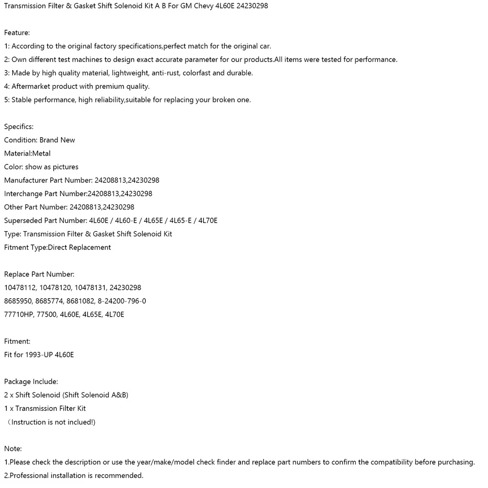 You may also like 1×Right Side Rear Lower Tail light Reverse Lamp Bumper Light For Audi Q5 09-2015 81.99 USD Free shipping Driveshaft Carrier Bearing and U Joint Kit For Ford F250 F350 Superduty 4WD USA 52.99 USD Free shipping Accumulator Plate Kit W/Cover & Bolts For GM 4L80E 4L80-E 15.99 USD Free shipping 10PCS Snow Tire Chain Anti-Skid Belt Car Truck SUV Emergency Winter Driving 11.69 USD Free shipping Union Jack WING Mirror Cover for MINI Cooper R55 R56 R60 Power Fold Mirror Z USA 32.65 USD Free shipping Timing Chain Kit Fits 2010-2015 Land Rover LR4 Range Rover 3.0L 5.0L V8 DOHC USA 99.99 USD Free shipping SAFE & SECURE SHOPPING 100% SATISFACTION GUARANTEED FAST SHIPPING Store Categories Store Categories Other eBay Motors Honda Toyota Ford Chevrolet Audi Mercedes-Benz Dodge Jeep You may also like Transfer Case Shift Motor 68267195AA for Jeep Renegade 15-20 Fiat 500X 16-21 154.99 USD Free shipping Stainless Steel 3.5 Inch Intake Horn for GM 6.6L Duramax 2020-2022 L5P 130.99 USD Free shipping 4PCS Side Feed Fuel Injector Repair Kit Filters Seals O-Rings Pintle Caps 44.69 USD Free shipping Left&Right Windshield Cowl Cover For Mini Cooper R55 R56 R57 2007-2015 148.69 USD Free shipping Ascher Ashtray Front LHD 5M1857309B For GOLF PLUS TIGUAN 84.69 USD Free shipping Front Bumper Grille Grill For Mercedes Benz GLC X253 C253 2015-2019 Gloss Black 322.7 USD Free shipping Transmission Filter & Gasket Shift Solenoid Kit A B For GM Chevy 4L60E 24230298 Product Description Transmission Filter & Gasket Shift Solenoid Kit A B For GM Chevy 4L60E 24230298 Feature: 1: According to the original factory specifications,perfect match for the original car. 2: Own different test machines to design exact accurate parameter for our products.All items were tested for performance. 3: Made by high quality material, lightweight, anti-rust, colorfast and durable. 4: Aftermarket product with premium quality. 5: Stable performance, high reliability,suitable for replacing your broken one. Specifics: Condition: Brand New Material:Metal Color: show as pictures Manufacturer Part Number: 24208813/24230298 Interchange Part Number:24208813,24230298 Other Part Number: 24208813,24230298 Superseded Part Number: 4L60E / 4L60-E / 4L65E / 4L65-E / 4L70E Type: Transmission Filter & Gasket Shift Solenoid Kit Fitment Type:Direct Replacement Replace Part Number: 10478112, 10478120, 10478131, 24230298 8685950, 8685774, 8681082, 8-24200-796-0 77710HP, 77500, 4L60E, 4L65E, 4L70E Fitment: Fit for 1993-UP 4L60E Package Include: 2 x Shift Solenoid (Shift Solenoid A&B) 1 x Transmission Filter Kit (Instruction is not inclued!) Note: 1.Please check the description or use the year/make/model check finder and replace part numbers to confirm the compatibility before purchasing. 2.Professional installation is recommended. About Us Shipping Terms Returns Contact Us About Us VIPIH is one of the international leading distributors specialized in distribution of auto spare parts of the world’s prime auto part suppliers on a global scale with the full responsibility in procurement, shipping, sales and marketing and after sales service. VIPIH fulfills all needs of its clients completely and on a timely basis with the know-how it has built up since it was established and the comprehension knowledge of the sectors standards. The perfectionist approach in product quality, high service availability, strict principle of business follow-up, reliability and the good reputation which has gained strength as a result of customer satisfaction are the most striking components of VIPIH ’ s success. VIPIH is presently capable of supplying all demands for auto parts from the gear box to turbo hoses in a wide range. Free delivery with worldwide shipping options available. If can not locate what you need then please get in touch! Shipping Shipping Terms International Buyers – Please Note: 1. Import duties, taxes and charges are not included in the item price or shipping charges. These charges are the buyer’s responsibility. 2. Please check with your country’s customs office to determine what these additional costs will be prior to bidding/buying. 3.Buyers' Information: We strive our best to provide you the most reliable, affordable way of shipping service. But sometimes international delivery is highly depended on the courier company and local customs/duties. If you do not receive your item on time, please sent us ebay message immediately for further assistance. Thank you for your understanding. Terms We stand behind everything that we sell and will do everything possible to assure you are satisfied. When you receive your purchase if you are not 100% satisfied, please sent me ebay message and we will do our best to make you happy. If you still want to return your purchase, simply ship the item(s) back to us and we will refund your original purchase price and the original shipping charge. Buyers are responsible for the postal cost of returning the items. We must be notified of the intent to return your item within 30 days of receiving the item. Items returned must be in the same condition that they were received. How to return 1,Please ask us for return address . 2,Shipping back the package . The RMA#(Return Merchant Authorization Number = Your ebay ID) must be clearly written on the return package ,Otherwise the package will be refused. 3,Sent us the return tracking number. 4,All returns will be inspected prior to a credit being issued. Returns 1:Returns are accepted within 60 days of purchase. 2:All returned items MUST BE in the original packaging. 3:We will be happy to assist you if if any item needs to be returned or replaced 4:Please don't open a return request before contacting us first to solve, many thanks. Contact Us If you have any questions, our Customer Service staffs welcome you to sent me ebay message. We strive to answer all questions and resolve any problems as quickly as possible. Business Hours: Monday-Saturday 9:00-17:00 Copyright © 2022 