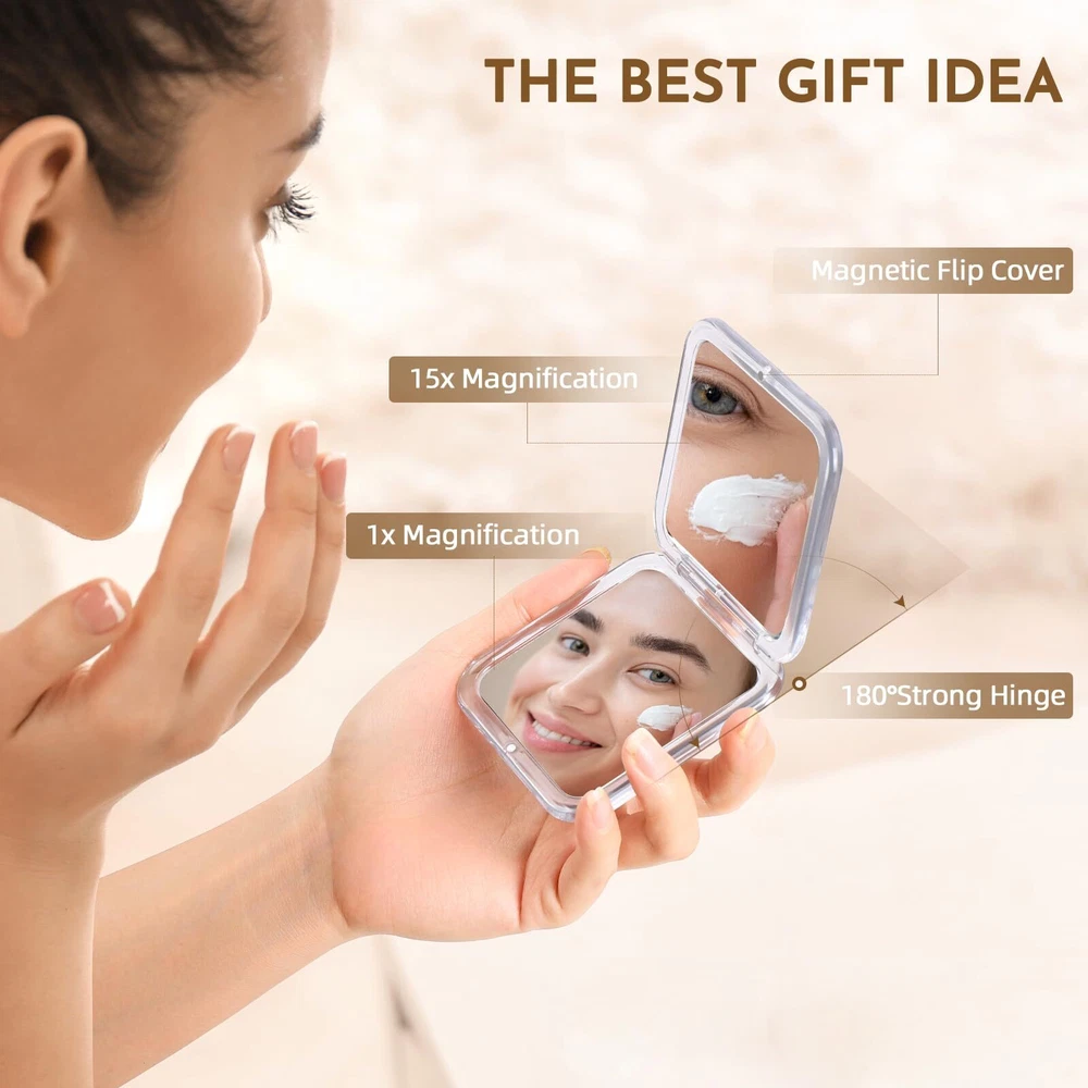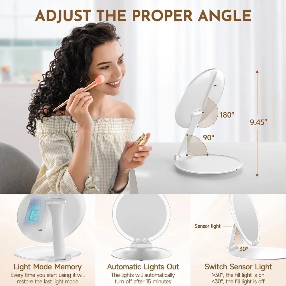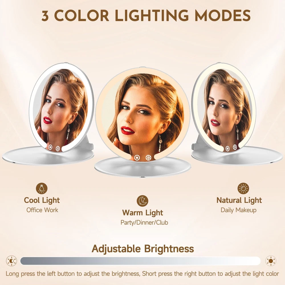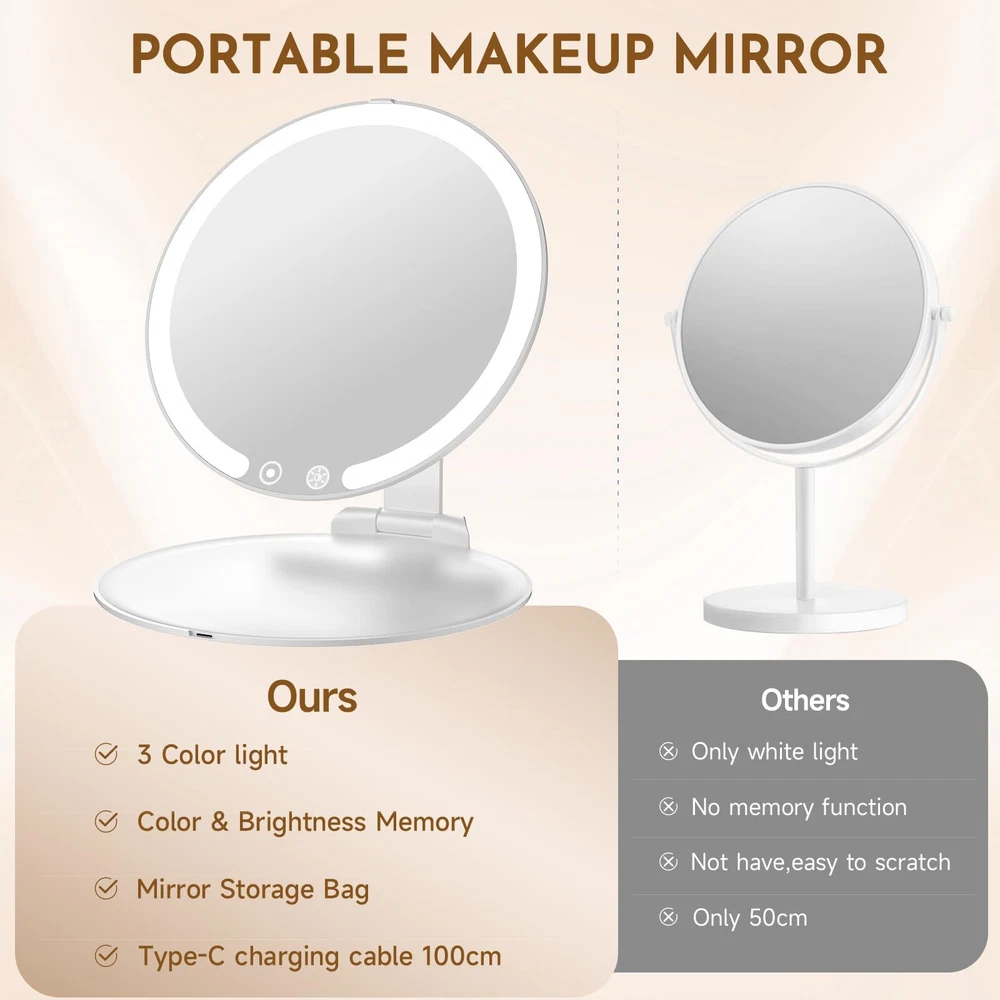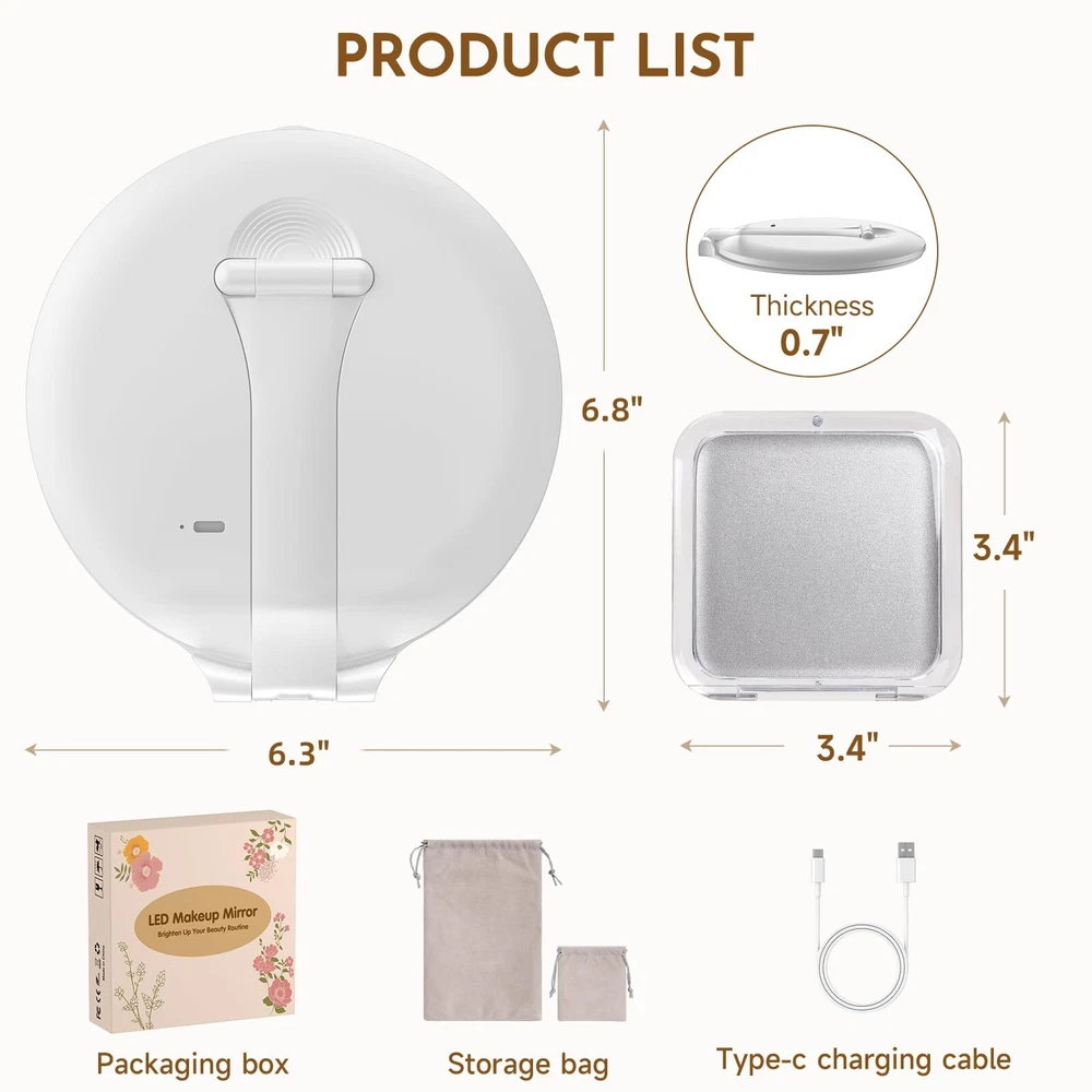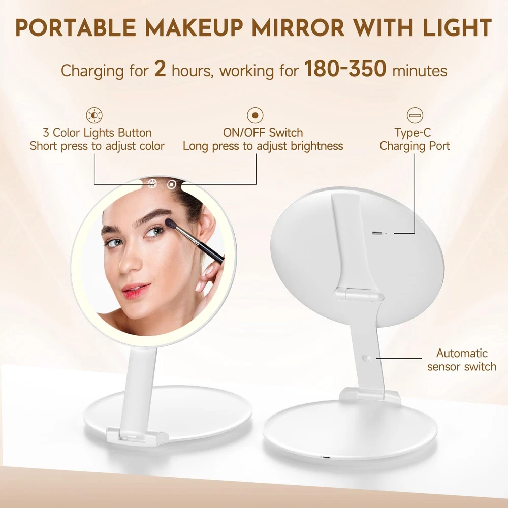 【3 Light Colors and Dimmable Travel Mirror】: This travel makeup mirror with light provides three light color options and dimmable function. You can choose white light, natural light or warm light according to your needs, and adjust the light brightness. Whether it is during the day, night, party or office, it can meet your different makeup and skin care needs and get the best makeup effect. 【Portable Rechargeable Makeup Mirror】: Compact and foldable, this travel vanity mirror is 7.5*5.1 inches and weighs only 0.62 Ib. It comes with a velvet bag for protection and easy portability. Suitable for handbags, backpacks, or luggage during travel, parties, or daily errands. The portable mirror with lights for makeup takes 2 hours to charge and offers 180-300 minutes of use. Equipped with a Type-C charging interface and a 1-meter cable, it's convenient for use at home or while traveling. 【Adjustable Height & Sensor Switch】: This travel lighted makeup mirror is equipped with a 90° adjustable stand, and the mirror can be rotated 180°. You can flexibly adjust the height and angle of the mirror as needed to enjoy a more comfortable experience. The stand of the mirror comes with an intelligent sensing system. When the mirror is raised at an angle greater than or less than 30°, the light will automatically turn on/off. 【Energy-Saving Design & Memory Function】: This travel light up mirror for makeup is equipped with an automatic shut-off function after 15 minutes of no operation to ensure energy saving. Its memory function automatically saves the last brightness setting without repeated adjustments. 【Extra 15x Magnifying Mirror】: Extra equipped with a mini 15x magnifying mirror, allowing you to clearly observe details and easily complete fine makeup. This mini magnifying mirror is suitable for eyeliner, eyebrows, and lipstick; magnetic opening and closing allows 180° free rotation, making it easy to find your desired vanity mirror angle (Note: Mini 10x magnifying mirror without lights). 【100% After-Sales 】: This cosmetic mirror with light is an ideal gift for mothers, girlfriends, and wives, suitable for Christmas, Valentine's Day, Thanksgiving, Mother's Day, or other special occasions. We offer a 90-day return and exchange . If you have any questions about this led travel mirror, please feel free to us, and our team will be available 24/7 to assist you.