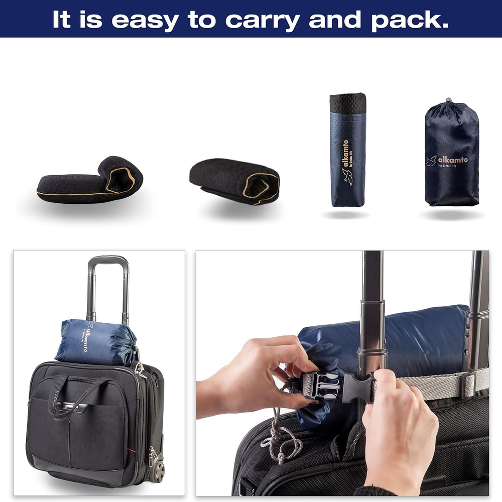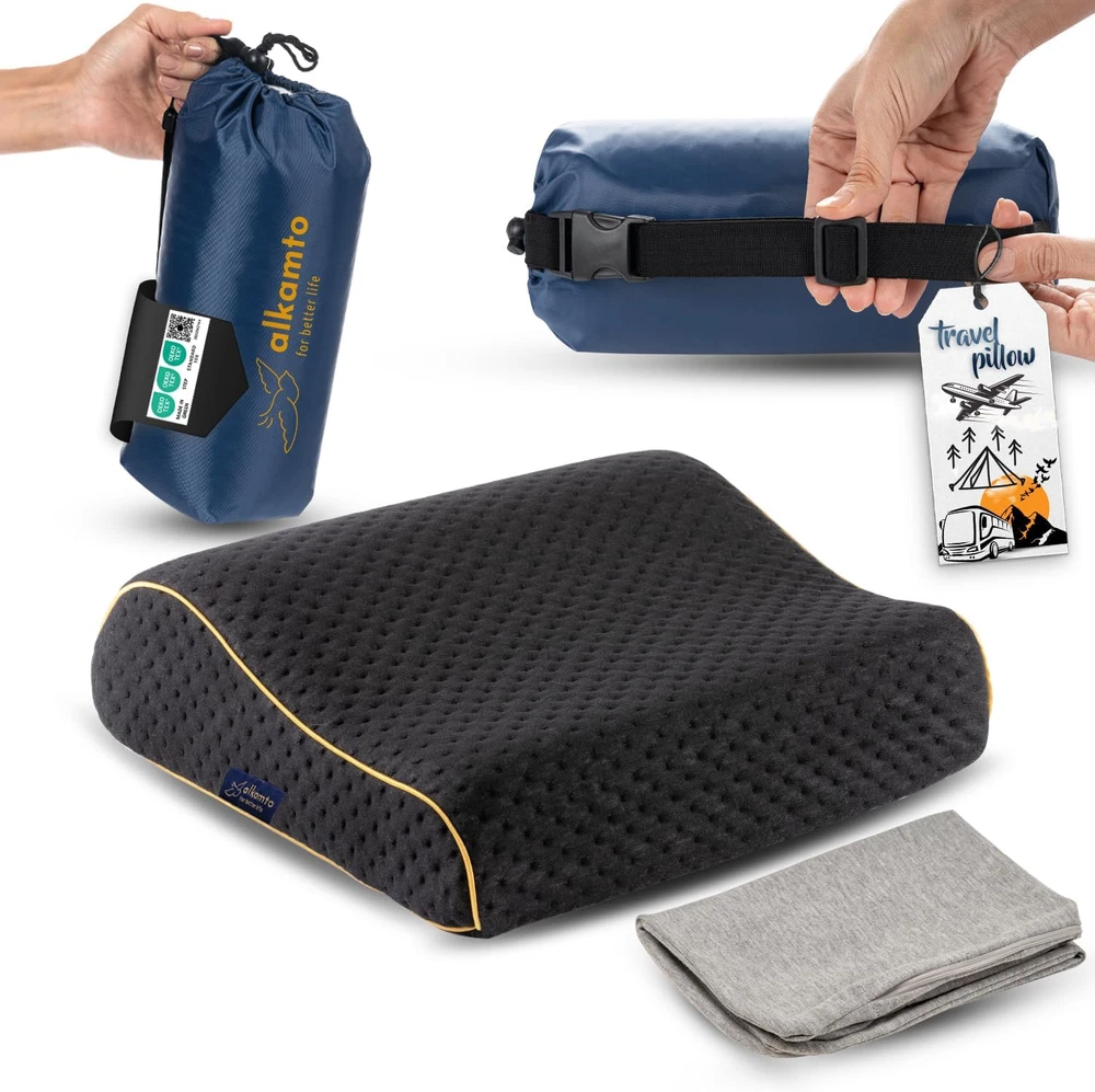 Memory Foam Pillow for Travel and Camping with Extra Cotton Cover – Easy to Carry Portable Bag (Black Contour) ✔ LIGHT & EASY TO PACK - Easy to carry pillow around for all kinds of trips (like camping / fishing / backpacking / hiking / beach / festival) its lightweight design and travel case. Compressible and self-inflatable, easily be fitted inside its compact and small travel bag and rises up to its full shape once taken out in a matter of seconds. Ideal to take on airplanes, trains and cars or for outdoor activities along other camping gear, hiking and travelling accessories. ✔ COMFORT LIKE AT HOME - Our specially developed luxury viscoelastic memory foam pillow adapts perfectly to the contours of your head and neck, giving you all the soft comfort and support of your home pillow while on your travels, even while staying at hotels. The square, flat shape is versatile, which ensures maximizing comfort and rest no matter the position. No more uncomfortable inflated / blow up pillows, and no more stiff neck or shoulder pain when waking up! ✔ PREVENTS SWEATING - Features ventilation holes, allowing fresh air to flow throughout the pillow and sweat to be drained from the surface - say goodbye to night sweats! ✔ HEAT REGULATING - The heat-regulating fibers in the cover provide heat management - dissipating heat when you are cold and draining it when you are hot - maintaining an ideal temperature throughout the night ✔ Made according to the OEKO-TEX standard with natural materials. Cover washable at 40 ° C ✔ Item Size: 13.7 x 11.8 x 3.9 / 3,14 inches. Packed size: 10.2 x 5.2 x5.2 inches Product Description LIGHT & EASY TO PACK - The Alkamto travel pillow The Alkamto travel pillow - travel relaxed, arrive relaxed! Regardless of whether you are traveling by car, plane or train, with the visco-elastic travel pillow Alkamto, you will never have to do without the usual sleeping comfort again. So you arrive relaxed and rested at your destination. Easy to carry pillow around for all kinds of trips (like camping / fishing / backpacking / hiking / beach / festival) its lightweight design and travel case with extra cotton cover. Compressible and self-inflatable, easily be fitted inside its compact and small travel bag and rises up to its full shape once taken out in a matter of seconds. Ideal to take on airplanes, trains and cars or for outdoor activities along other camping gear, hiking and travelling accessories SOFT - COMFORT- ERGONOMIC The travel pillow with extra cotton cover comes in a practical travel bag in which, rolled up to a handy 10.6 "long and 5.11" diameter, it hardly takes up any space in your luggage. Unpacked, the pillow takes a few minutes to measure 13.7 x 11.8 x 3.9 / 3,14 inches. It comes with extra cotton cover. The heat-regulating fibers in the cover provide heat management - dissipating heat when you are cold and draining it when you are hot - maintaining an ideal temperature throughout the night. It comes with extra cotton cover. ✔ It’s easy to carry pillow for all kind of trip with lightweight design, travel case and extra cotton cover. ✔ Compressible and self-inflatable, easily be fitted inside its compact and small travel bag and rises up to its full shape once taken out in a matter of seconds. ✔Our specially developed luxury visco elastic memory foam pillow adapts perfectly to the contours of your head and neck. ✔The square, flat shape is versatile, which ensures maximizing comfort and rest no matter the position. ✔Features ventilation holes, allowing fresh air to flow throughout the pillow and sweat to be drained from the surface. ✔It is soft and hypoallergenic ✔Cover washable at 40 °C ✔Cover: 65% Polyester 35% viscose outer cover (thermic fabric), 100% cotton inner cover, 97% cotton 3% Lycra extra cover. ✔Waterproof travel bag. ✔ Item Weight: 1.47 lb. ✔ Item Size: 13.7 x 11.8 x 3.9 / 3,14 inches ✔Packed size: 10.2 x 5.2 x 5.2 inches COMFORT LIKE AT HOME Our specially developed luxury viscoelastic memory foam pillow adapts perfectly to the contours of your head and neck, giving you all the soft comfort and support of your home pillow while on your travels, even while staying at hotels. The square, flat shape is versatile, which ensures maximizing comfort and rest no matter the position. No more stiff neck or shoulder pain when waking up! PREVENTS SWEATING Features ventilation holes, allowing fresh air to flow throughout the pillow and sweat to be drained from the surface - say goodbye to night sweats! Alkamto memory foam pillow is suitable for children and teenagers. Cover washable at 40 ° C. Item model number Travel Pillow Unit Count 1 Count Size Travel Age Range (Description) Adult Variety Memory Foam Pillow,Memory Foam Color Black Contour Pattern Solid Product Dimensions 16"L x 10"W Material Polyester, Rayon, Memory Foam, Cotton Country of Origin Turkey Fabric Type Cover: 65% Polyester 35% Viscose Outer Cover (Thermic Fabric) and 100% Cotton Extra Cover Item Weight 1.32 pounds Shape Rectangular Fill Material Memory Foam Model Name Memory Foam Pillow Number of Pieces 1 Special Feature Lightweight, Compressible, Removable Cover Product Care Instructions Machine Wash 10.0 "w x 16.0 "w. Weight: 1.32 lb Shipping from the USA All of our products are shipped from the USA, ensuring quick delivery to your destination. Payment We offer the following payment methods: PayPal, credit card, bank transfer, and eBay's secure payment system. Free Shipping & Free Returns Shipping within the USA is FREE. Additionally, any return is absolutely free for you. Risk-Free Purchase You have the option to return an item within 30 days without any justification. We cover the return shipping costs! Fast Shipping We ship immediately upon receipt of payment. Generally, the package is delivered within 2-3 days in the USA. If it takes longer, we will contact you. Quality and Costs Made in Europe, USA, China No customs fees or additional charges Total satisfa