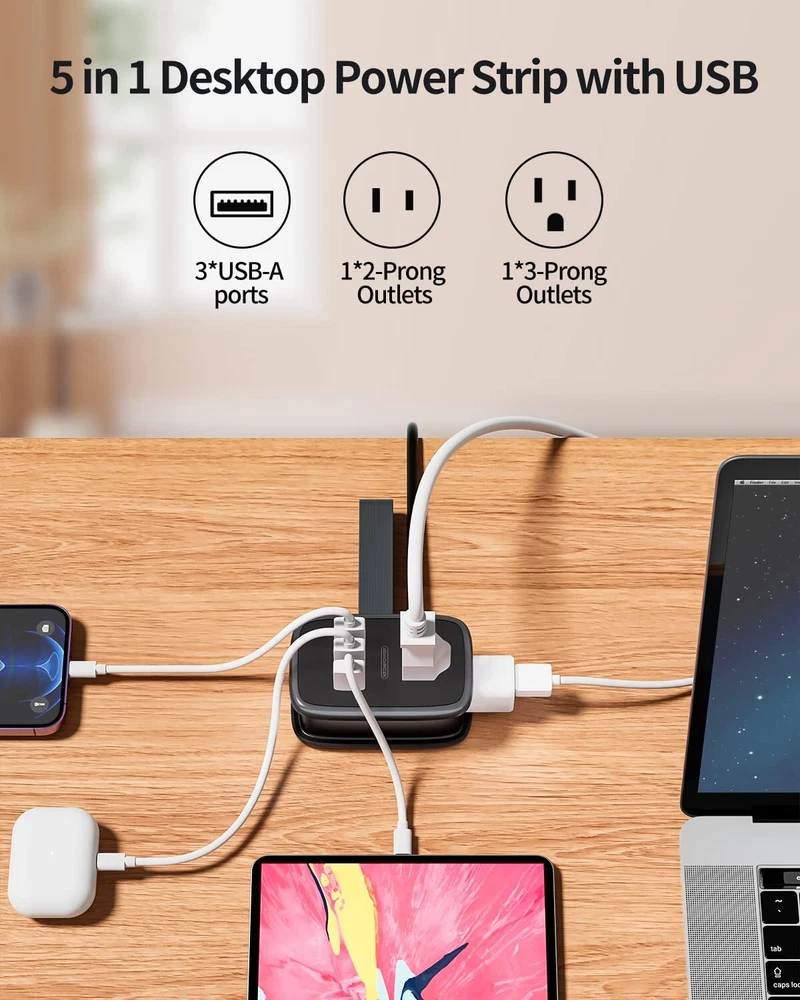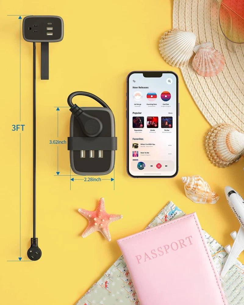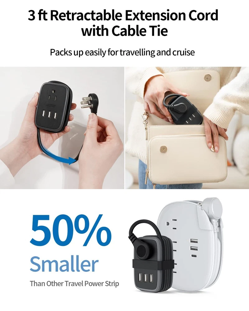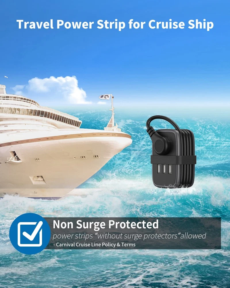 Specifications: USB power rating: 15.5W (5V 3.1A) USB port input: AC 100-240V 50/60HZ power rating: 1250W (125V 10A) Package contains: 1 x APP-4A3U-US Power Strip 1 x Service Card 1 x User Manual [Easy to Pack, Travel Essential]: Carry-on compact size With 3ft Wrap Around Cord. Lightweight mini power strip won’t weigh down your travel bag/luggage. Whether you're stuck at the airport and desperately need to charge your devices or need an extra few feet of power to reach the outlet when working remotely at the library or coffee shop, black extension cord has your power needs covered. [5-IN-1 USB Extension Cord with Multiple Outlets]: USB Power Strip turns one outlet into 5, including two 1 Prong outlets, two 1 Prong outlets, and 3 USB ports that will charge most smartphones, tablets, laptops, Bluetooth speaker and other devices. 1 Widely Spaced AC Outlets can accommodate larger power adapters, like oversized camera battery and charger plugs, without blocking the other outlets. [3FT Wrap-Around Flat Plug Extension Cord]: Flexible 3ft Retractable Extension Cord cleverly wraps around the body and plugs into a ac socket for neat storage. Ideal for travel and business trip, it is for maximum space-saving at home or in your travel bag. The added convenience of the handy space saver 45° right angle flat plug allows your furniture to sit flush to the wall - creating more space without bent wires. [Cruise Must Haves/Hotel Must Haves]: The small cruise power strip with NO SURGE PROTECTION, it's absolutely a must have Home and Cruise Ship accessories as Cruise lines require that power strips DO NOT have Surge Protection; Great for frequent traveler cruise ships, hotels, home where there are few unreachable outlets [FULL-ROUND PROTECTIONS]: The extension cord with multiple outlets is FCC & RoHS approved with high temp fireshield outer shell, ensuring complete protection against electrical short circuit, over heat, over charging, over current and over voltage